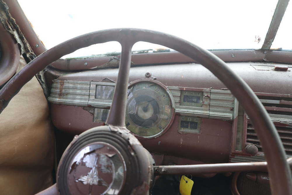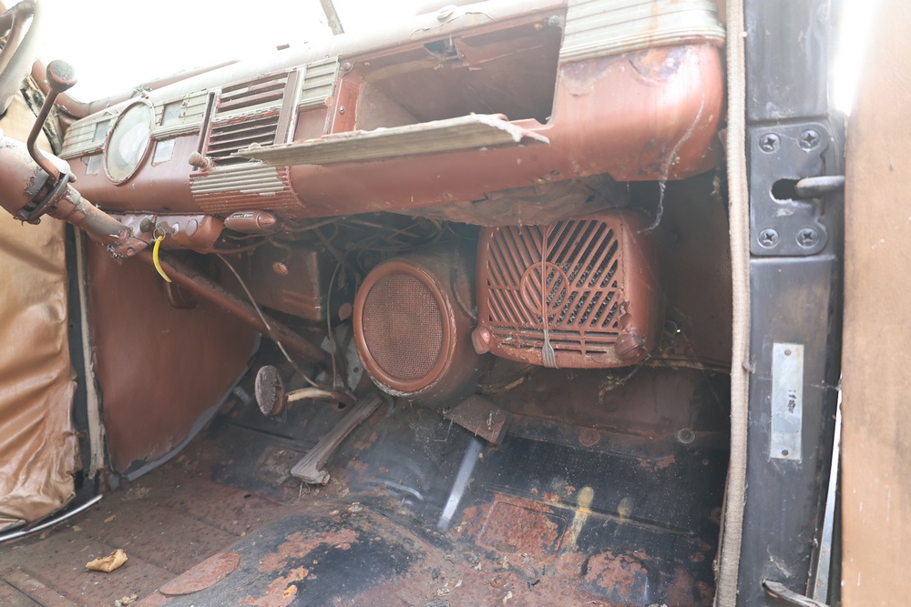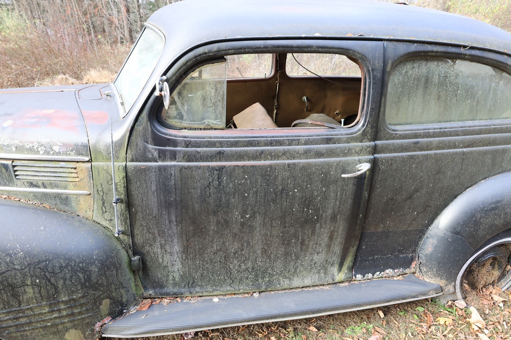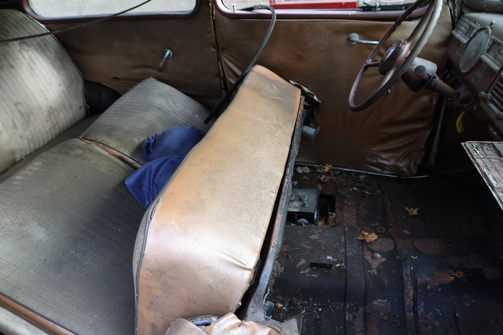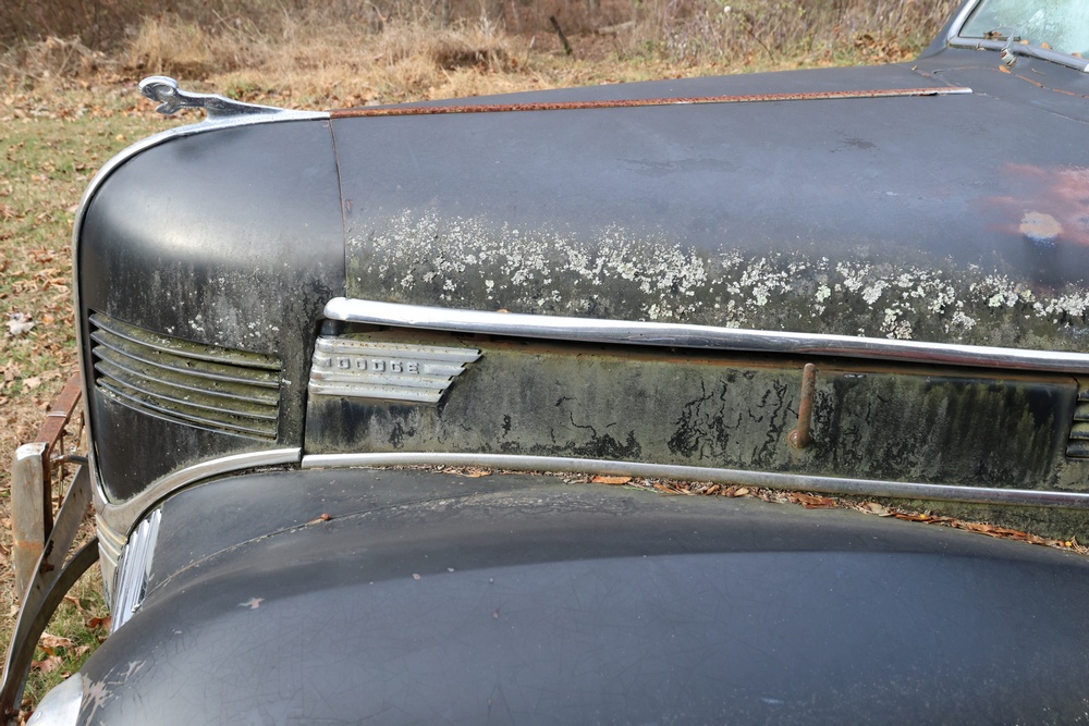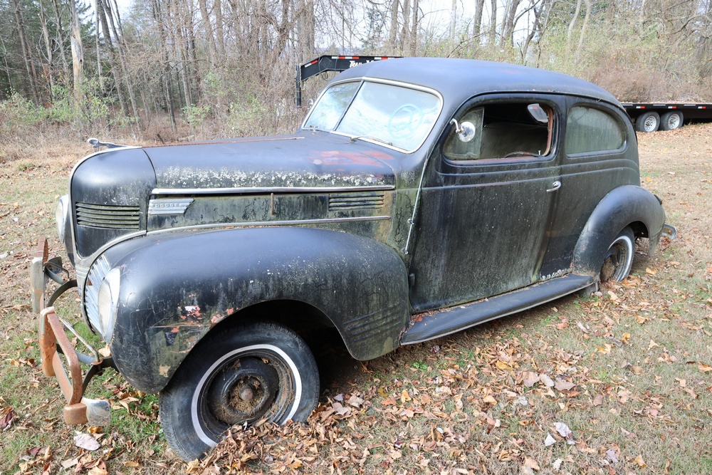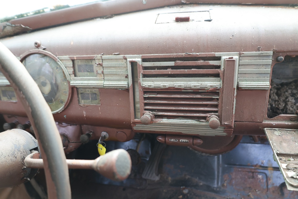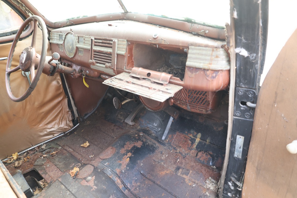 1938 Dodge two-door sedan. VIN: 46981. Odometer reading: not visible. The vehicle is not equipped with an engine or transmission. Interior features include a metal dashboard with Dodge-branded center grille, original gauge cluster, manual pedals, steering wheel, and partial interior trim. Title is available.