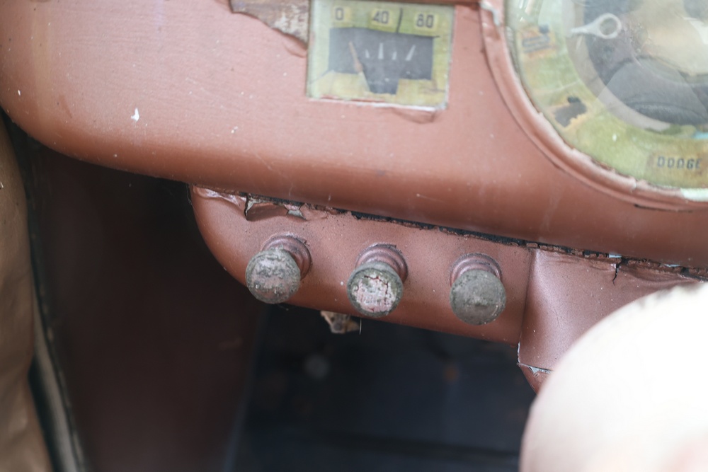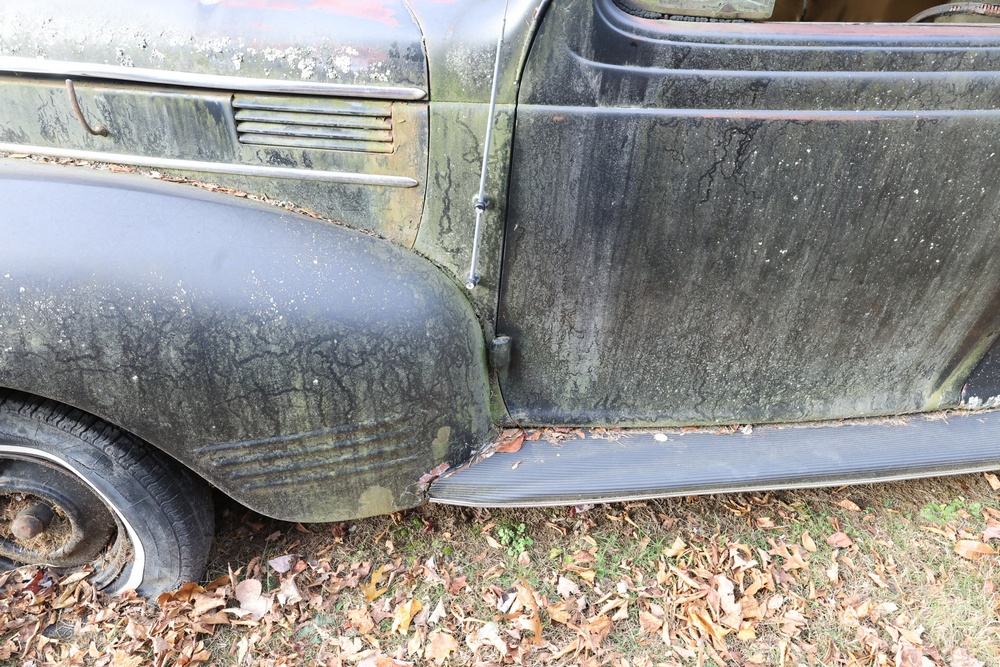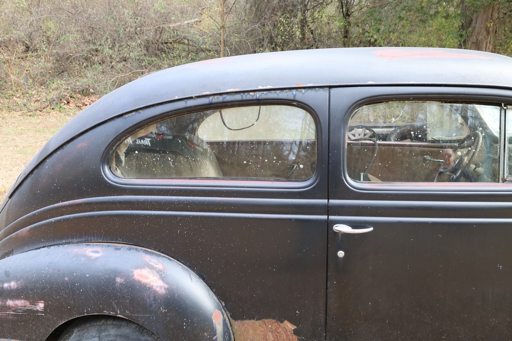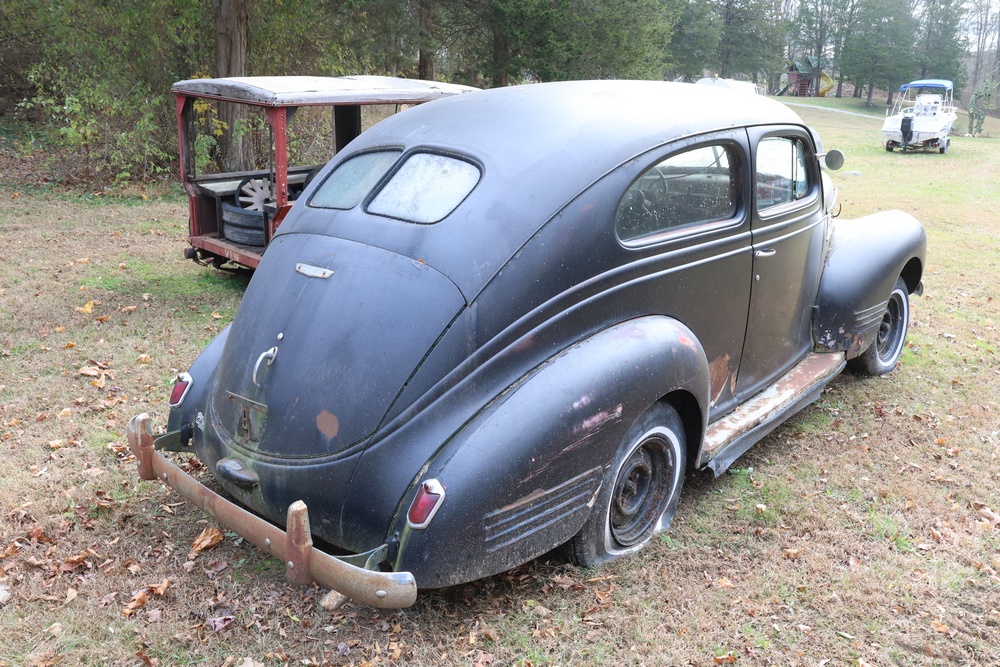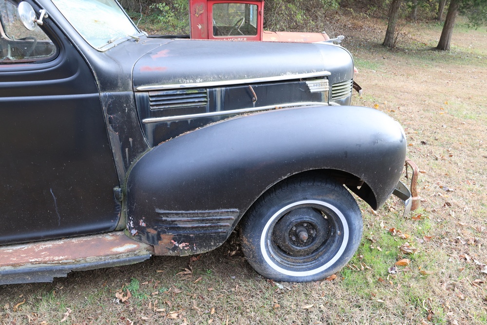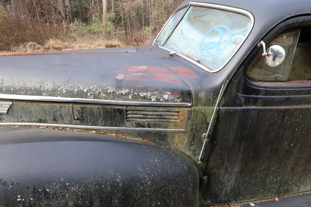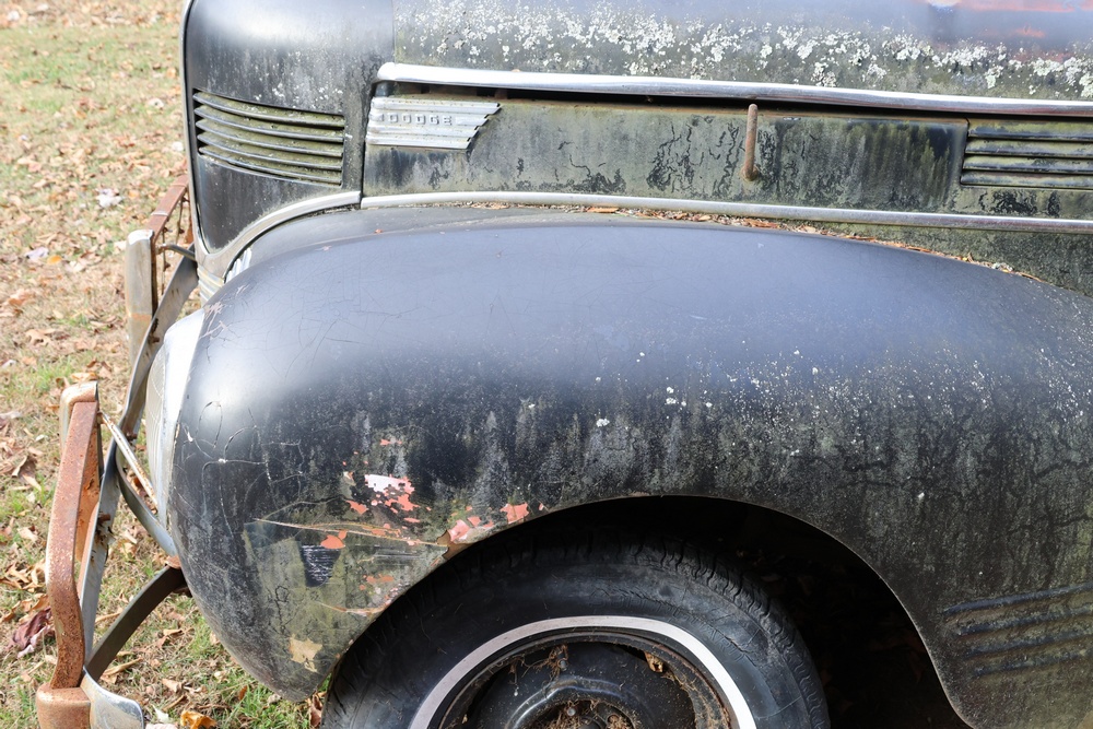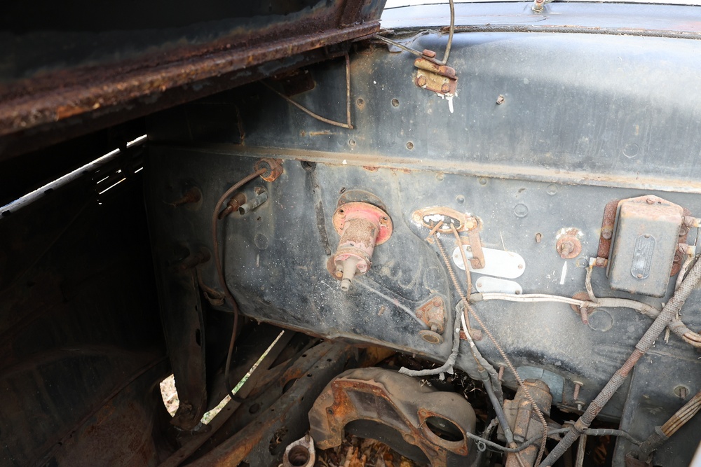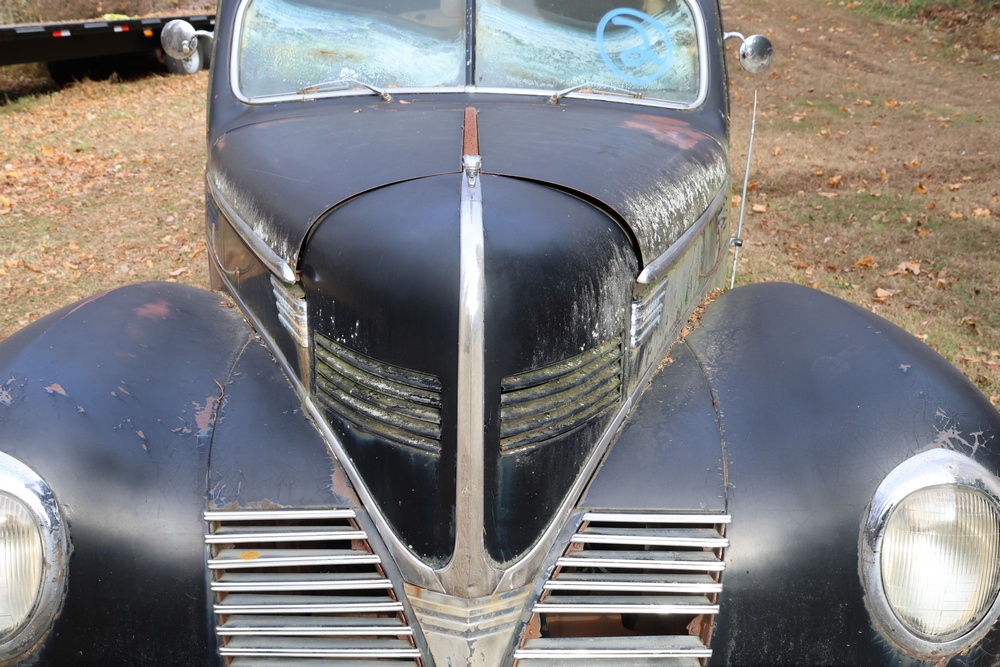 1938 Dodge two-door sedan. VIN: 46981. Odometer reading: not visible. The vehicle is not equipped with an engine or transmission. Interior features include a metal dashboard with Dodge-branded center grille, original gauge cluster, manual pedals, steering wheel, and partial interior trim. Title is available.
