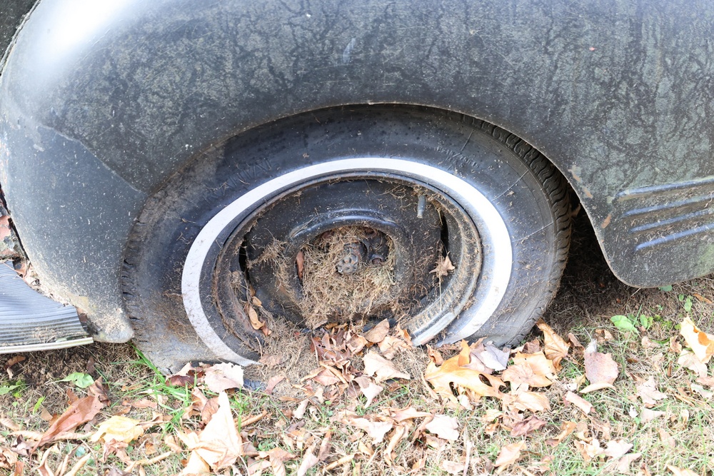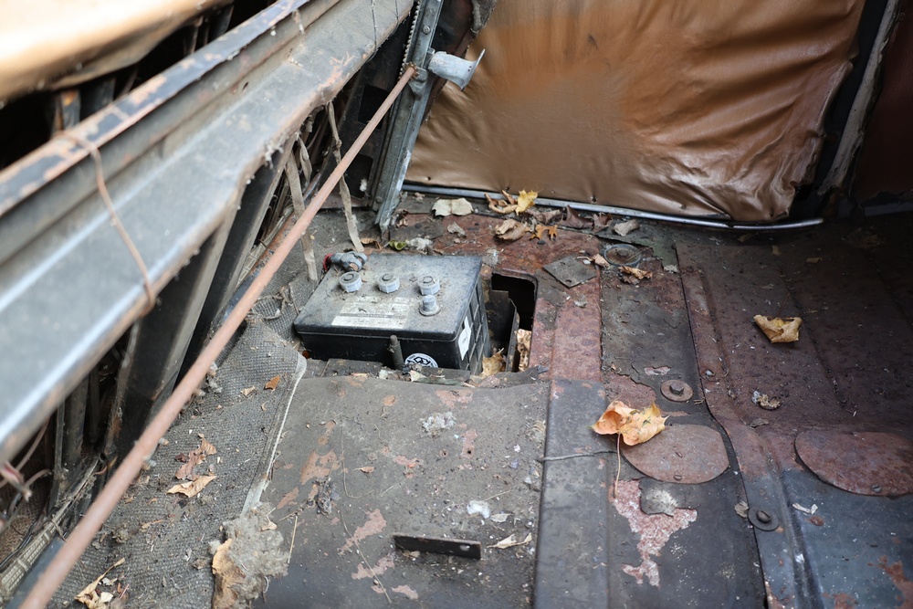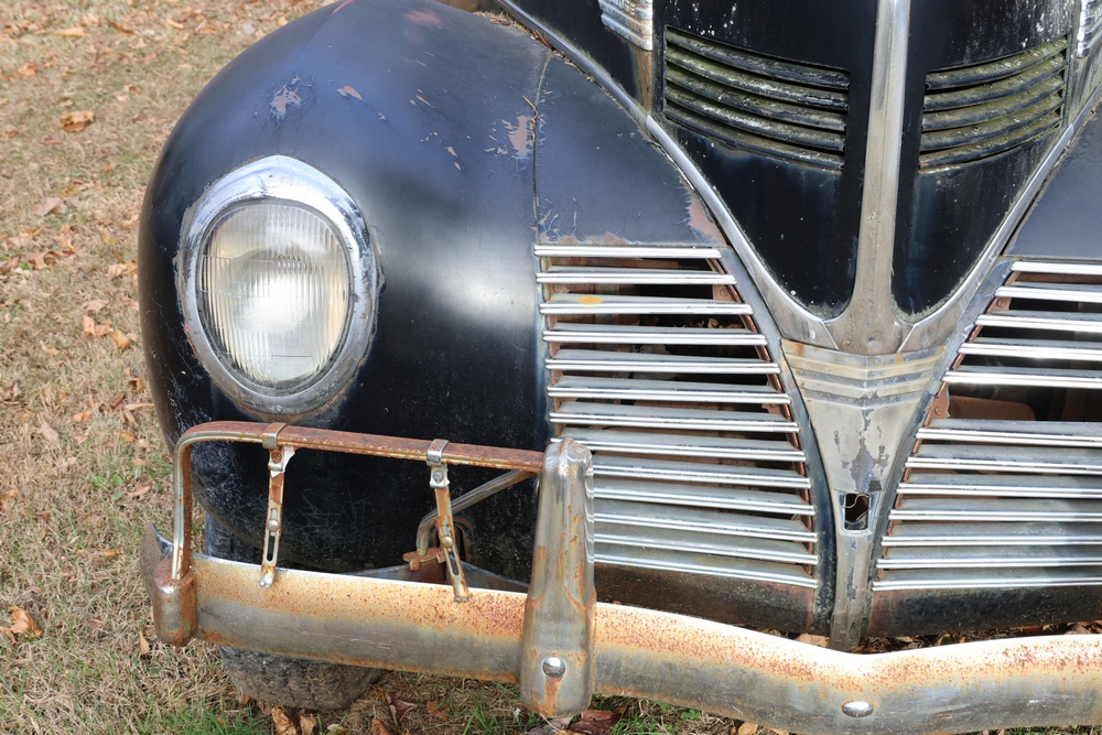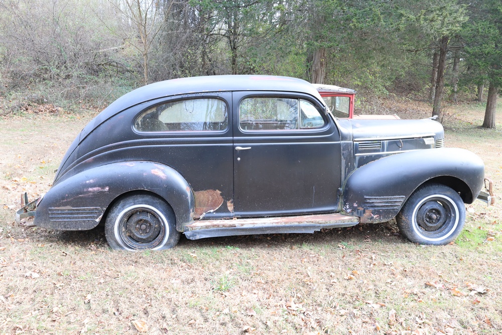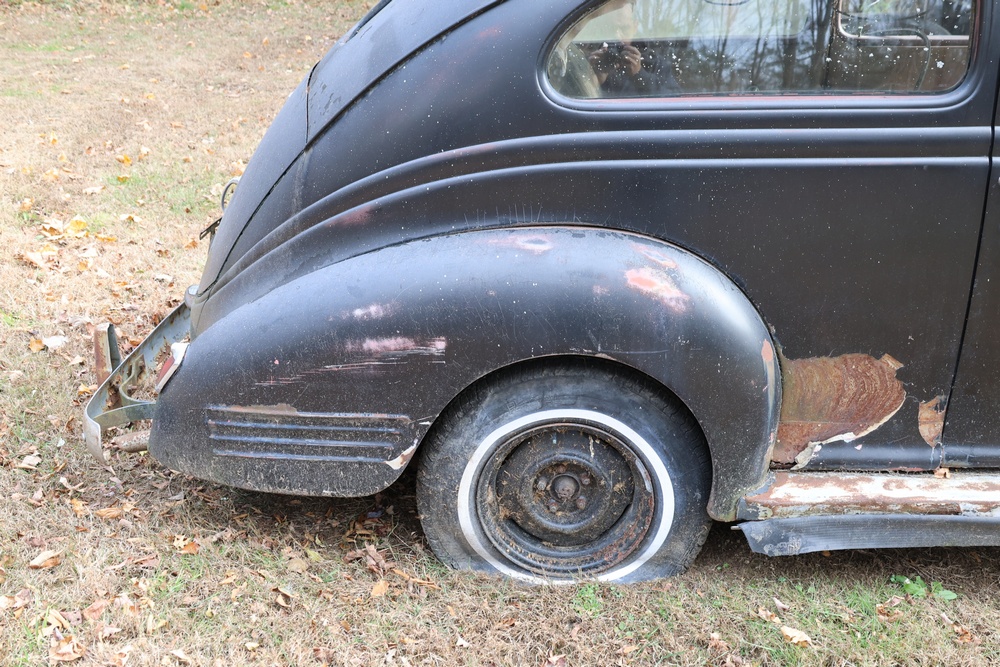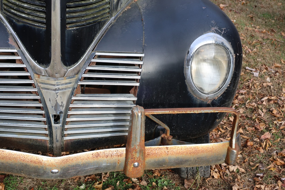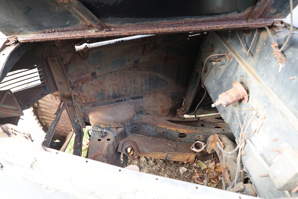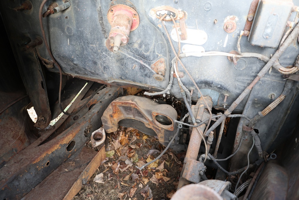 1938 Dodge two-door sedan. VIN: 46981. Odometer reading: not visible. The vehicle is not equipped with an engine or transmission. Interior features include a metal dashboard with Dodge-branded center grille, original gauge cluster, manual pedals, steering wheel, and partial interior trim. Title is available.