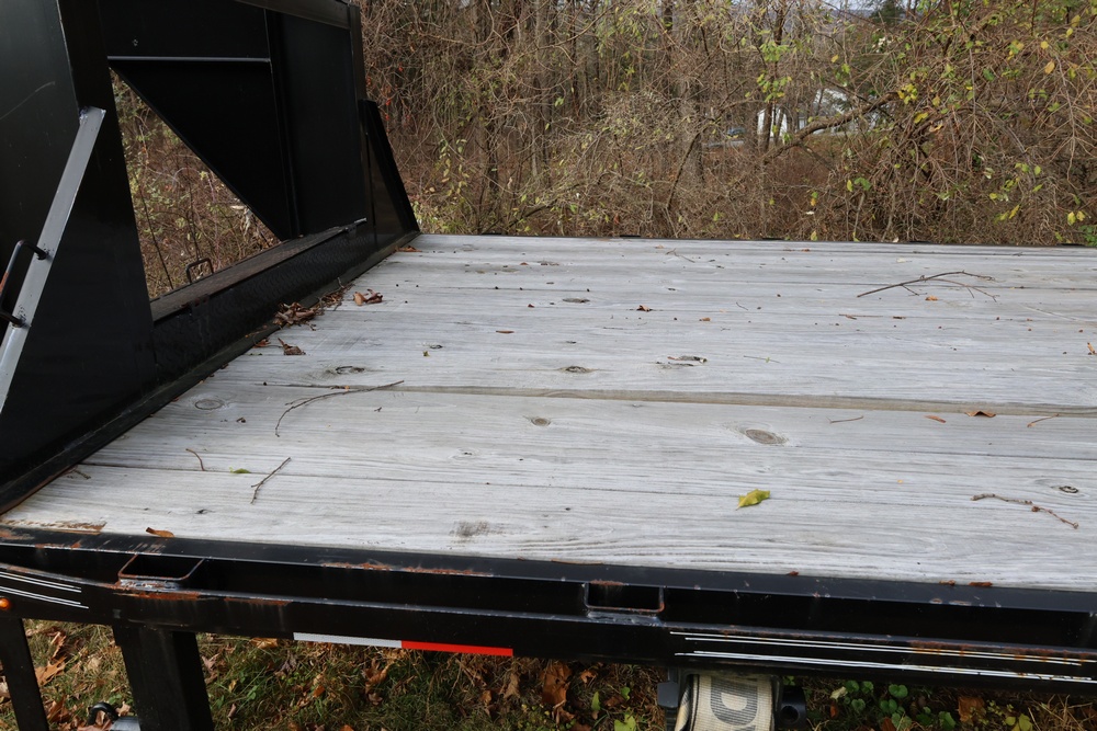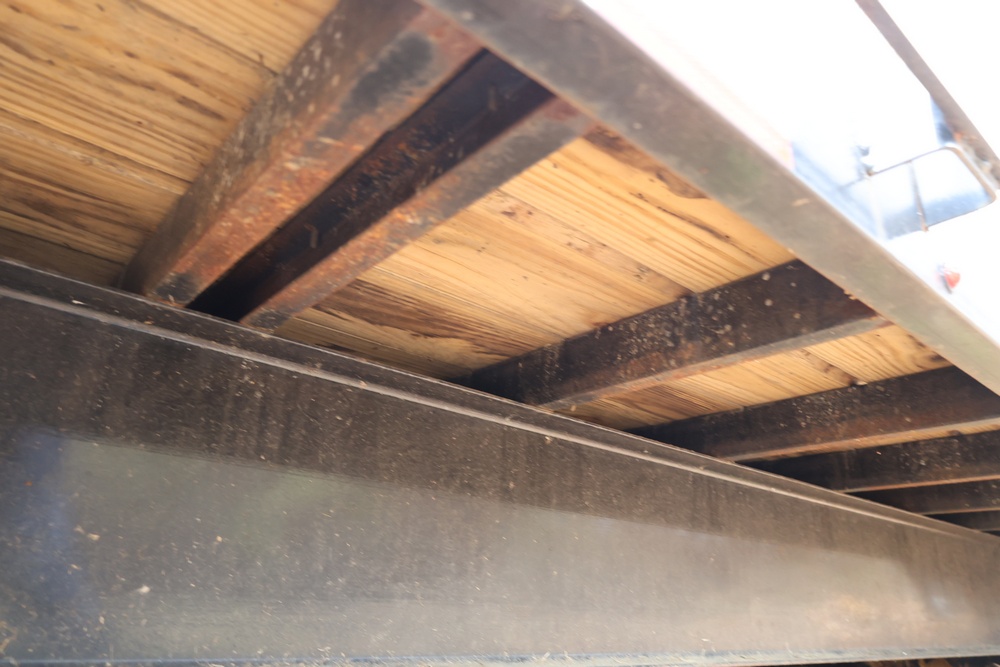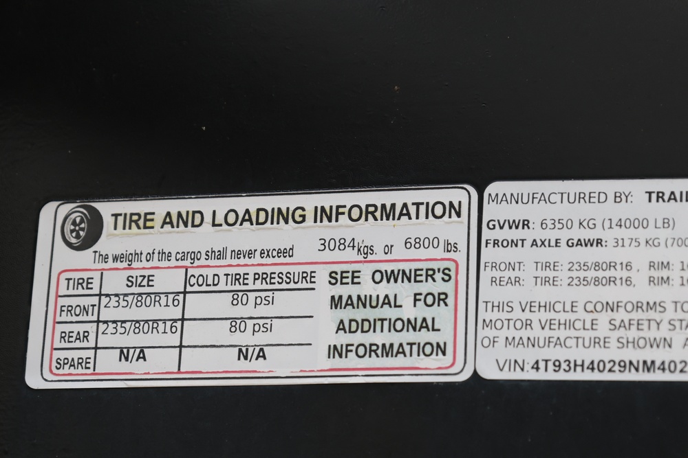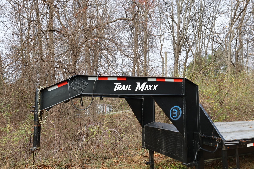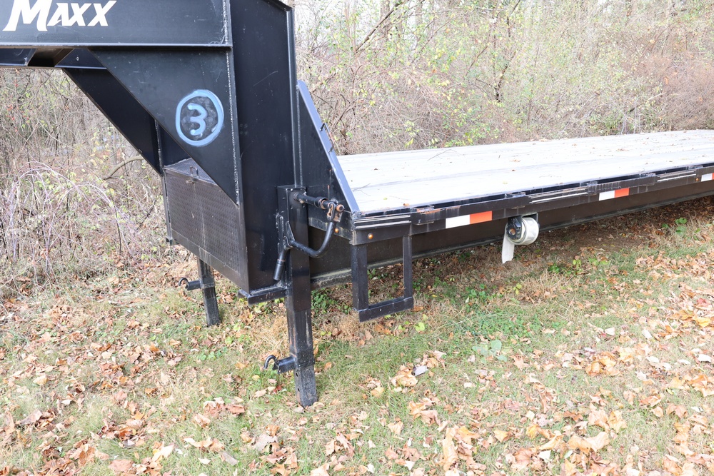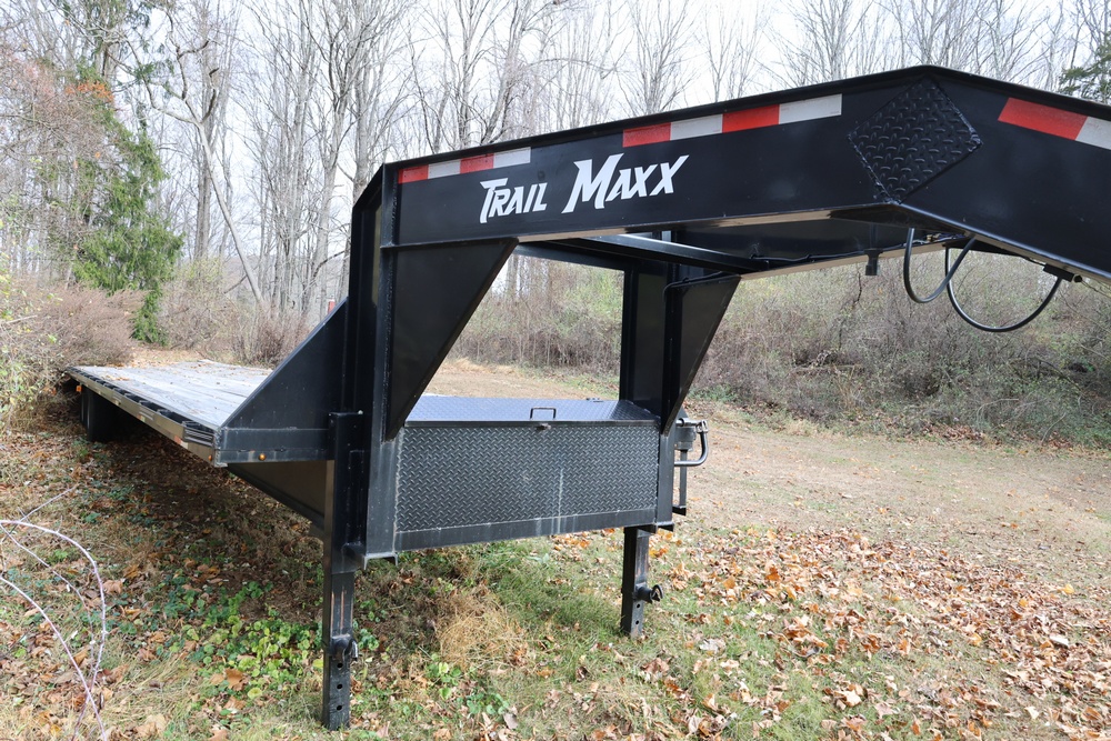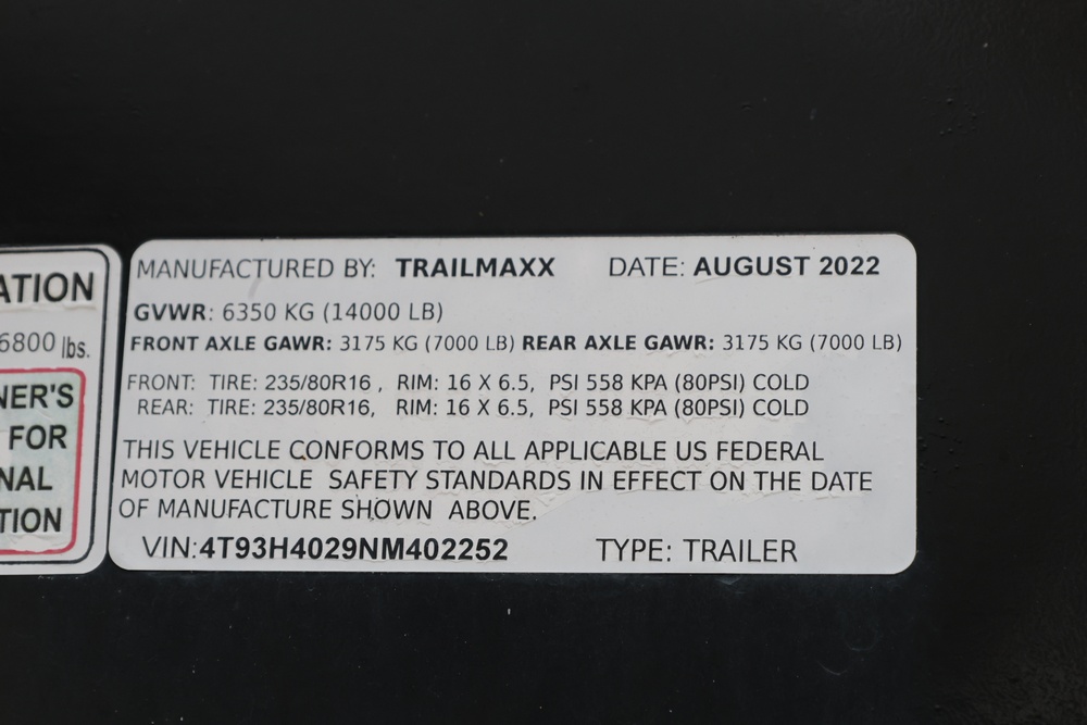 2022 TrailMaxx gooseneck flatbed trailer. VIN: 4T93H4029NM402252. GVWR 6350 kg (14,000 lb) with front and rear axle GAWR of 3175 kg (7000 lb) each. Equipped with tandem axles, wood deck, steel frame construction, and front toolbox with integrated storage. Features include gooseneck hitch, landing gear jacks, stake pockets, and rub rail. Title available.