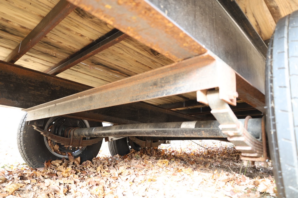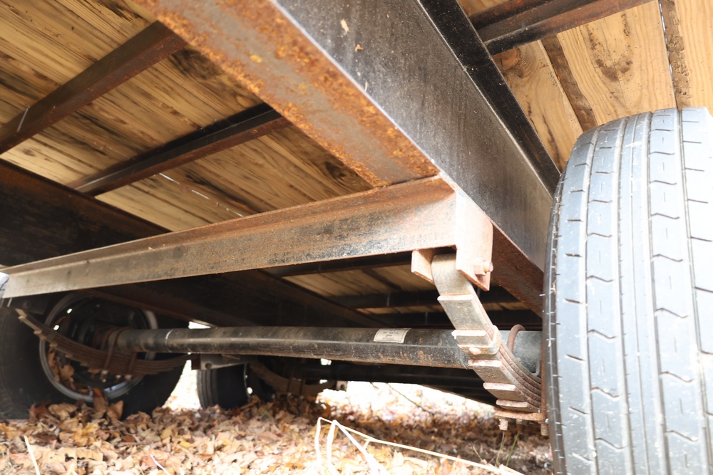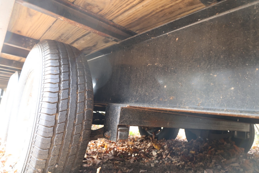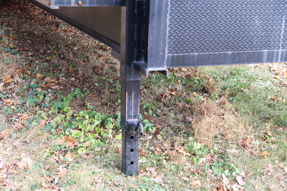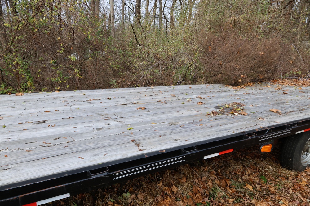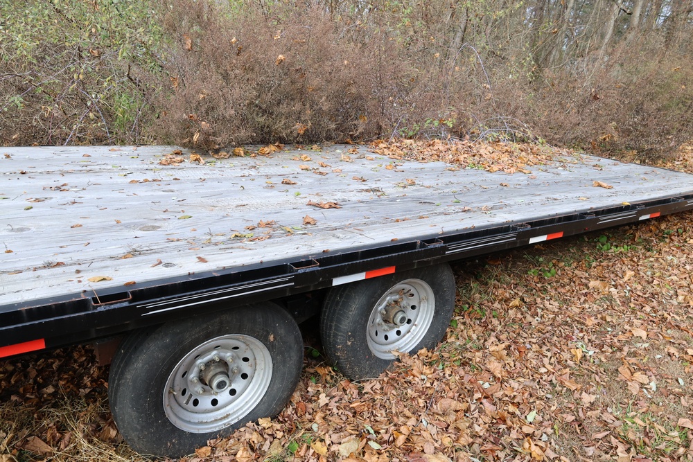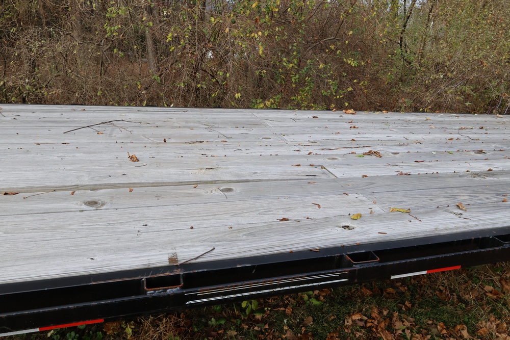 2022 TrailMaxx gooseneck flatbed trailer. VIN: 4T93H4029NM402252. GVWR 6350 kg (14,000 lb) with front and rear axle GAWR of 3175 kg (7000 lb) each. Equipped with tandem axles, wood deck, steel frame construction, and front toolbox with integrated storage. Features include gooseneck hitch, landing gear jacks, stake pockets, and rub rail. Title available.