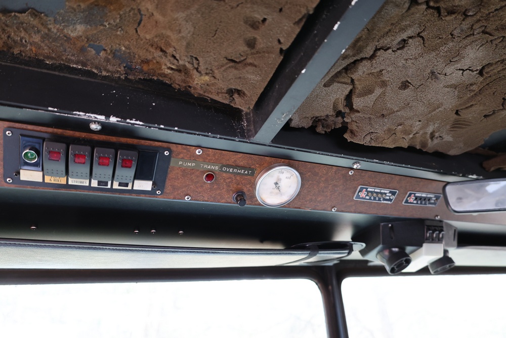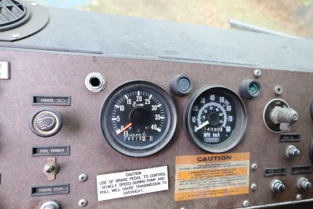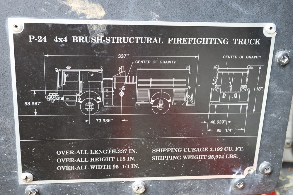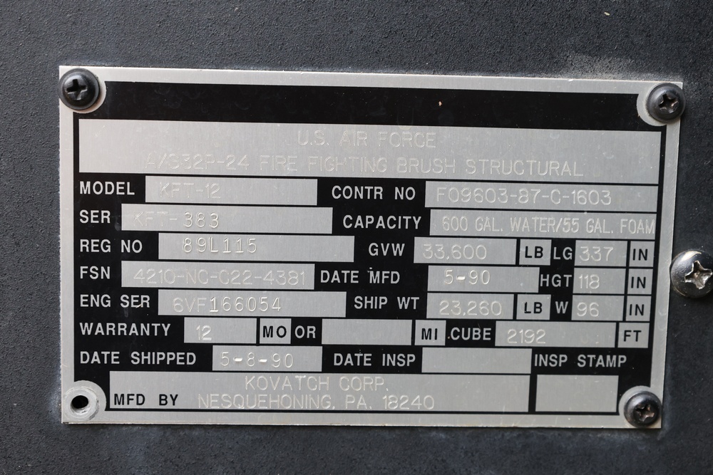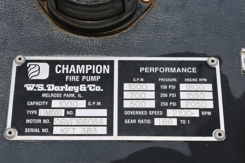 1990 Kovatch KFT-12 P-24 AWD brush-structural firefighting truck. VIN: KFT383 visible. Body: tandem-axle fire truck with enclosed cab and integrated water tank body. Engine: 6V92TA, information plate lists engine serial 6VF166054; pump motor number 06VF166054. Allison Automatic transmission. Odometer reading: 014390. Hour meter reading 515. Features include a 600-gallon water tank and 55-gallon foam capacity as labeled, W.S. Darley Champion fire pump rated at 1000 GPM (type LDM1000), exterior pump-control panel with multiple discharge levers and gauges, front bumper platform, rear step platform, roof emergency lighting, dual side mirrors, and all-terrain tires. Manufacturer data plate lists GVW 33,600 lbs, overall length 337 in., height 118 in., width 95 1/4 in., and shipping weight 23,260 lbs. Seller reports: runs and drives, title and key available. Battery may need to be replaced to start.