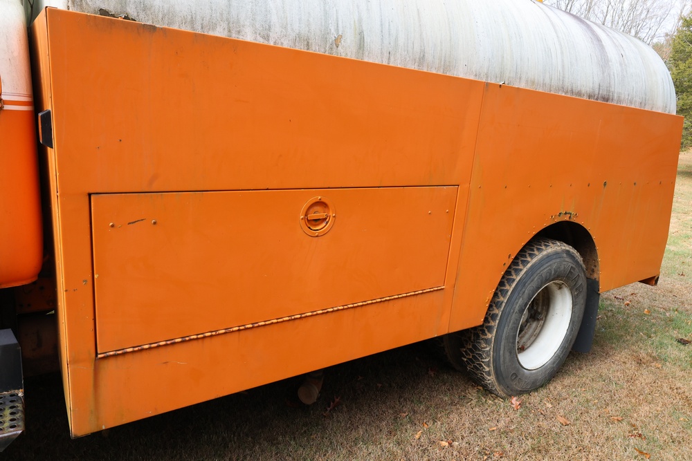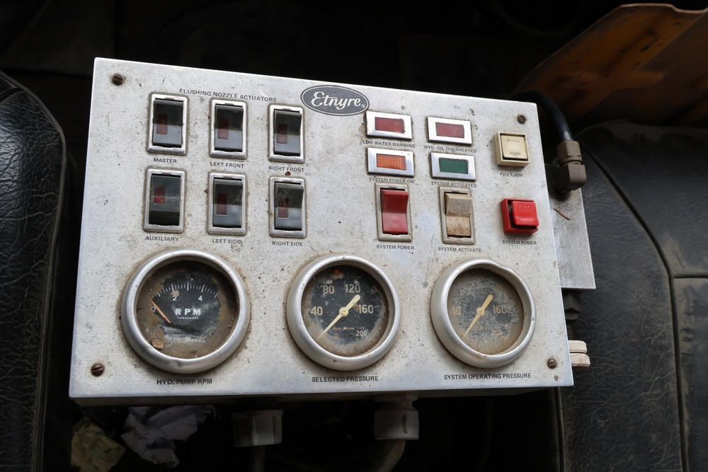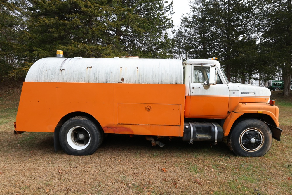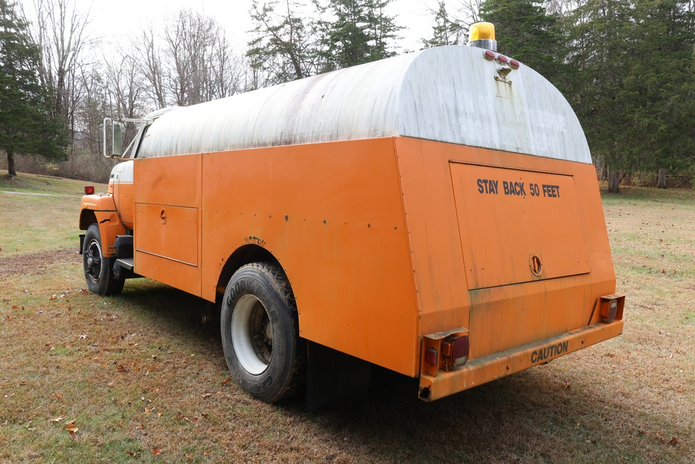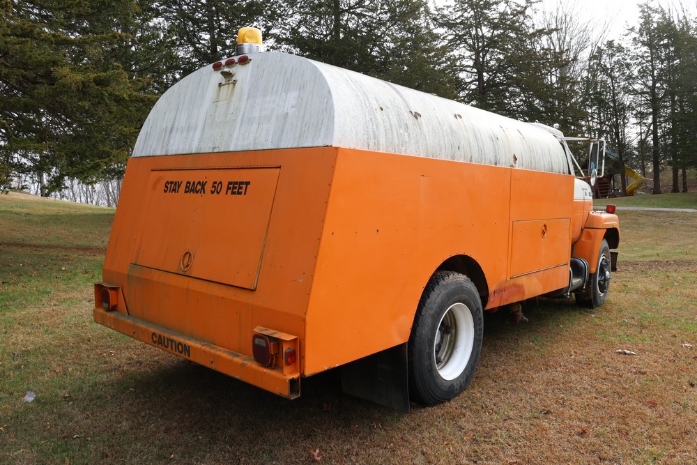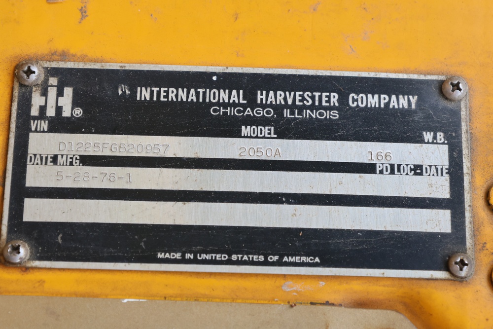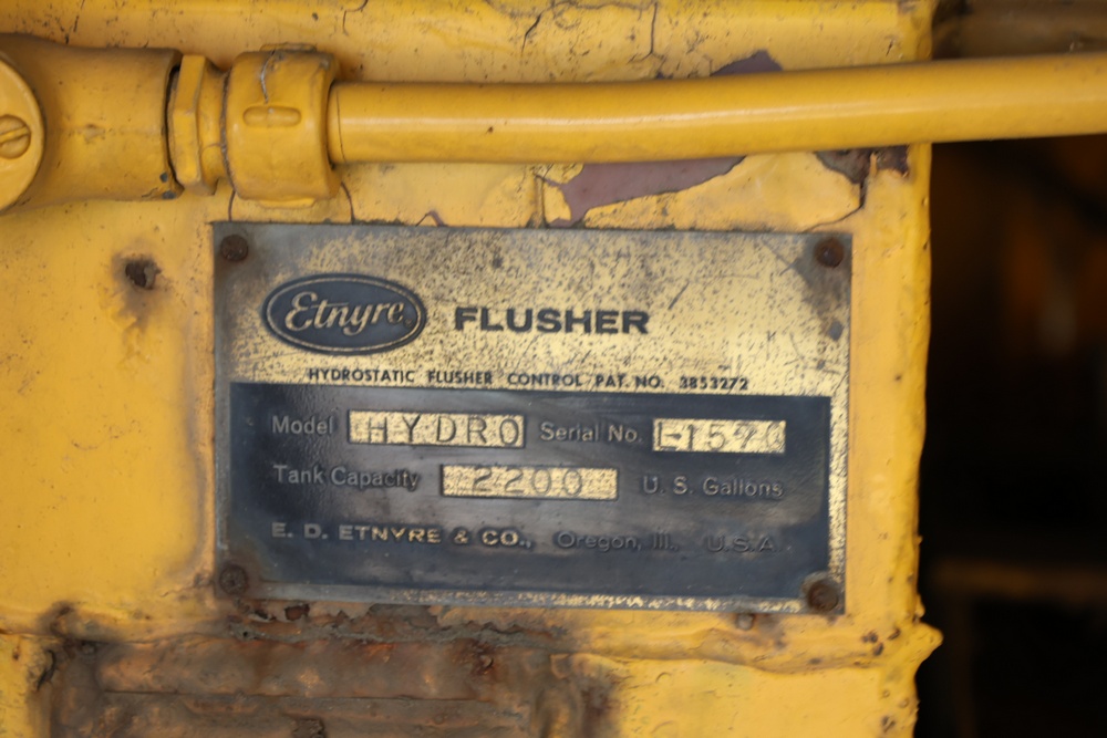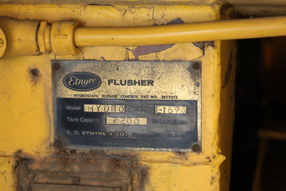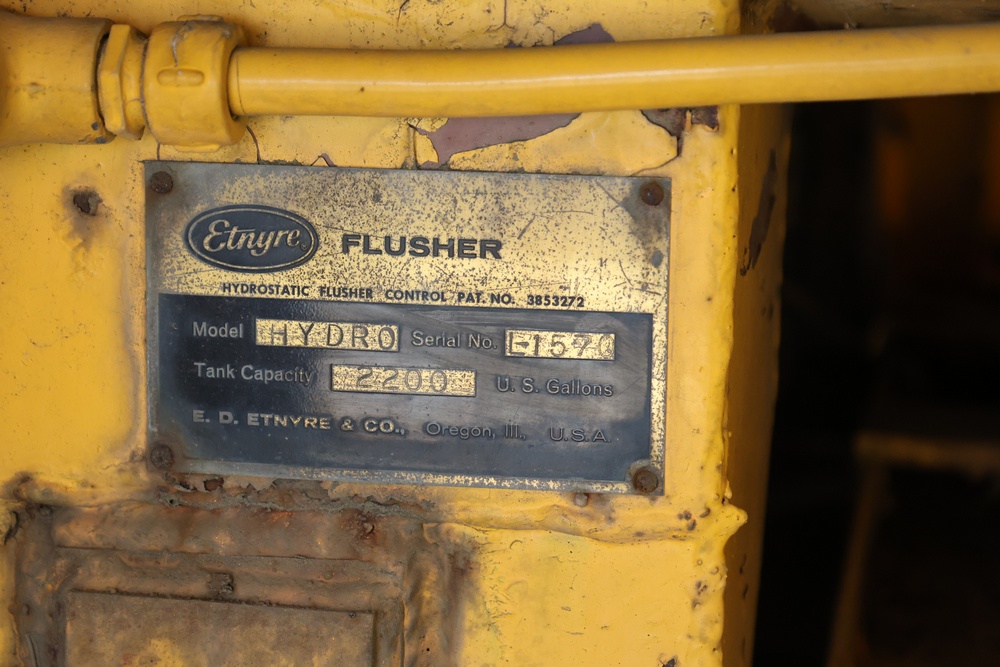 1978? International Harvester 2050A water truck. VIN: D1225FGB20957. Engine: 6V53 Detroit Diesel with Allison transmission. Body: single-axle cab-over truck equipped with an Etnyre hydrostatic flusher system and cylindrical water tank. Odometer reading: 023027. Features include an E.D. Etnyre & Co. Hydro model flusher system (model HYDRO, serial E1570) with a labeled tank capacity of 2200 gallons, interior Etnyre control panel with nozzle actuation switches and system pressure gauges. Data plate indicates a manufacturing date of 5-28-76 and wheelbase 166 inches. Seller reports: runs and drives, title and key available. Battery may need to be replaced to start.