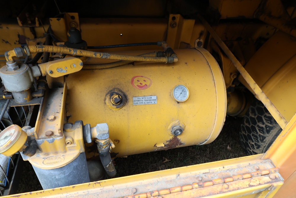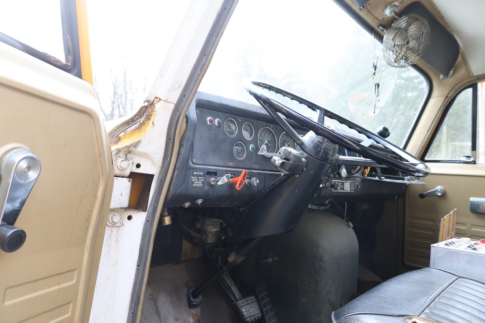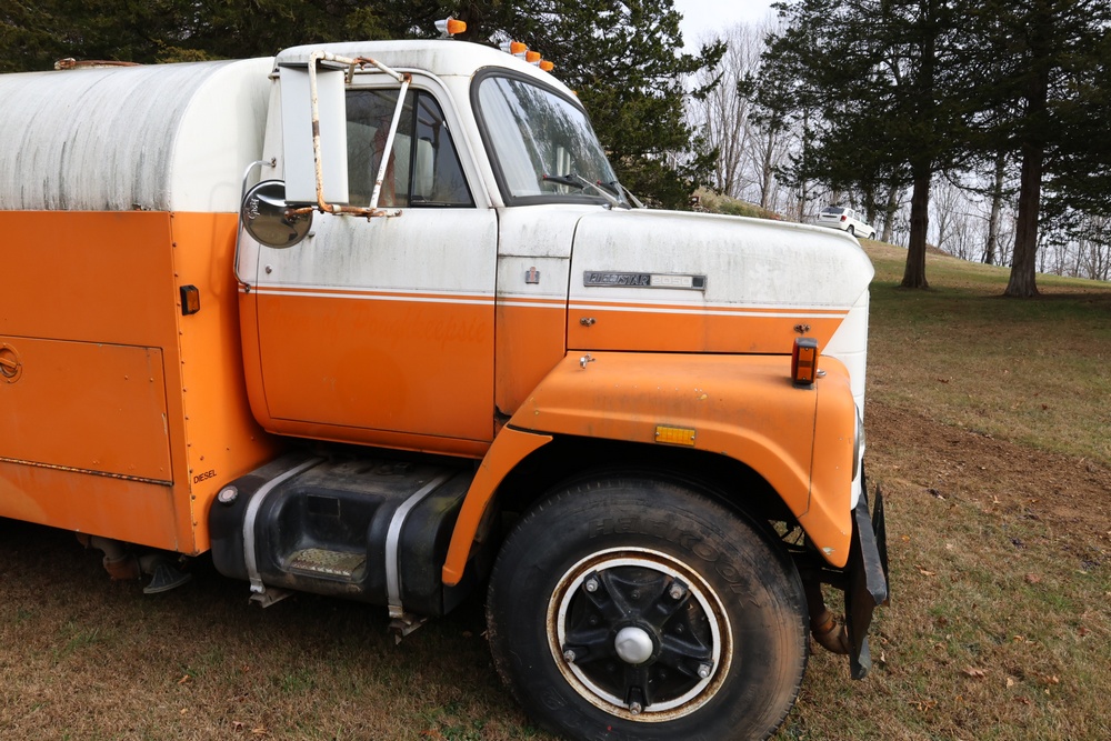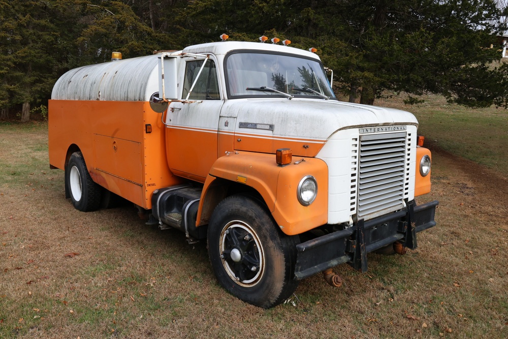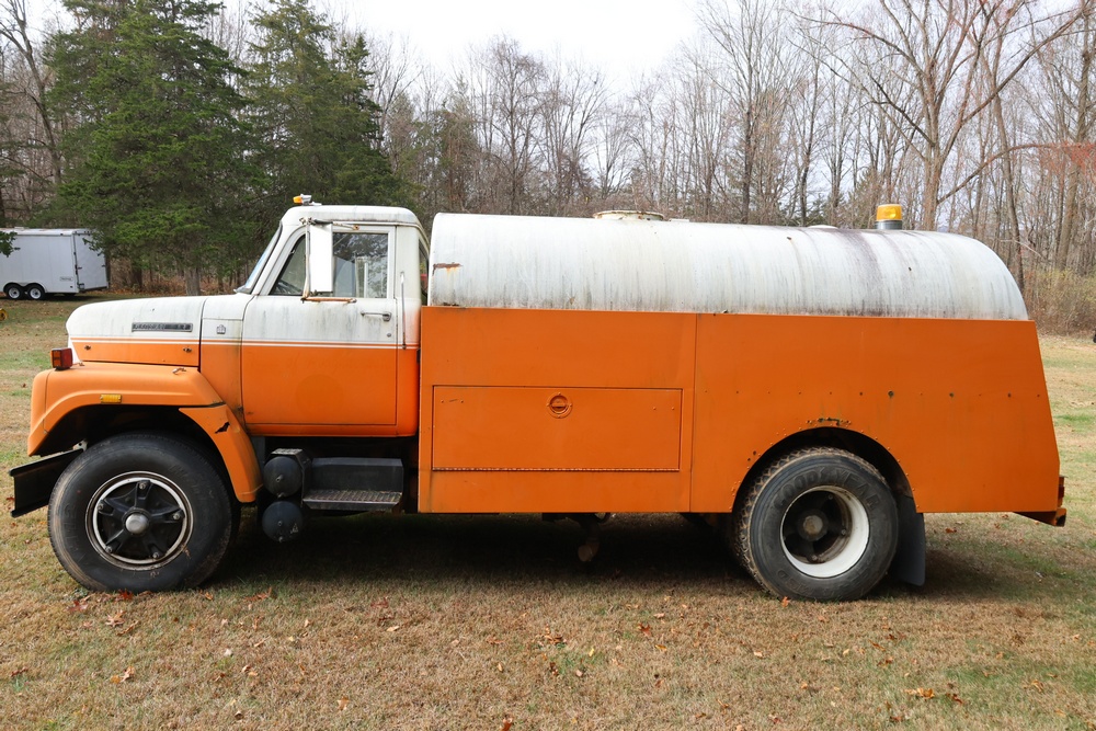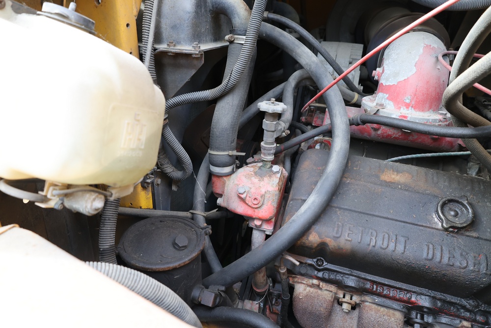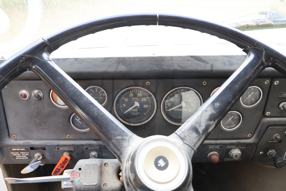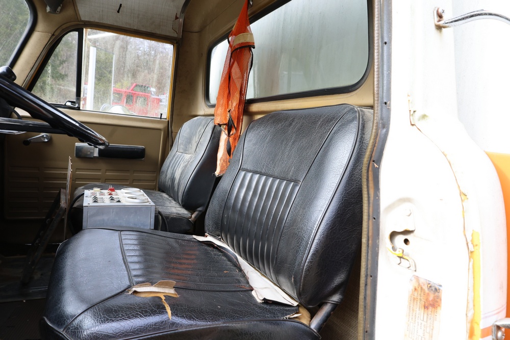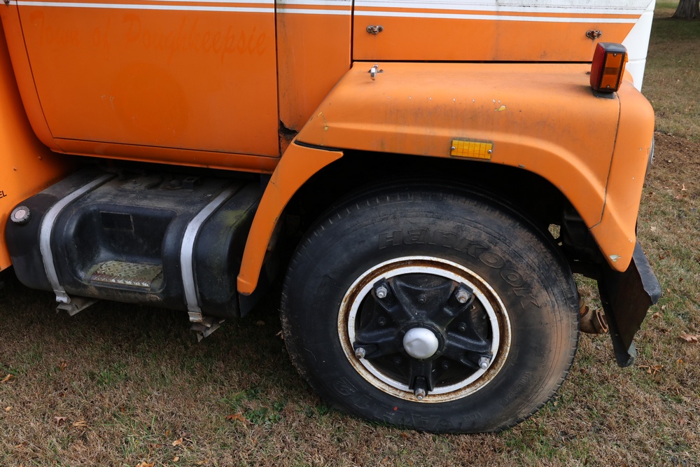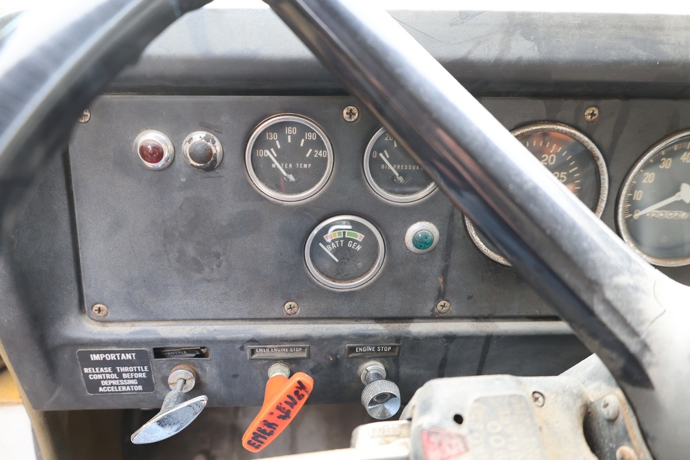 1978? International Harvester 2050A water truck. VIN: D1225FGB20957. Engine: 6V53 Detroit Diesel with Allison transmission. Body: single-axle cab-over truck equipped with an Etnyre hydrostatic flusher system and cylindrical water tank. Odometer reading: 023027. Features include an E.D. Etnyre & Co. Hydro model flusher system (model HYDRO, serial E1570) with a labeled tank capacity of 2200 gallons, interior Etnyre control panel with nozzle actuation switches and system pressure gauges. Data plate indicates a manufacturing date of 5-28-76 and wheelbase 166 inches. Seller reports: runs and drives, title and key available. Battery may need to be replaced to start.