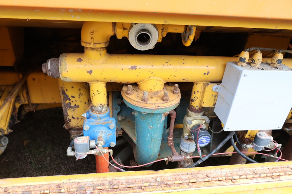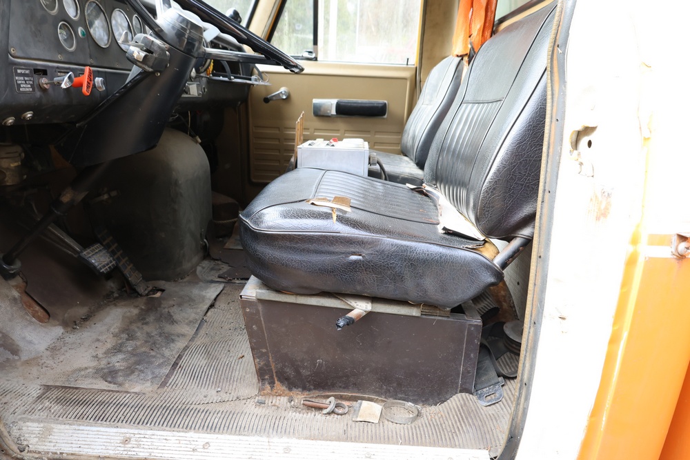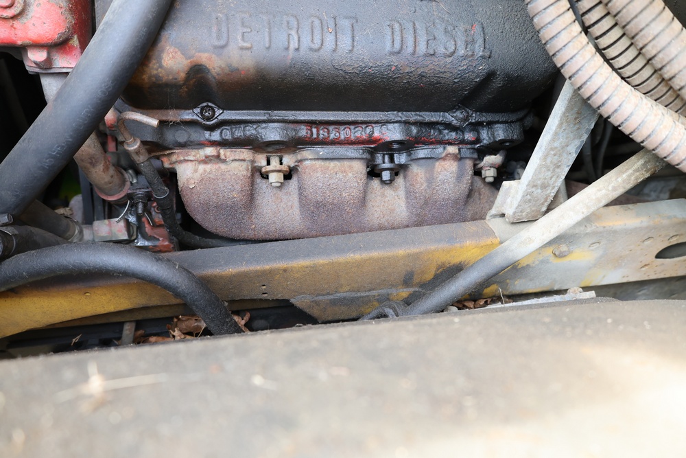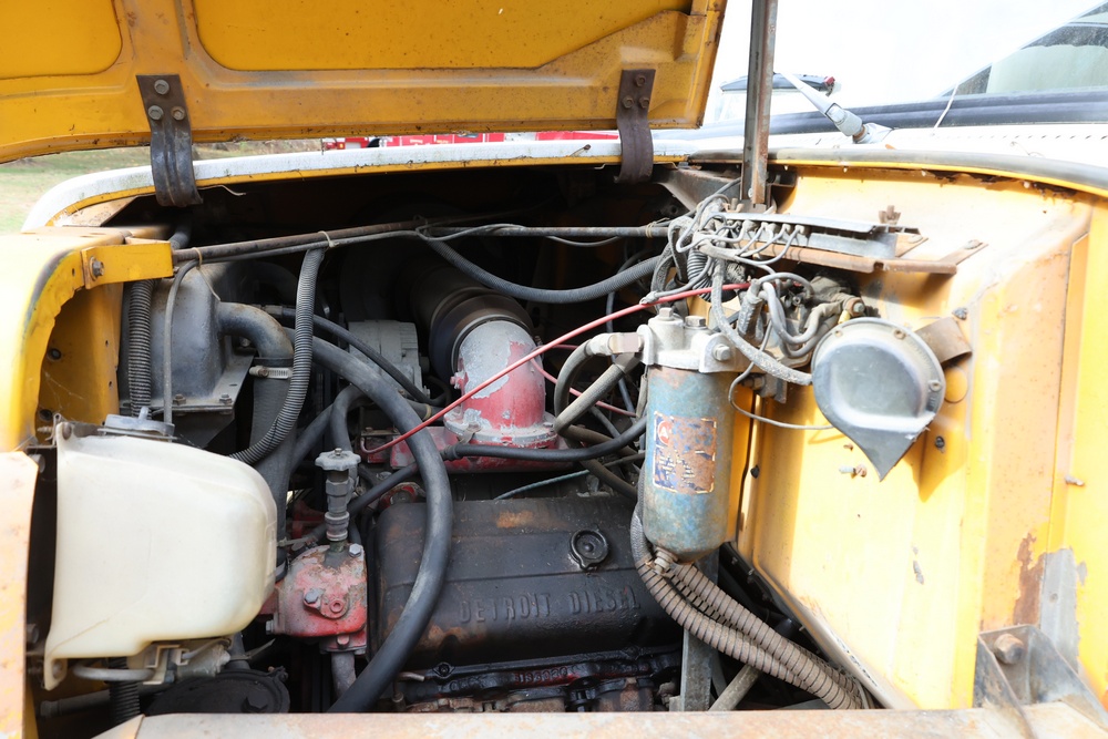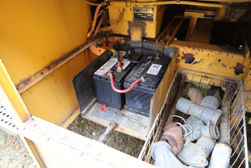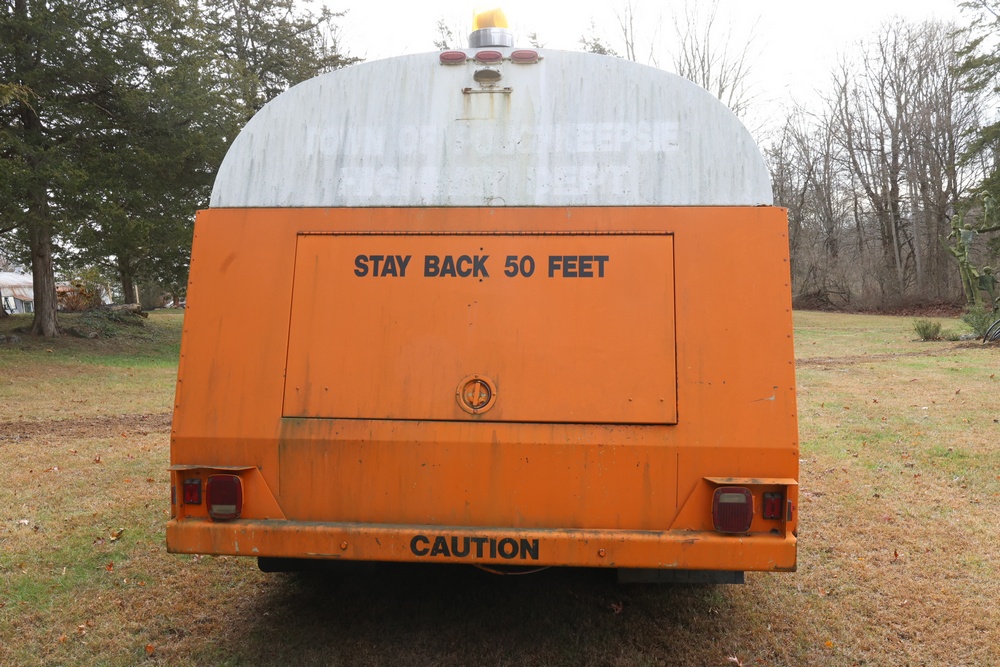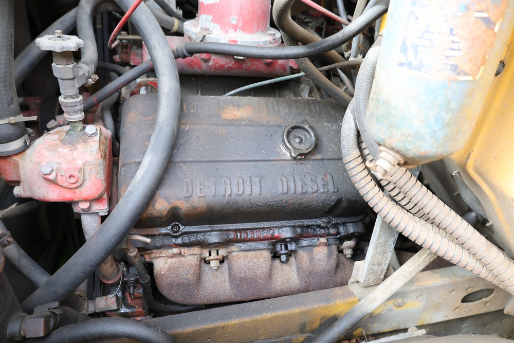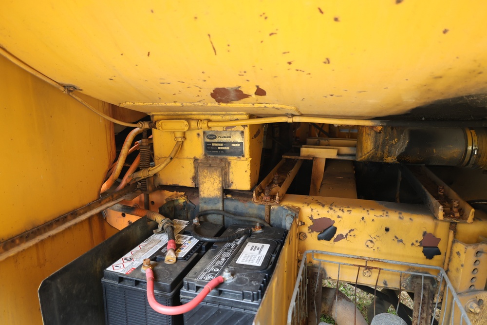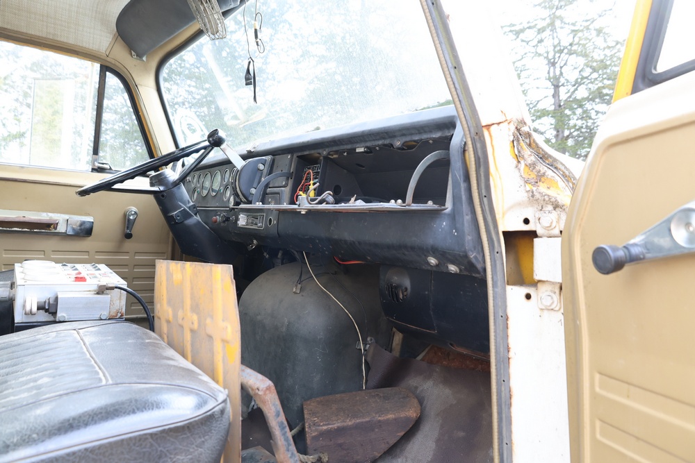 1978? International Harvester 2050A water truck. VIN: D1225FGB20957. Engine: 6V53 Detroit Diesel with Allison transmission. Body: single-axle cab-over truck equipped with an Etnyre hydrostatic flusher system and cylindrical water tank. Odometer reading: 023027. Features include an E.D. Etnyre & Co. Hydro model flusher system (model HYDRO, serial E1570) with a labeled tank capacity of 2200 gallons, interior Etnyre control panel with nozzle actuation switches and system pressure gauges. Data plate indicates a manufacturing date of 5-28-76 and wheelbase 166 inches. Seller reports: runs and drives, title and key available. Battery may need to be replaced to start.