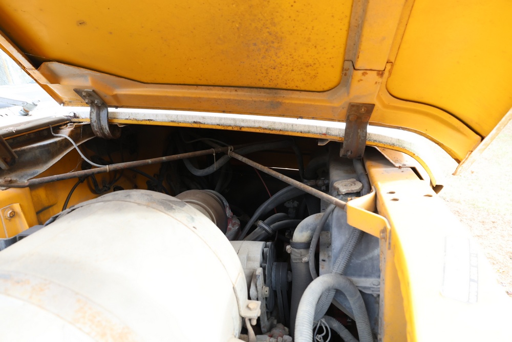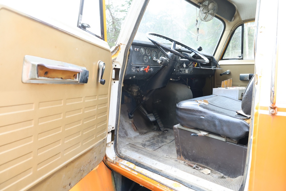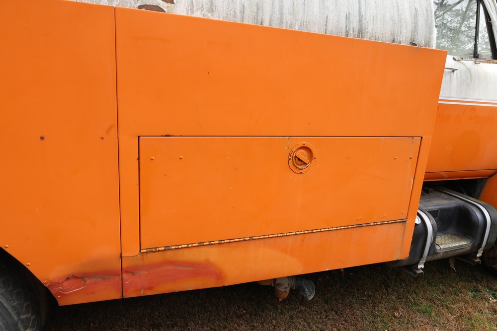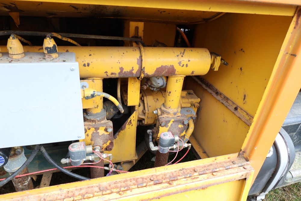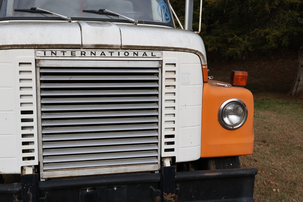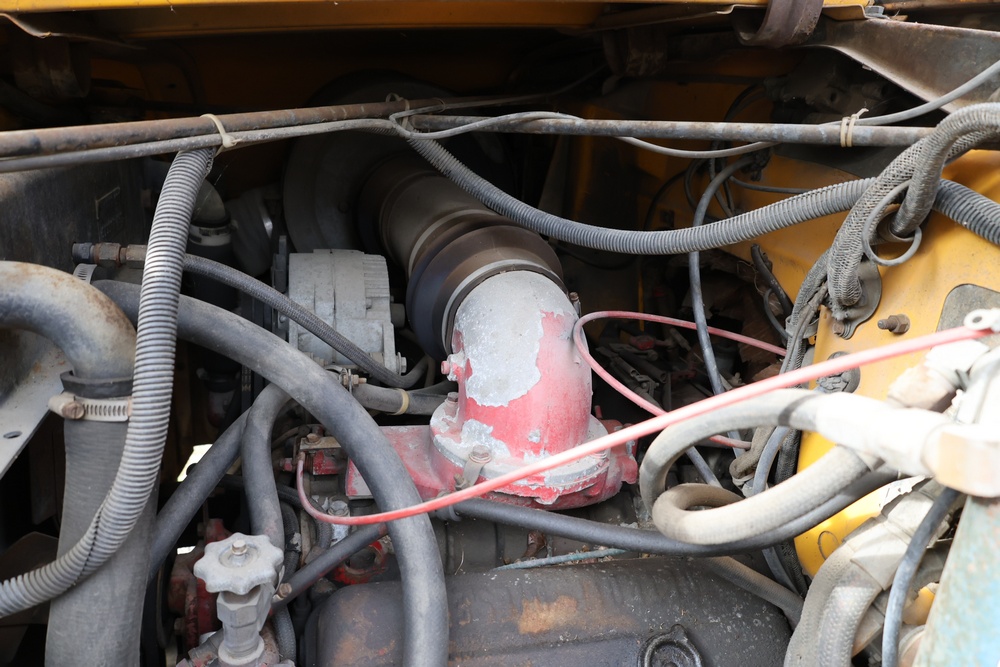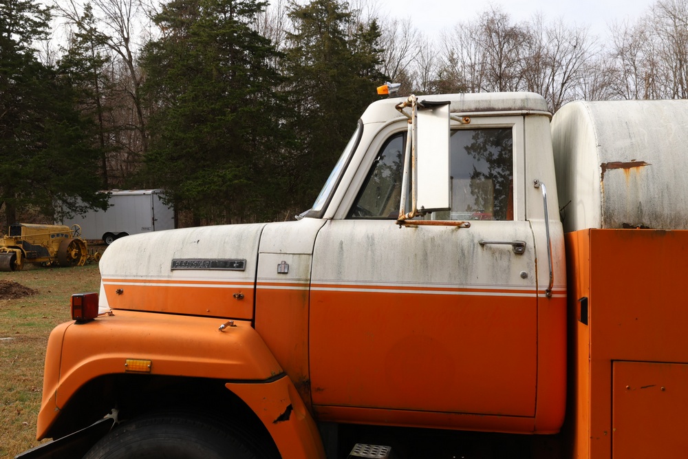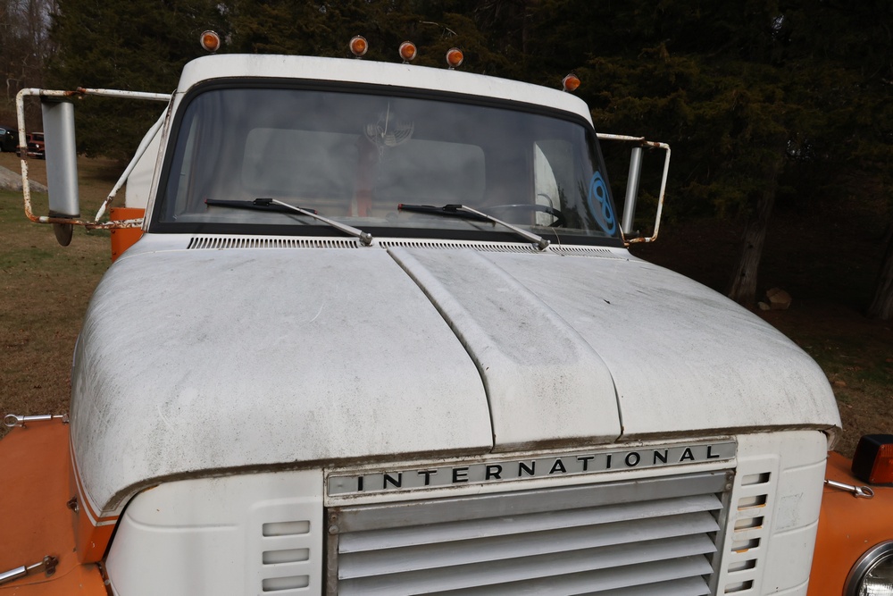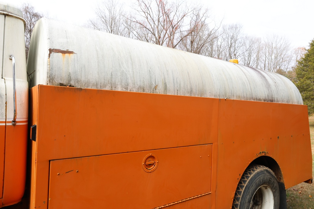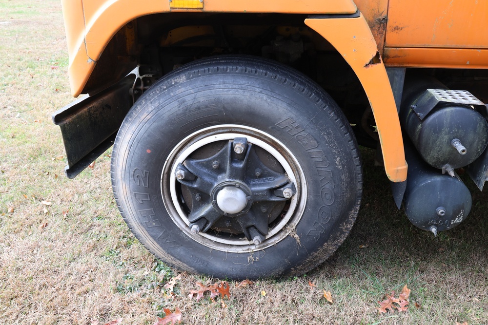 1978? International Harvester 2050A water truck. VIN: D1225FGB20957. Engine: 6V53 Detroit Diesel with Allison transmission. Body: single-axle cab-over truck equipped with an Etnyre hydrostatic flusher system and cylindrical water tank. Odometer reading: 023027. Features include an E.D. Etnyre & Co. Hydro model flusher system (model HYDRO, serial E1570) with a labeled tank capacity of 2200 gallons, interior Etnyre control panel with nozzle actuation switches and system pressure gauges. Data plate indicates a manufacturing date of 5-28-76 and wheelbase 166 inches. Seller reports: runs and drives, title and key available. Battery may need to be replaced to start.