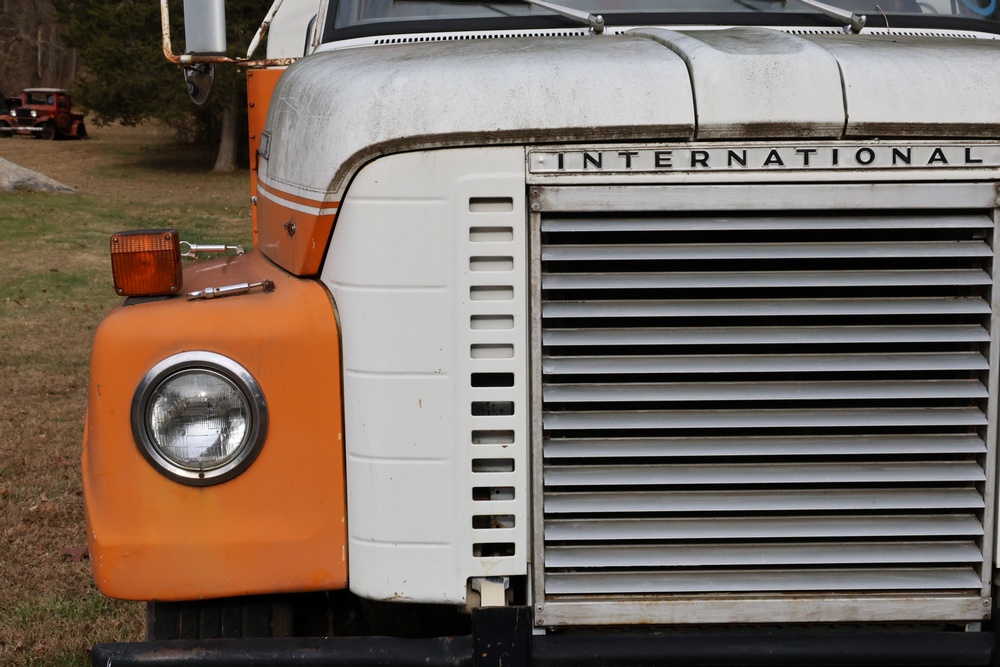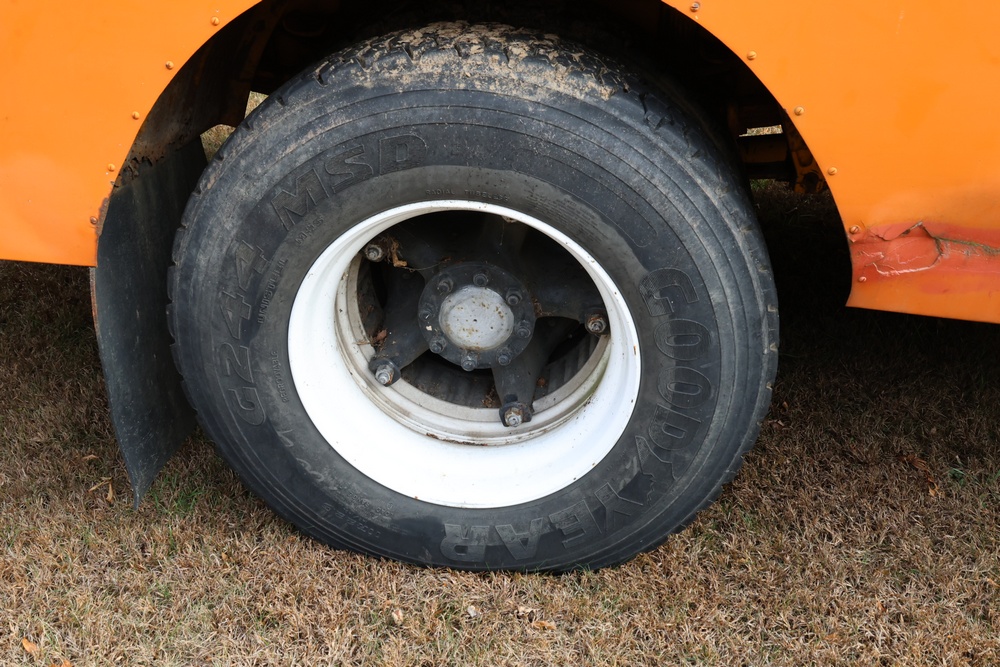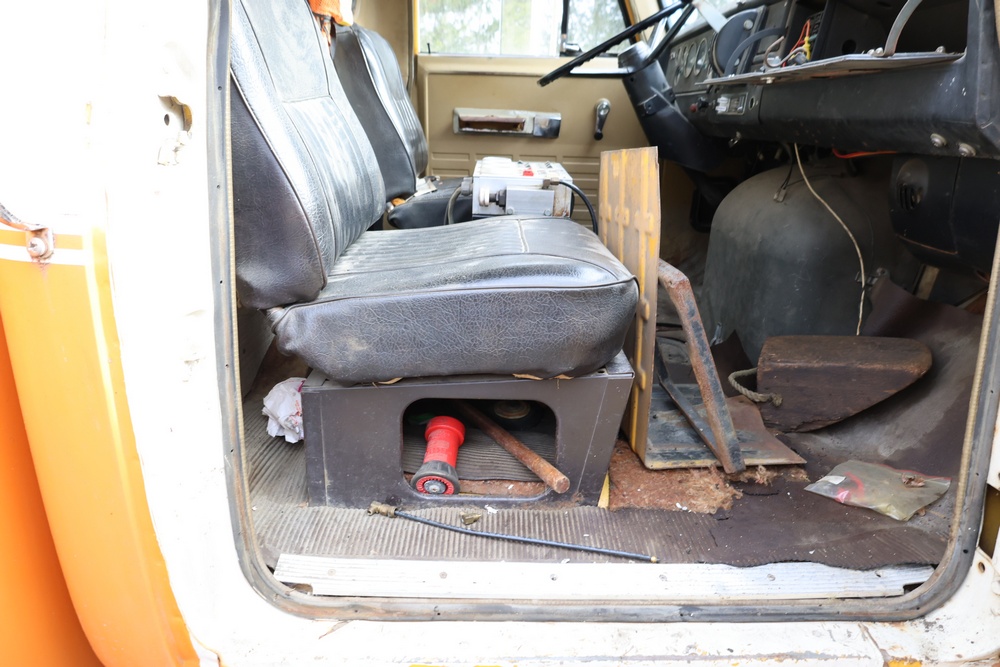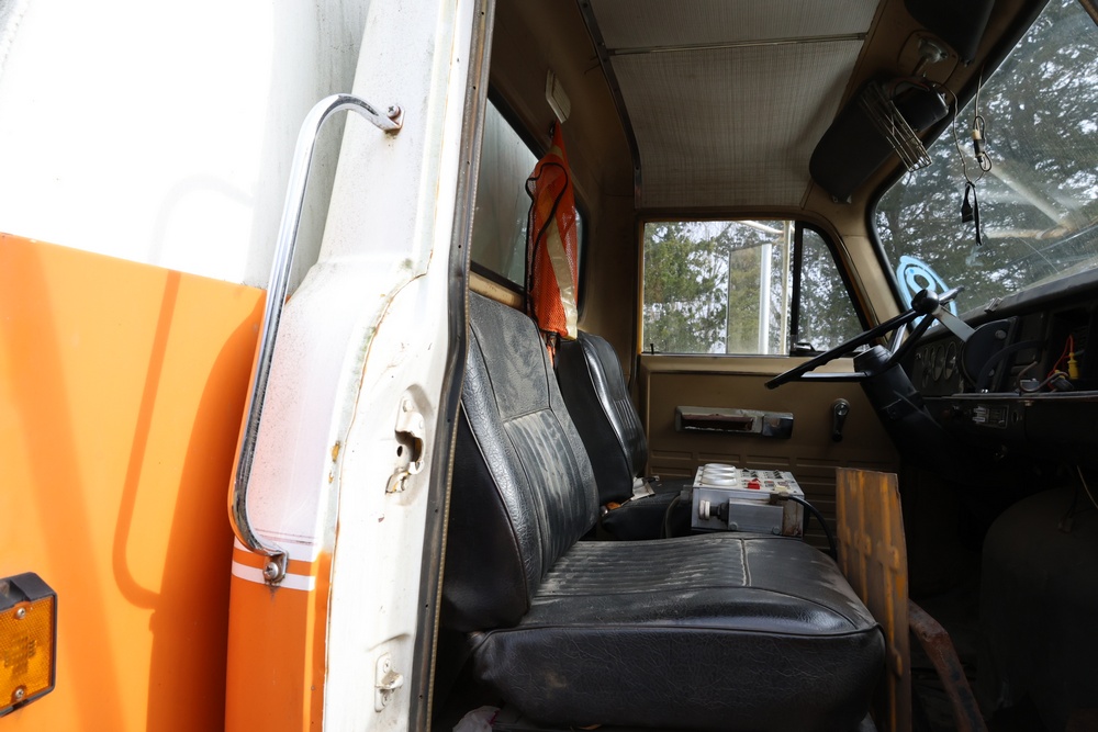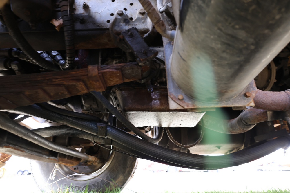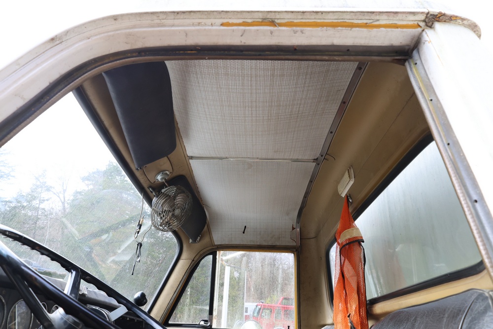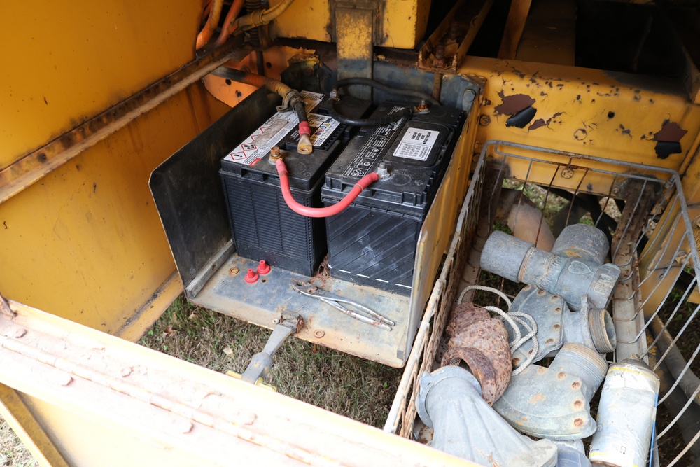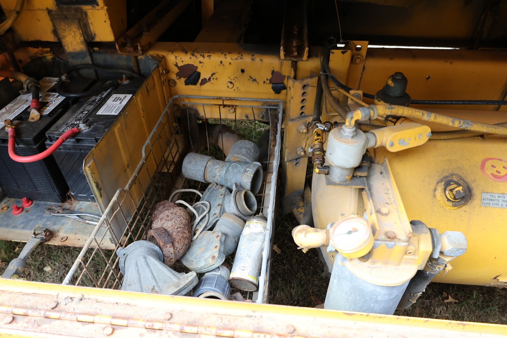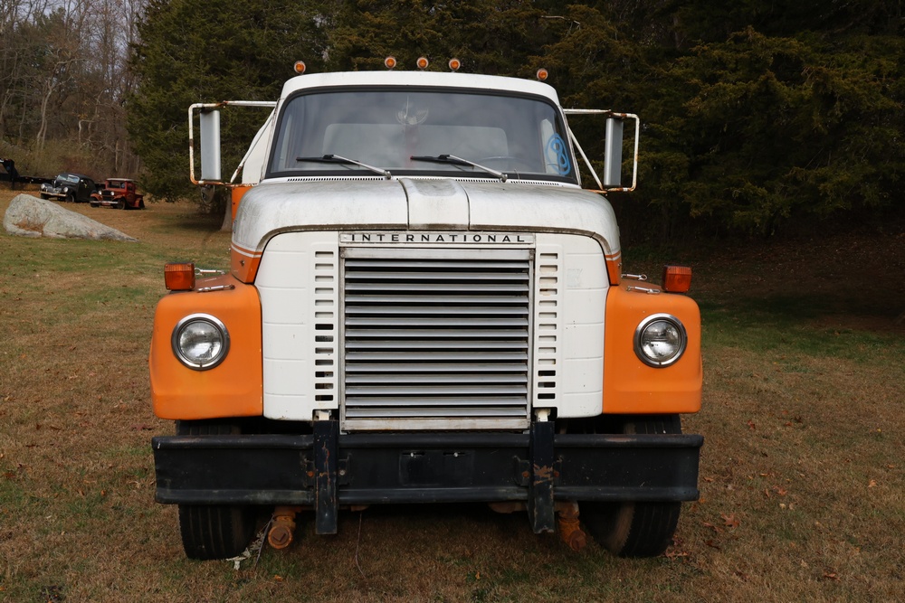 1978? International Harvester 2050A water truck. VIN: D1225FGB20957. Engine: 6V53 Detroit Diesel with Allison transmission. Body: single-axle cab-over truck equipped with an Etnyre hydrostatic flusher system and cylindrical water tank. Odometer reading: 023027. Features include an E.D. Etnyre & Co. Hydro model flusher system (model HYDRO, serial E1570) with a labeled tank capacity of 2200 gallons, interior Etnyre control panel with nozzle actuation switches and system pressure gauges. Data plate indicates a manufacturing date of 5-28-76 and wheelbase 166 inches. Seller reports: runs and drives, title and key available. Battery may need to be replaced to start.