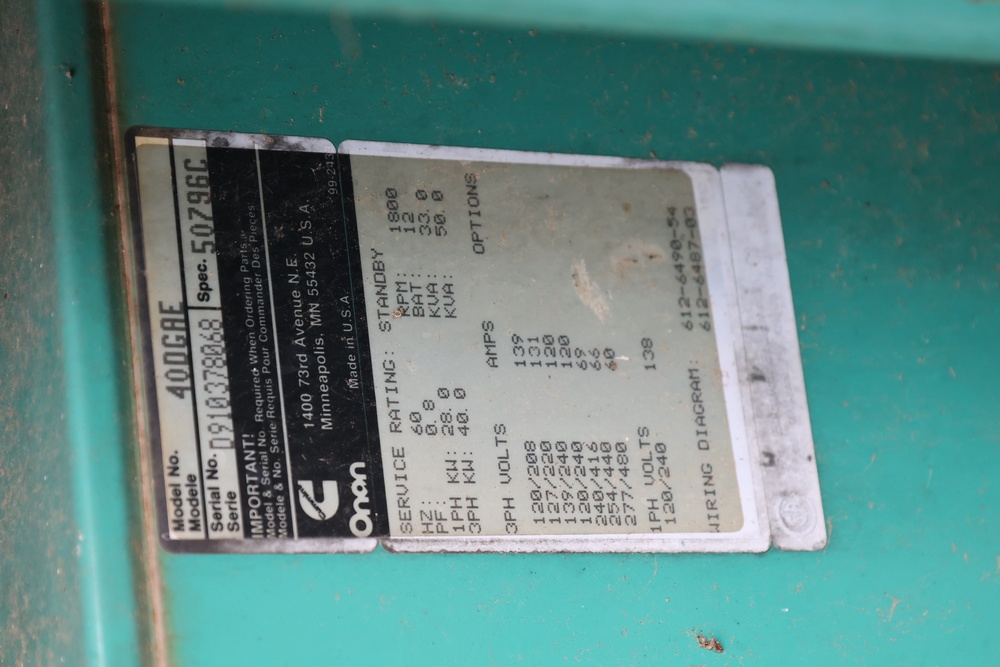 Onan 40DGE generator, serial 1910378868, rated 36 kW with multi voltage single and three phase output.