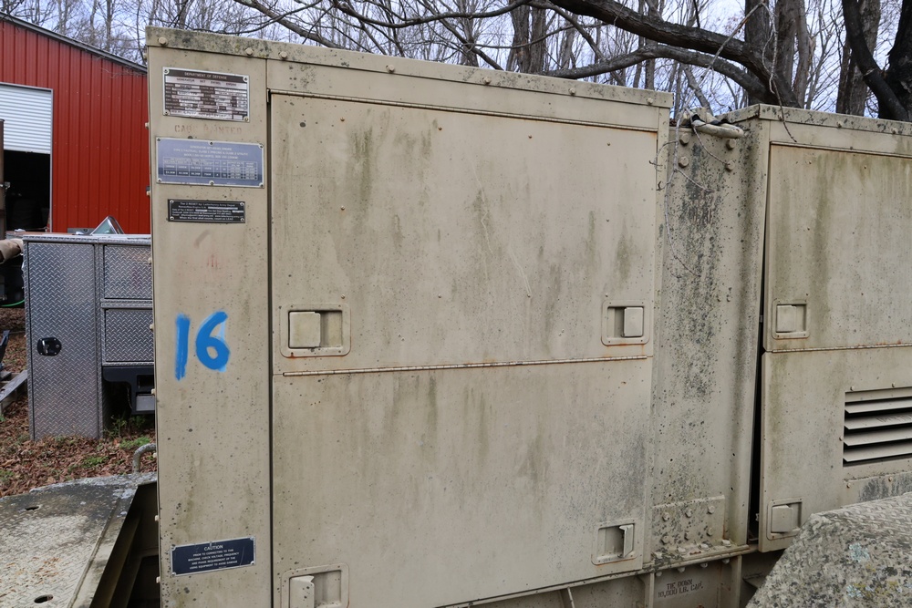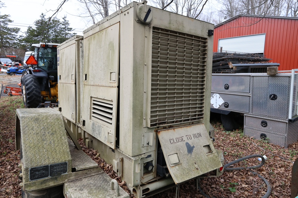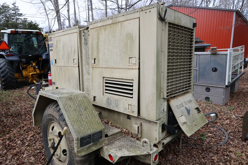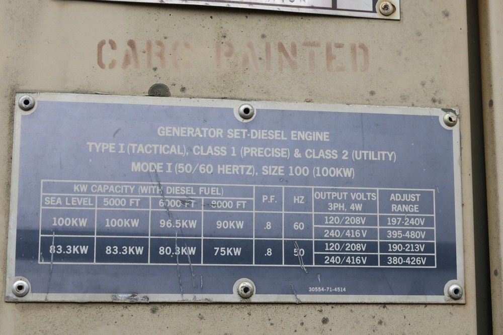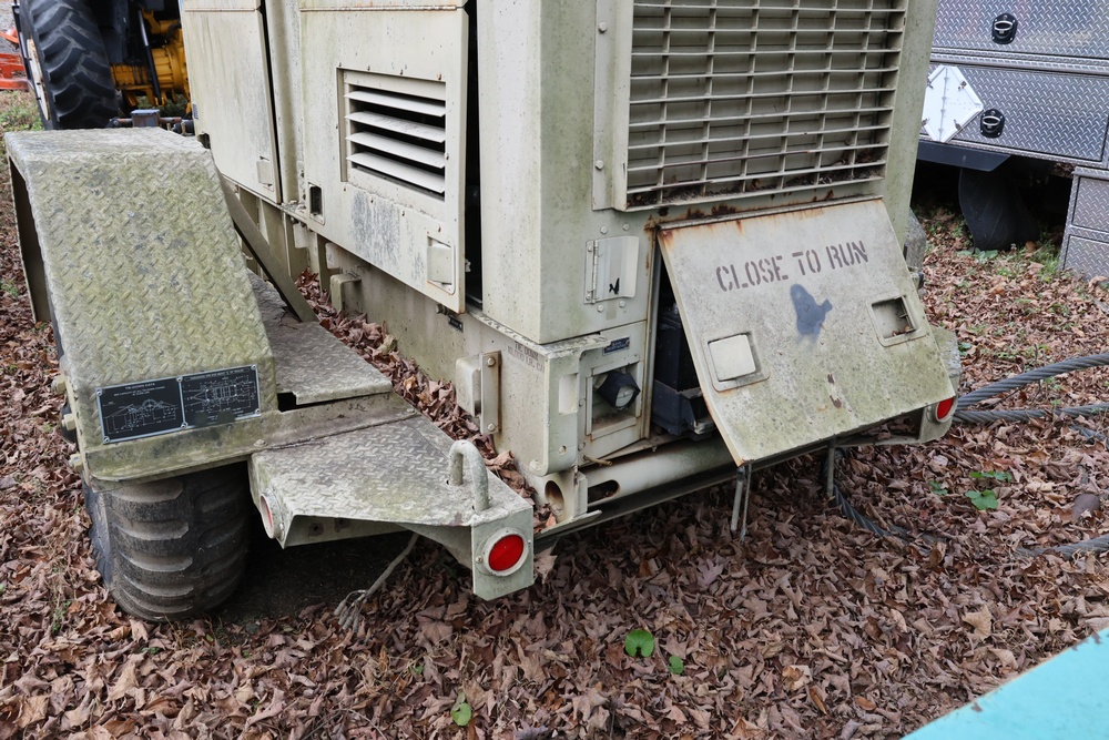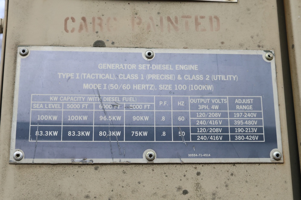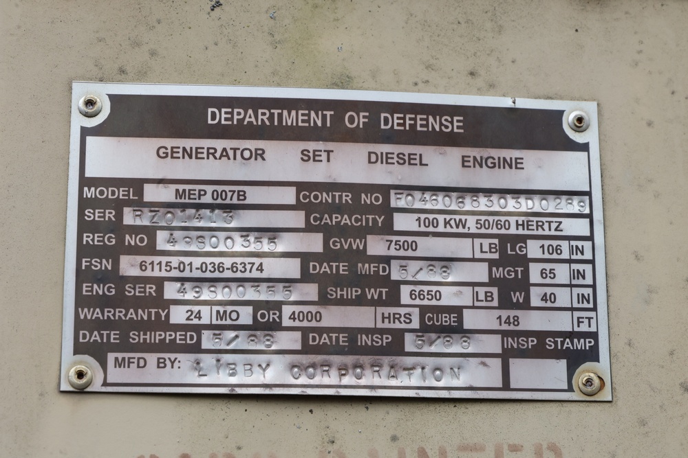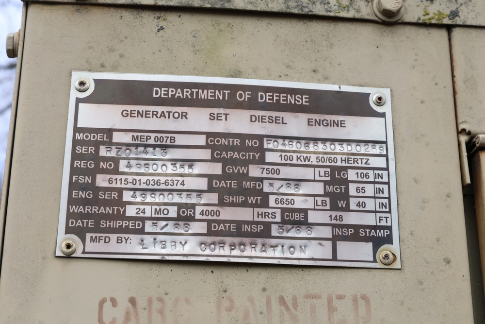 Libby Corporation MEP-007B diesel generator set, serial RZ01413, trailer-mounted, rated 100 kW with selectable 50/60 Hz output, and multi-voltage three-phase capability including 120/208 V and 240/416 V (as per labels). With a Cat 3306 engine.