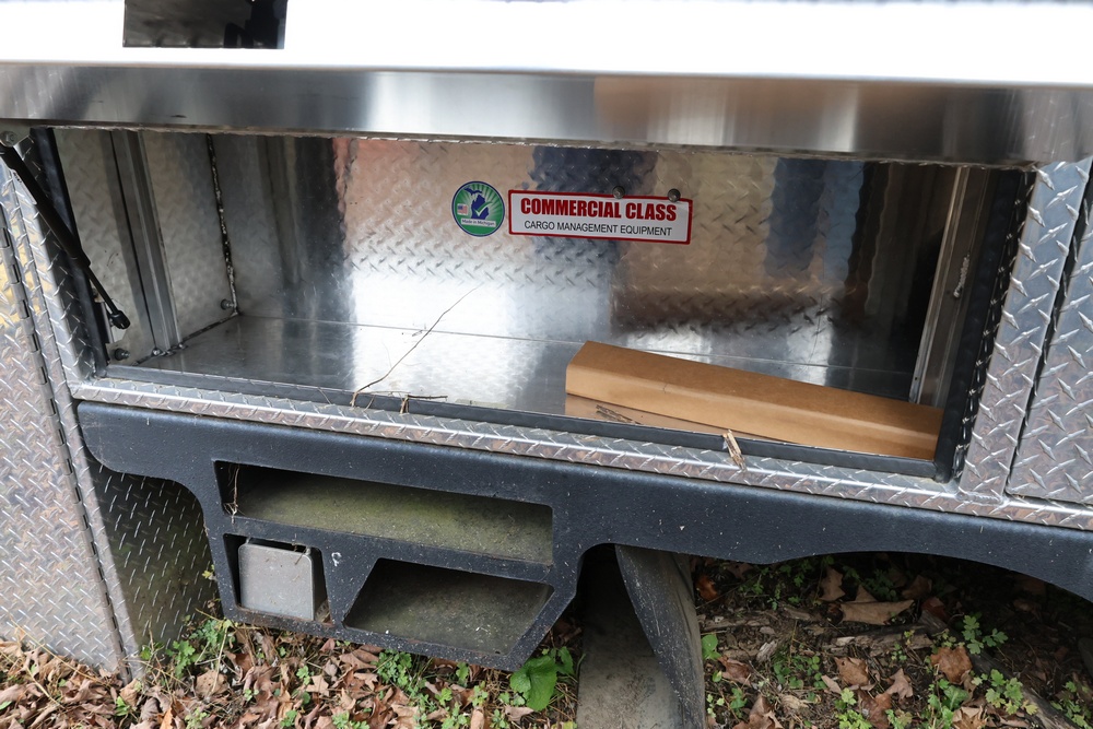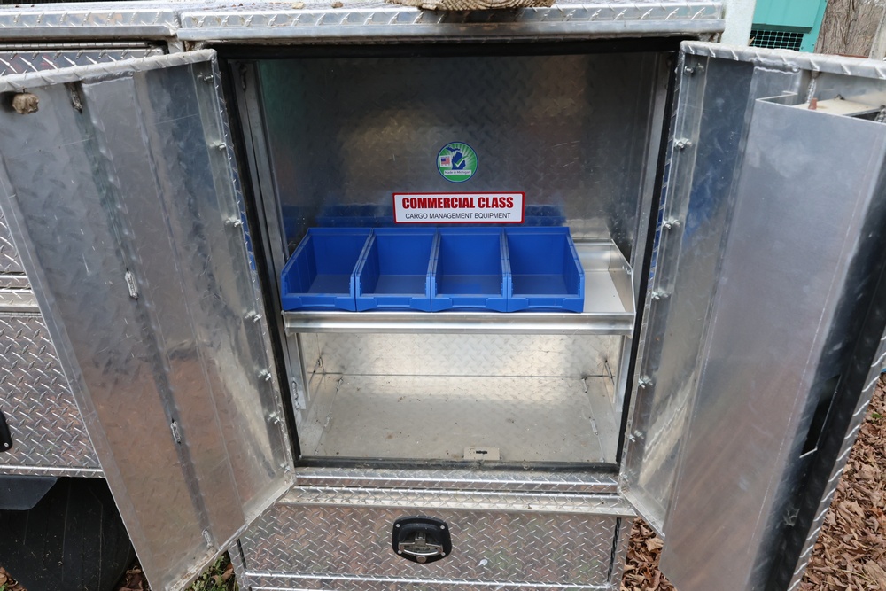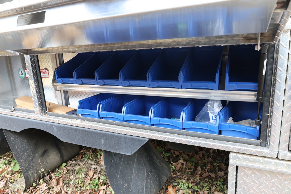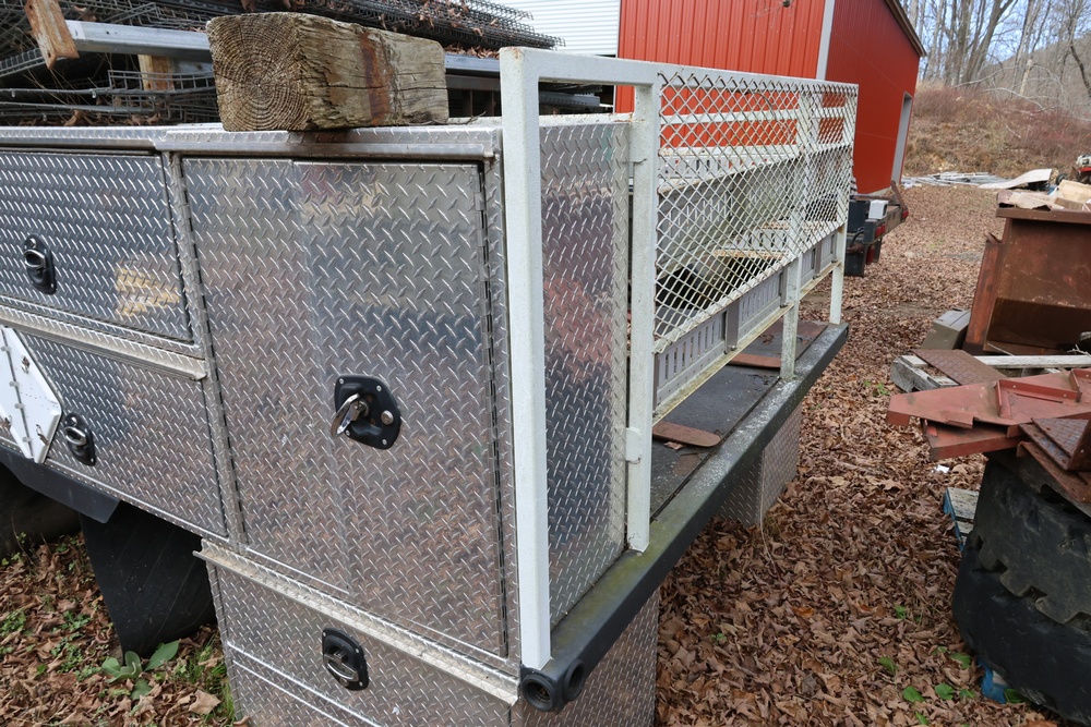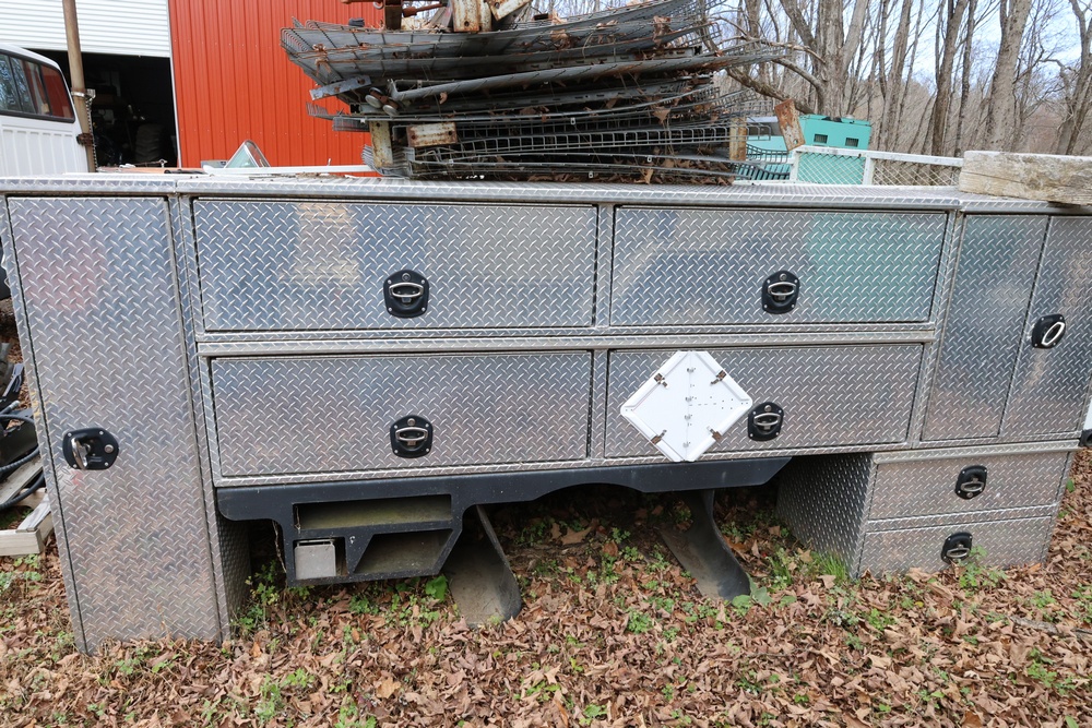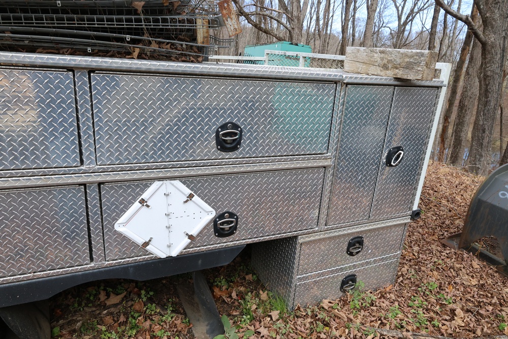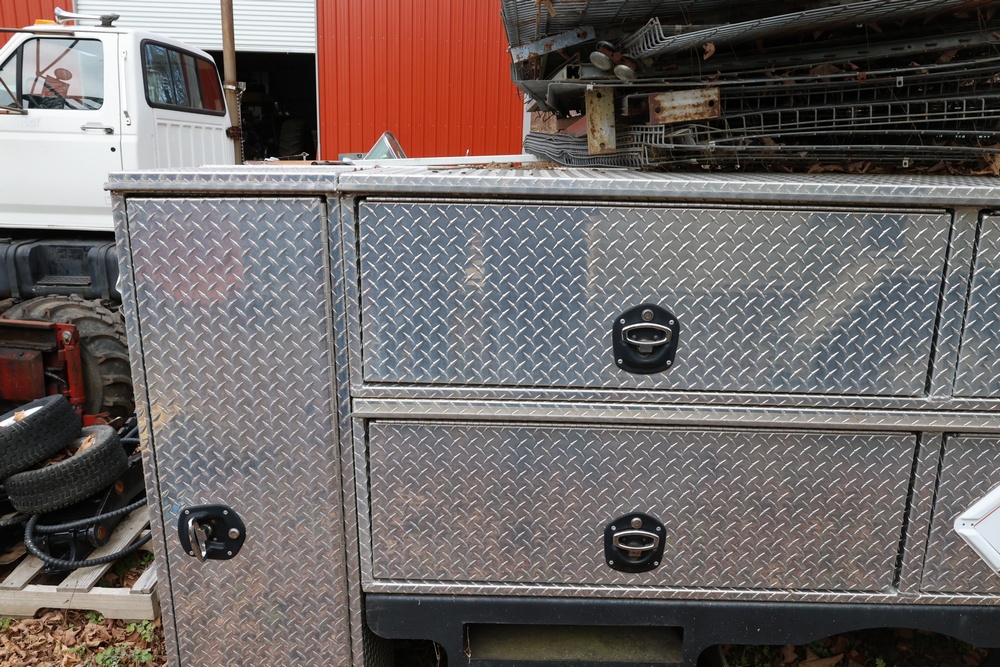 Commercial-class aluminum service truck body with diamond-plate construction, integrated side compartments, interior bin storage, and fold-down rear gate. Excludes the overhead racking or crane.