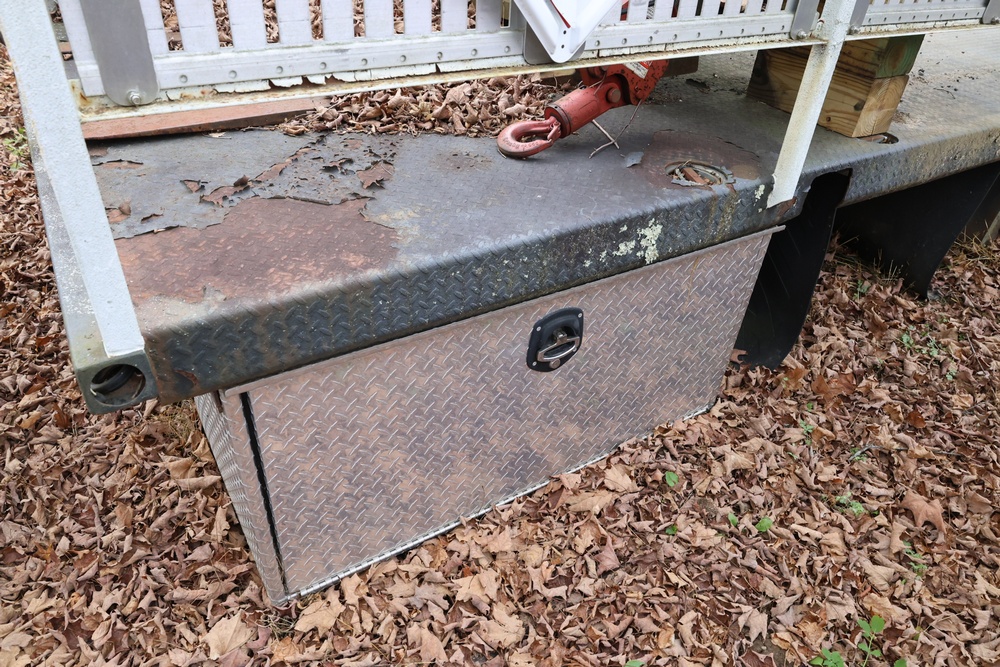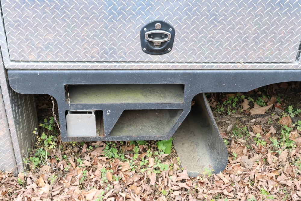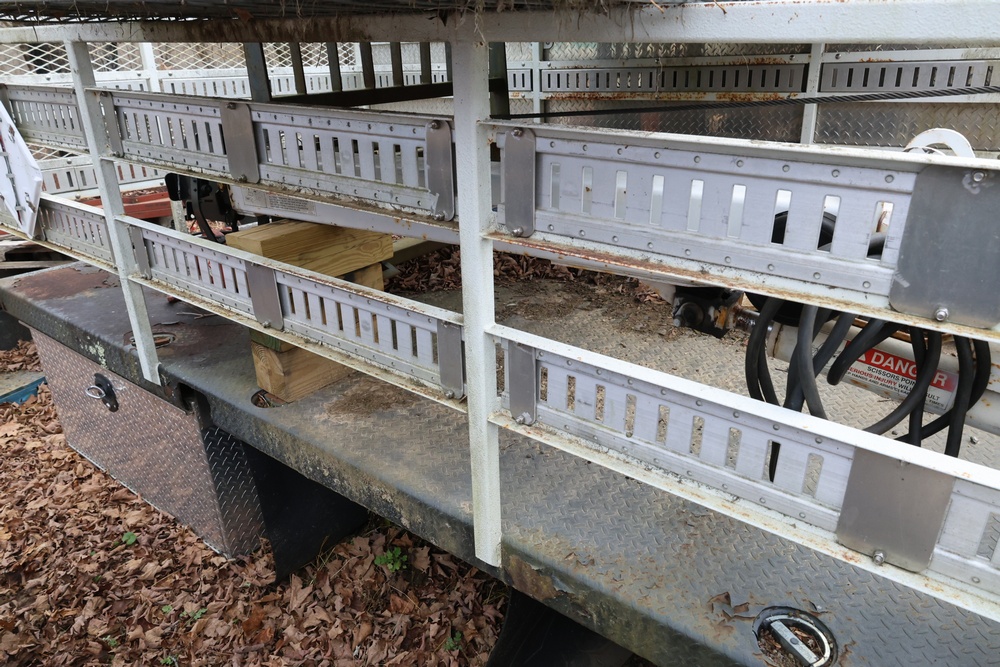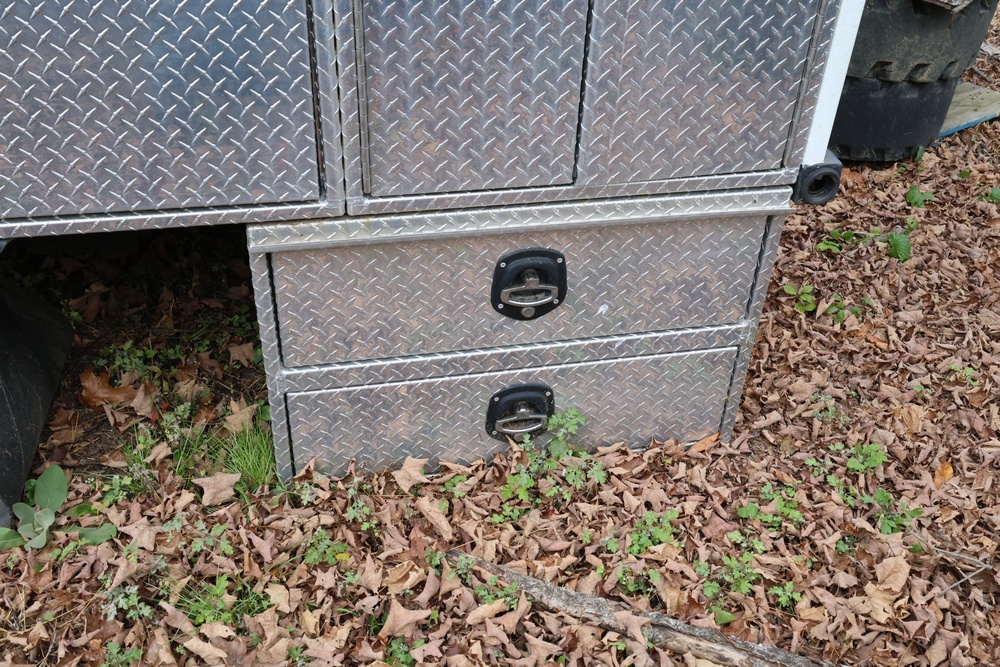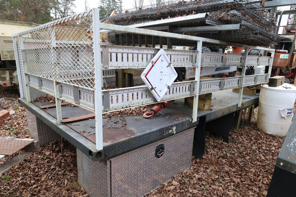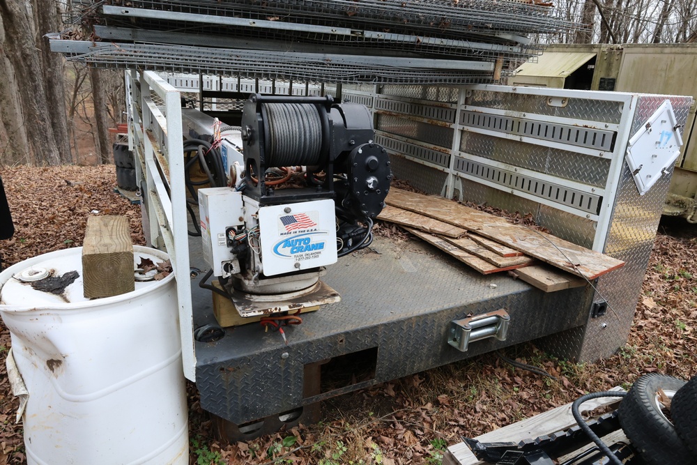 Commercial-class aluminum service truck body with diamond-plate construction, integrated side compartments, interior bin storage, and fold-down rear gate. Excludes the overhead racking or crane.
