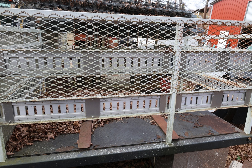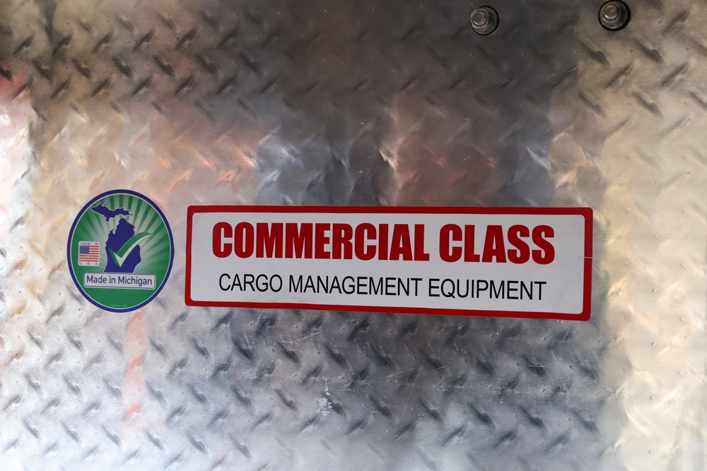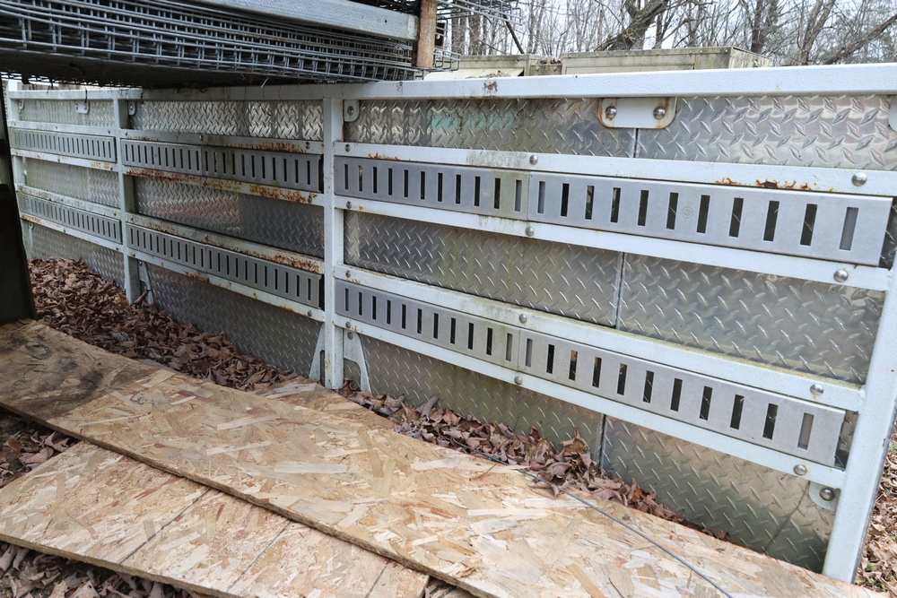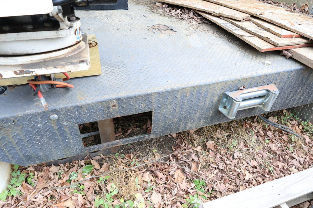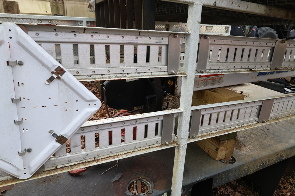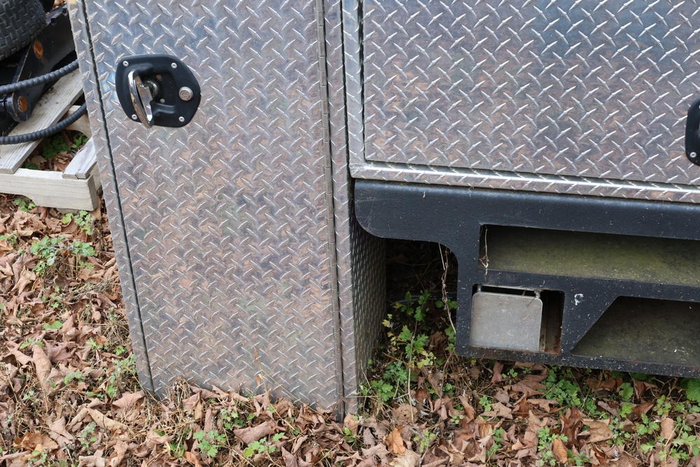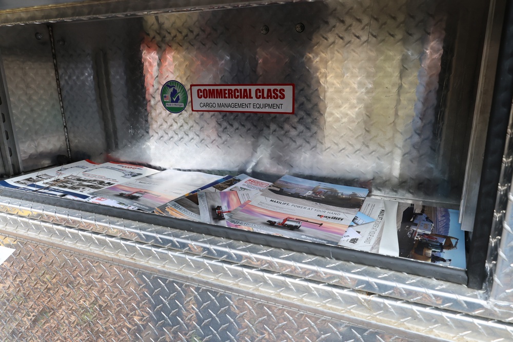 Commercial-class aluminum service truck body with diamond-plate construction, integrated side compartments, interior bin storage, and fold-down rear gate. Excludes the overhead racking or crane.