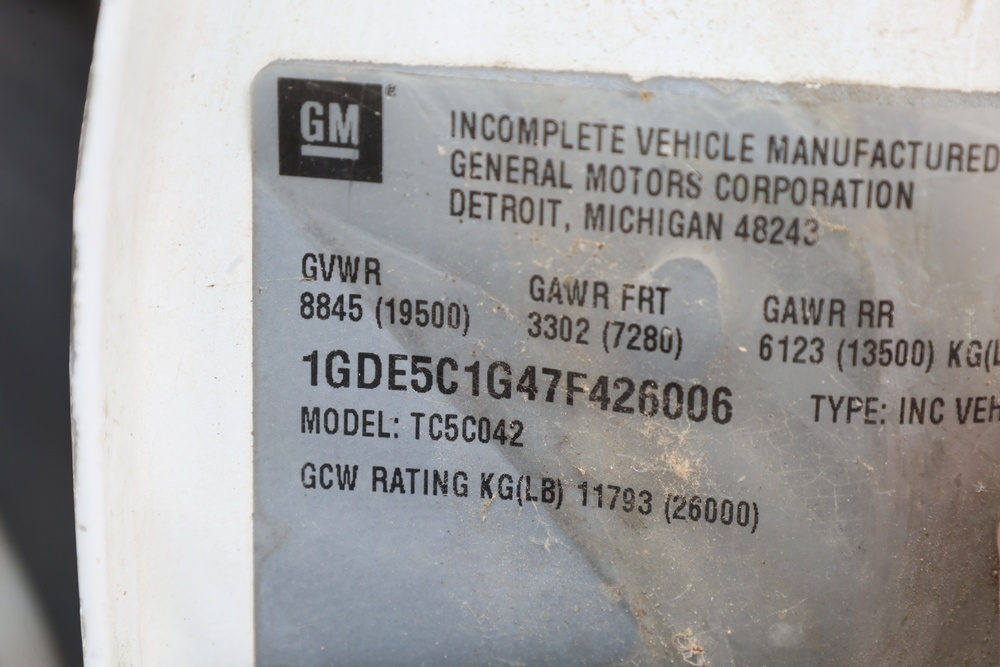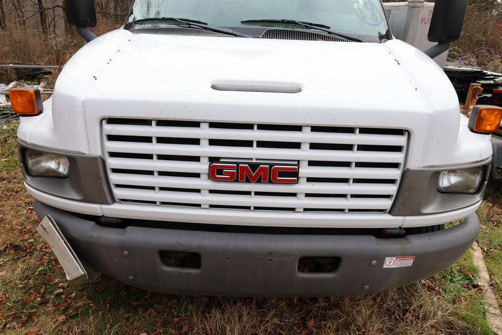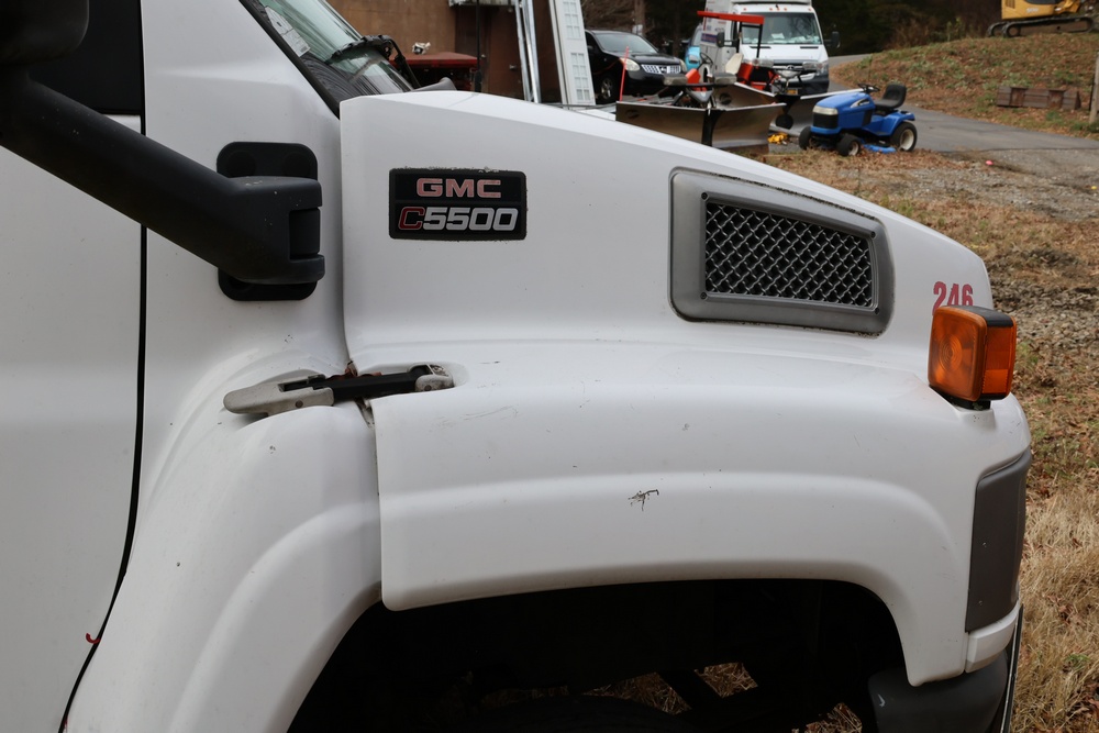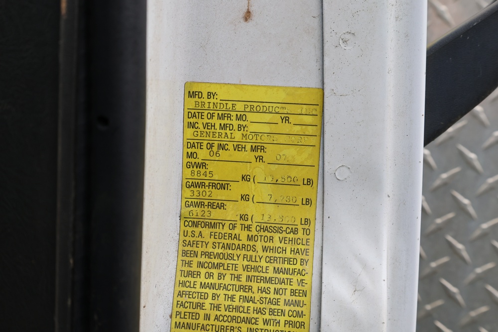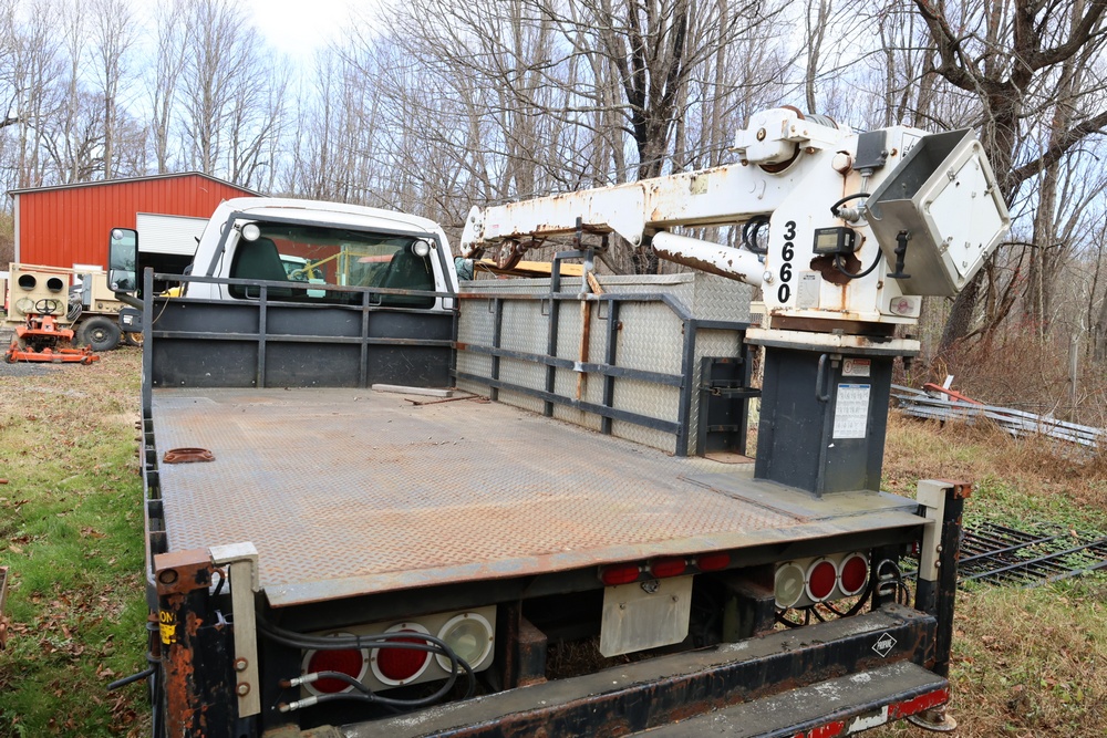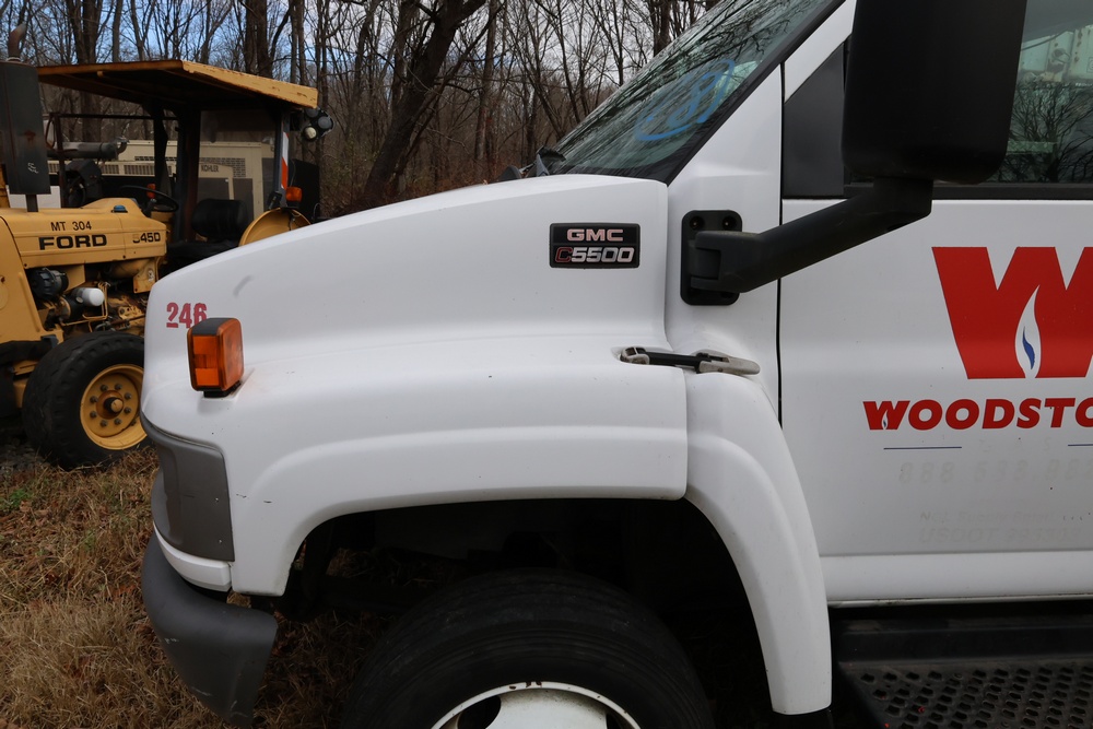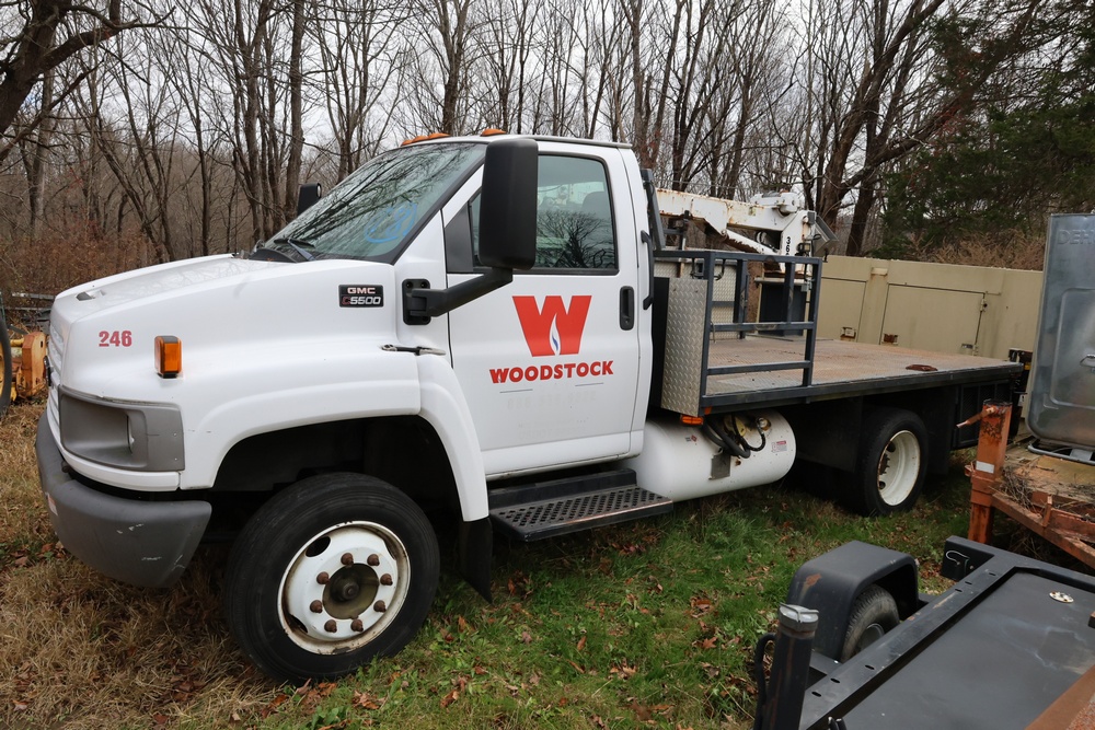 2007 GMC C5500 flatbed service truck. VIN: 1GDE5C1G47F426006. Body: Regular cab with steel flatbed and Brindle Products utility body. Engine: V-8 Propane-powered system with under-bed propane tank visible. Drivetrain: Rear-wheel drive. Odometer reading Last reported: 240,000. Features include dual rear wheels, Liftmoore Model 3660 crane with diagnostic module and load chart, side tool cabinets, running boards, and standard GMC truck interior with center console and gauge cluster. Seller reports: runs and drives.