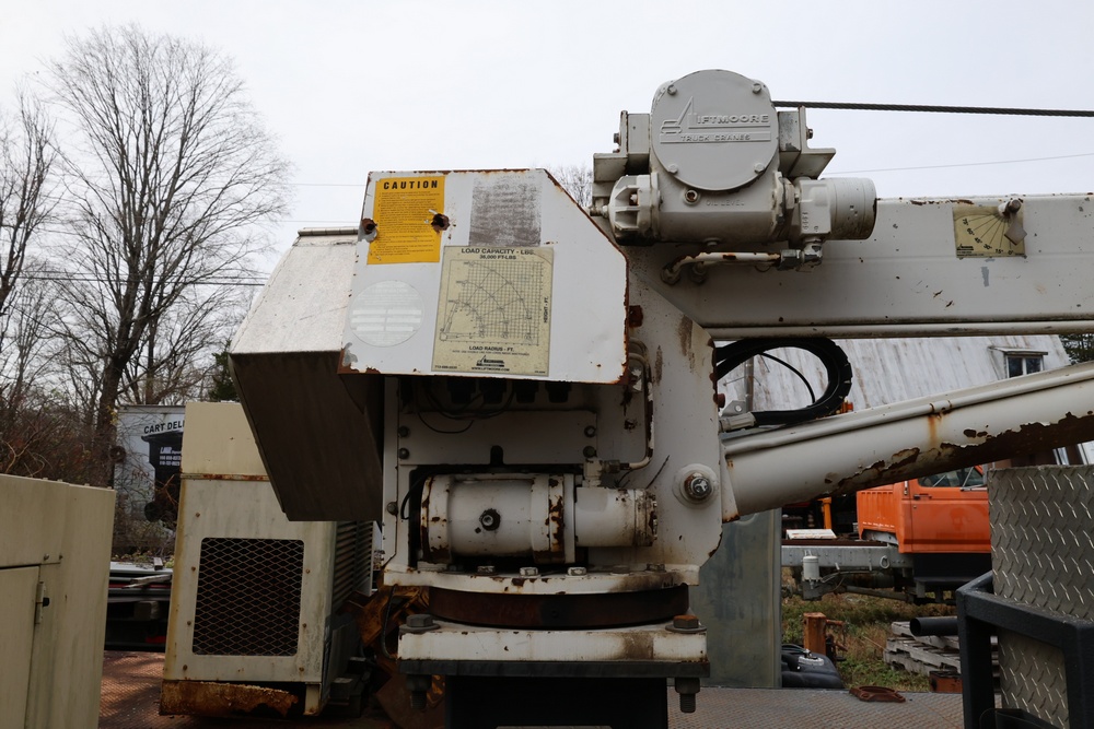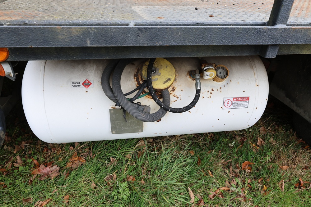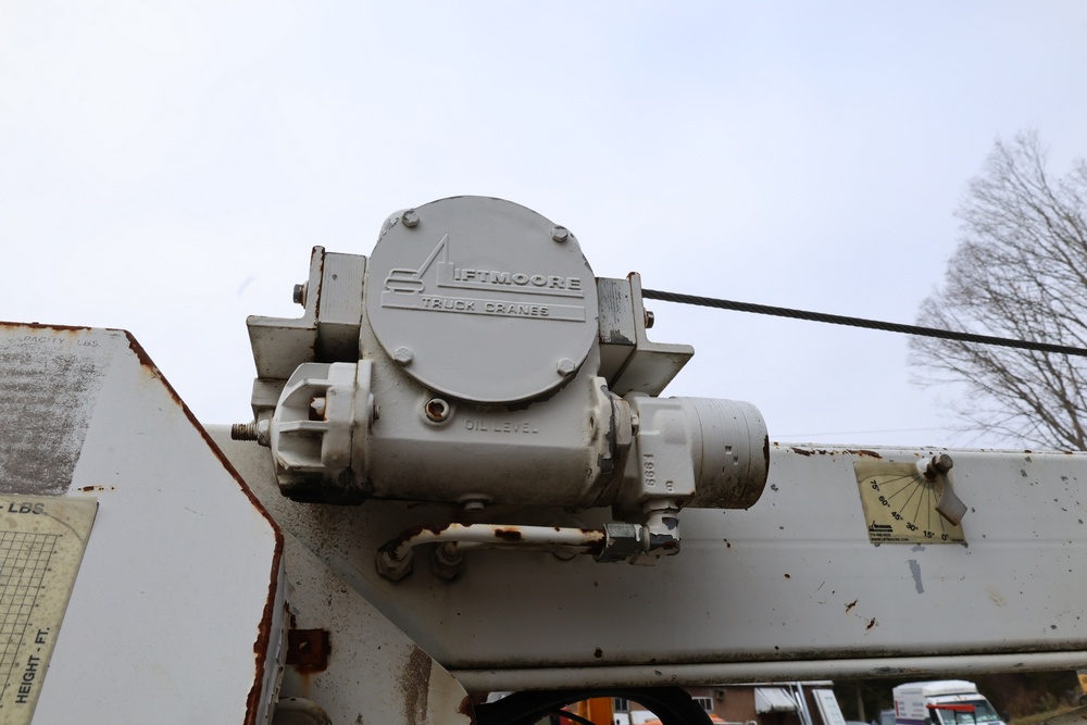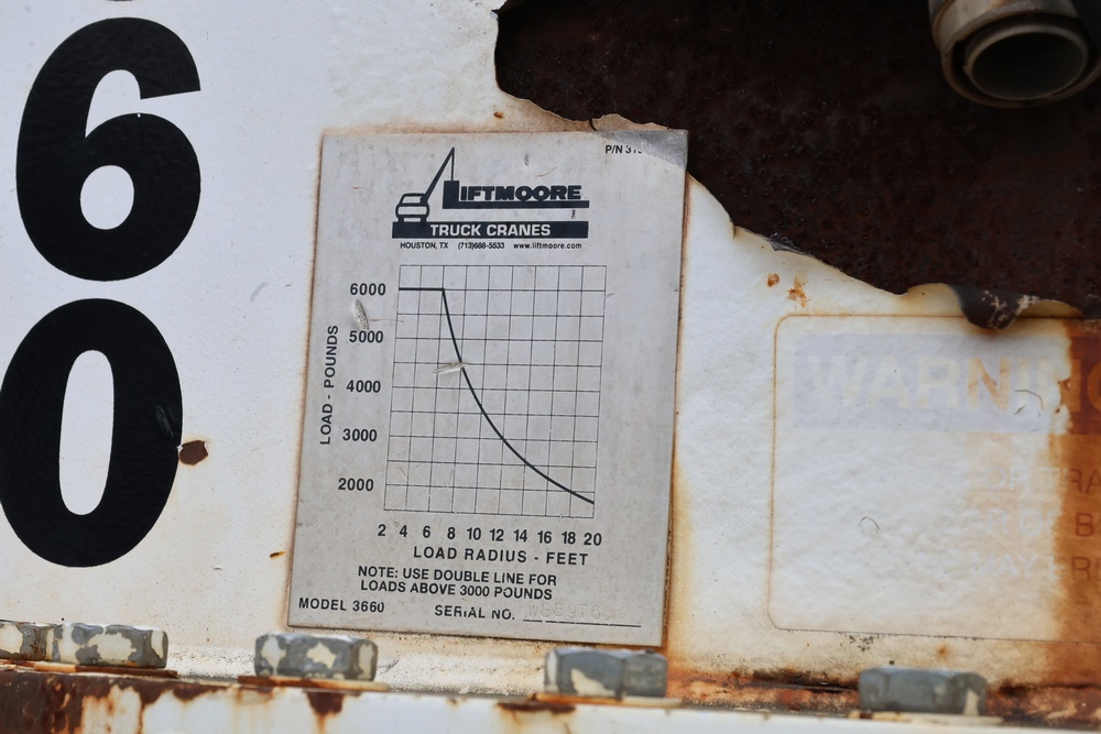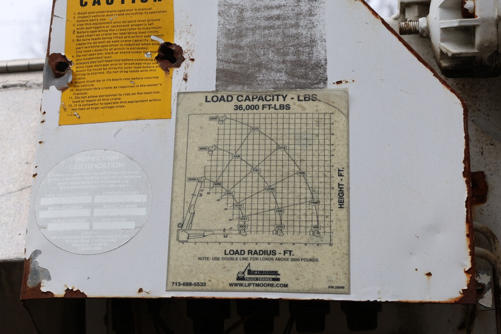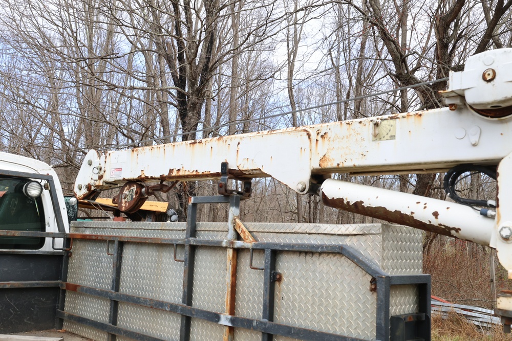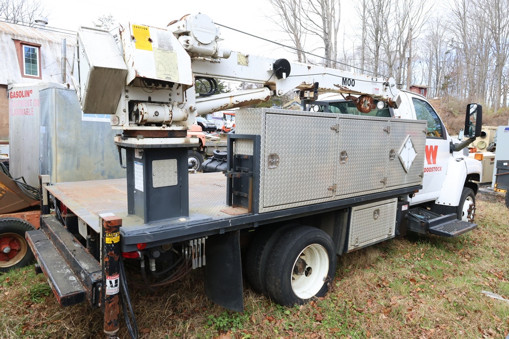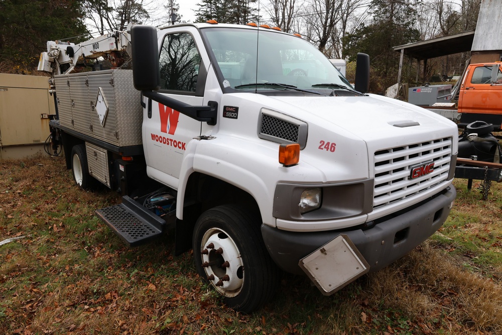 2007 GMC C5500 flatbed service truck. VIN: 1GDE5C1G47F426006. Body: Regular cab with steel flatbed and Brindle Products utility body. Engine: V-8 Propane-powered system with under-bed propane tank visible. Drivetrain: Rear-wheel drive. Odometer reading Last reported: 240,000. Features include dual rear wheels, Liftmoore Model 3660 crane with diagnostic module and load chart, side tool cabinets, running boards, and standard GMC truck interior with center console and gauge cluster. Seller reports: runs and drives.