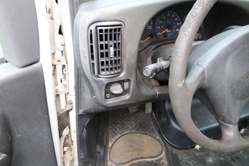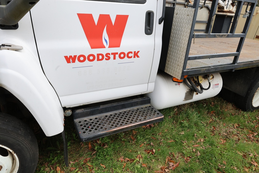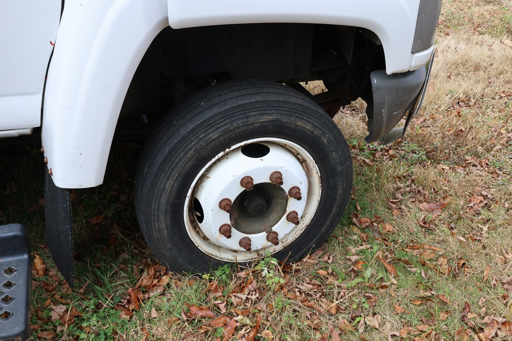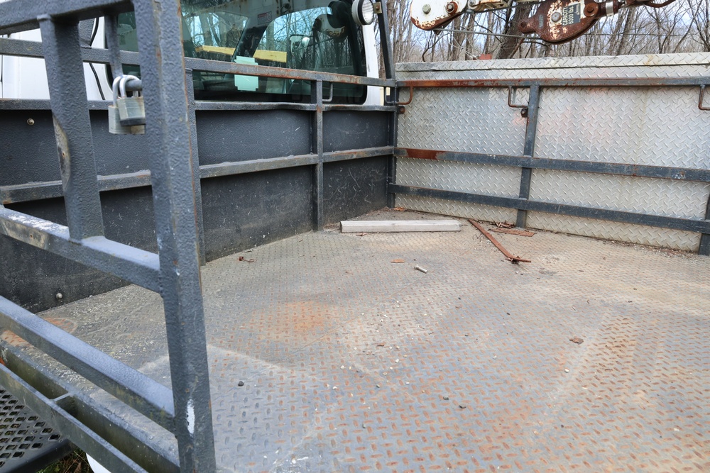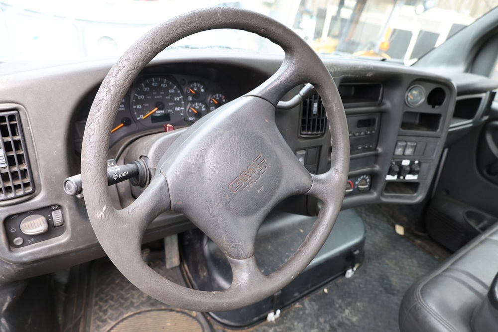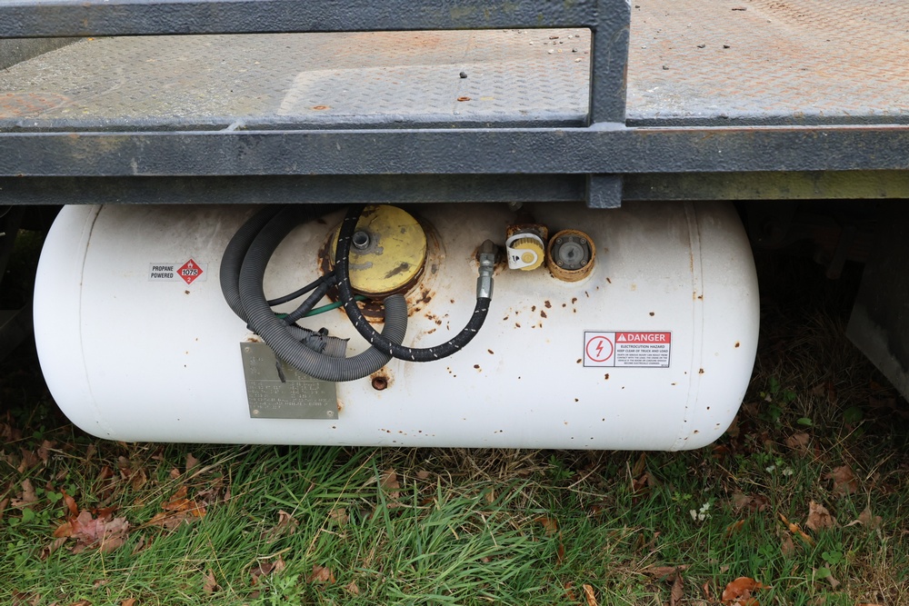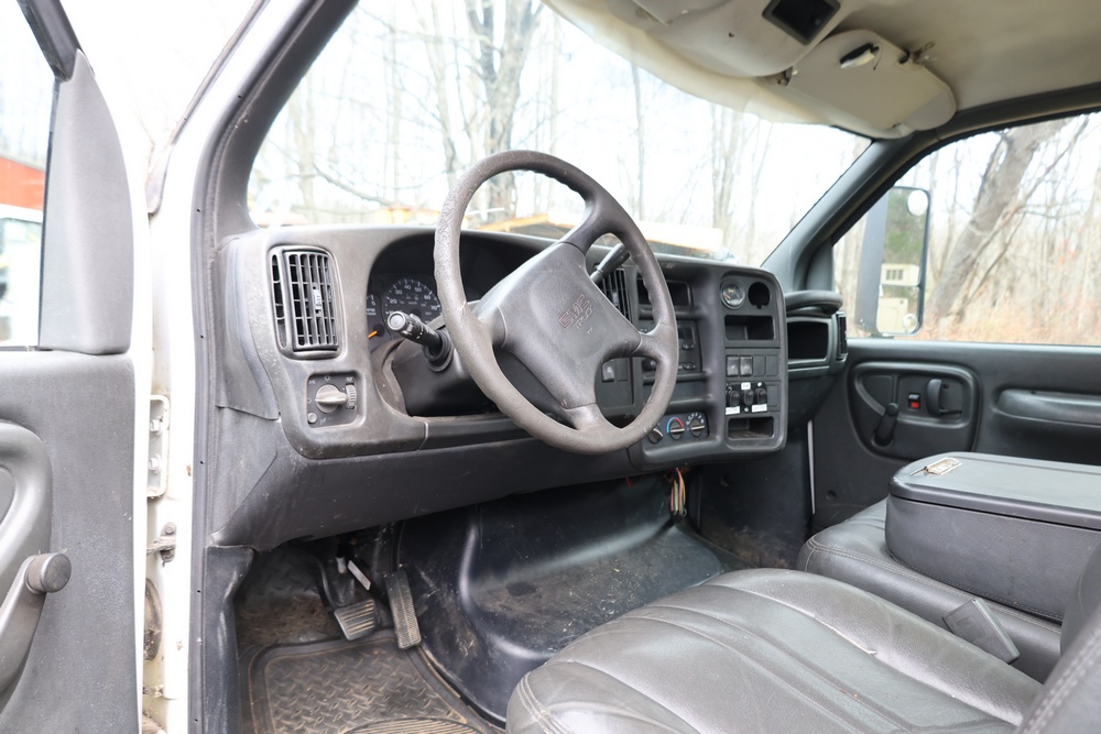 2007 GMC C5500 flatbed service truck. VIN: 1GDE5C1G47F426006. Body: Regular cab with steel flatbed and Brindle Products utility body. Engine: V-8 Propane-powered system with under-bed propane tank visible. Drivetrain: Rear-wheel drive. Odometer reading Last reported: 240,000. Features include dual rear wheels, Liftmoore Model 3660 crane with diagnostic module and load chart, side tool cabinets, running boards, and standard GMC truck interior with center console and gauge cluster. Seller reports: runs and drives.