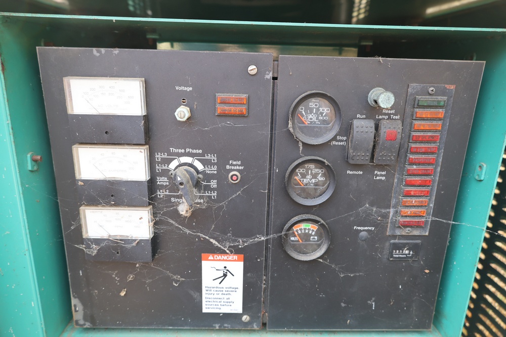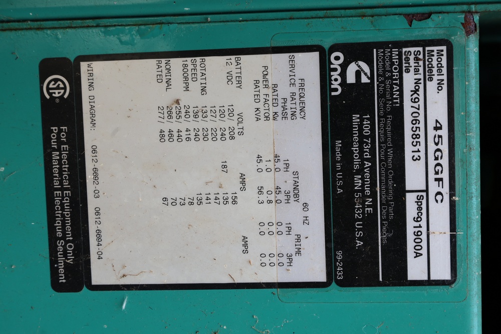 Onan 45GGFC generator set, serial OK970658513, rated 45 kW, 120/208 V, 3-phase. Hour meter reading 1312. Seller reports sat for 2 years, ran when removed, turns over.