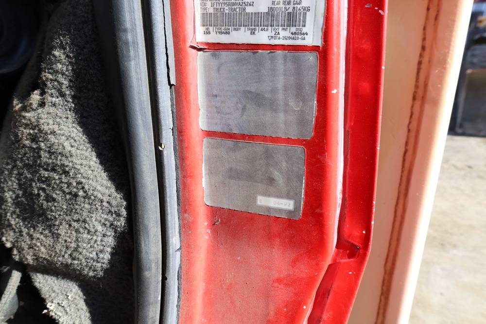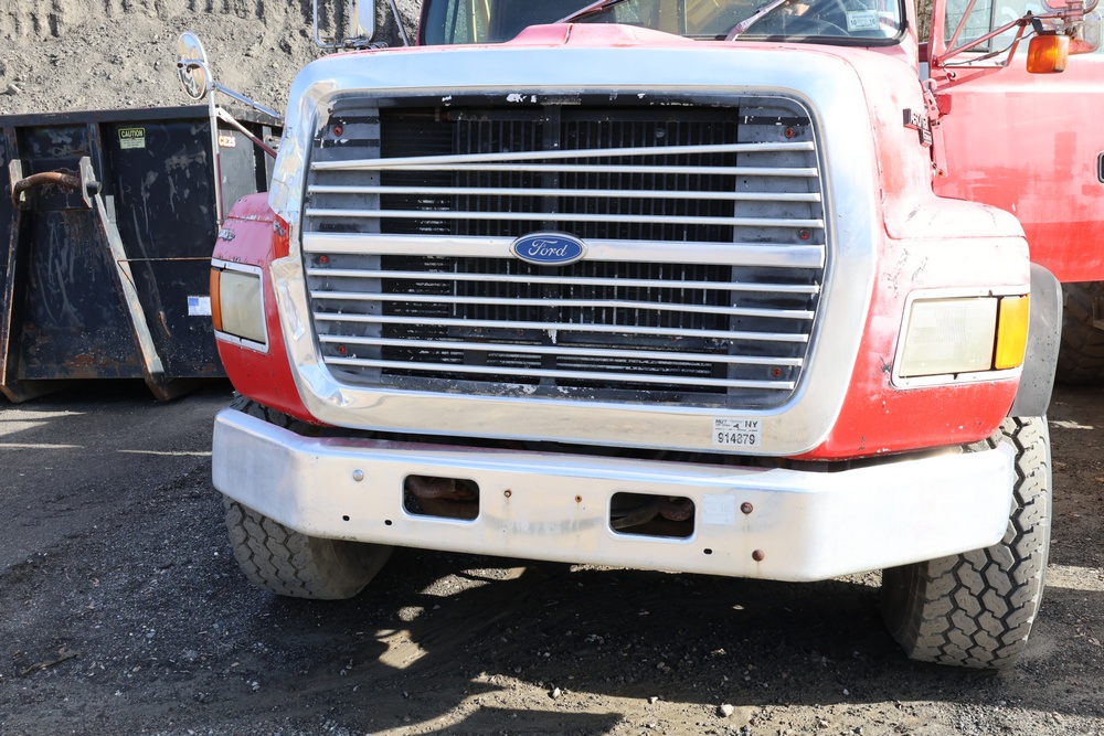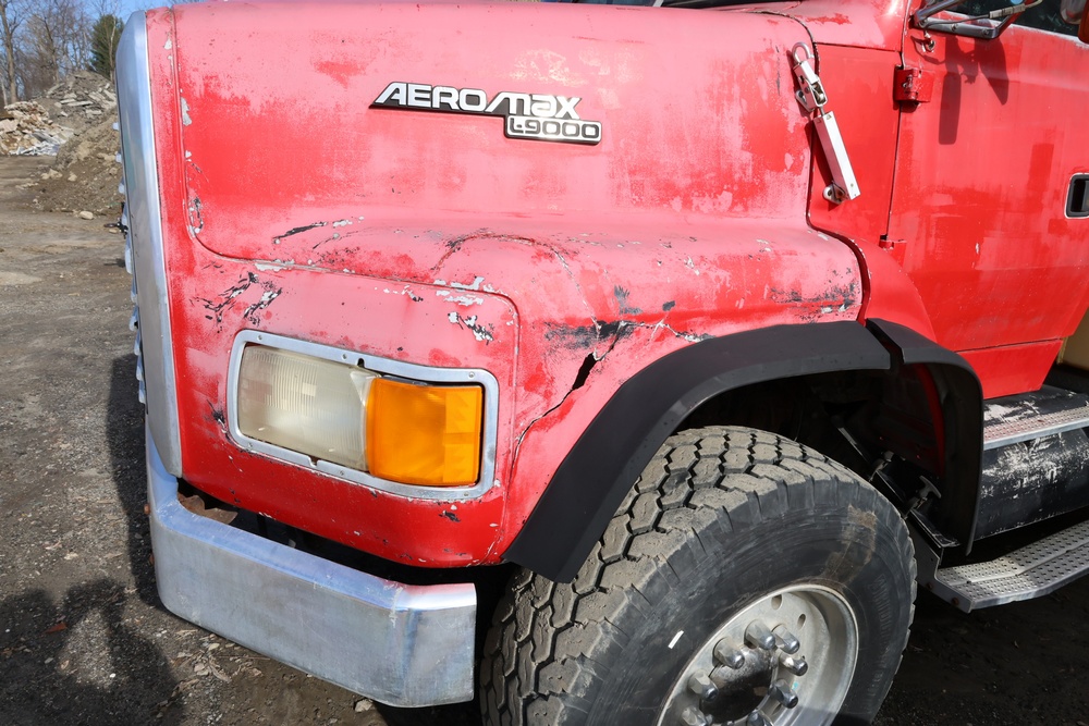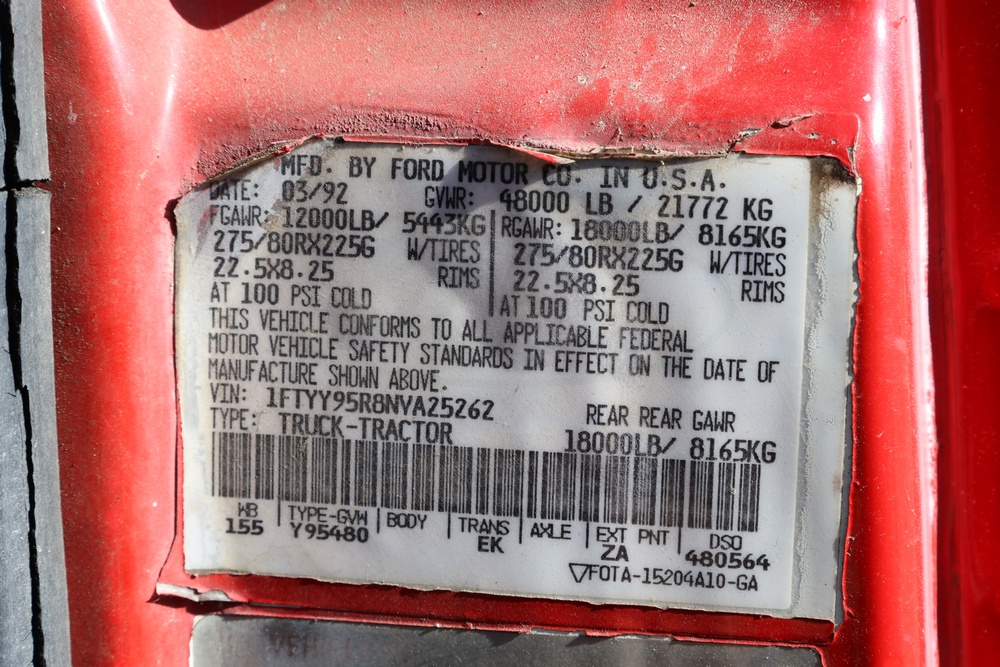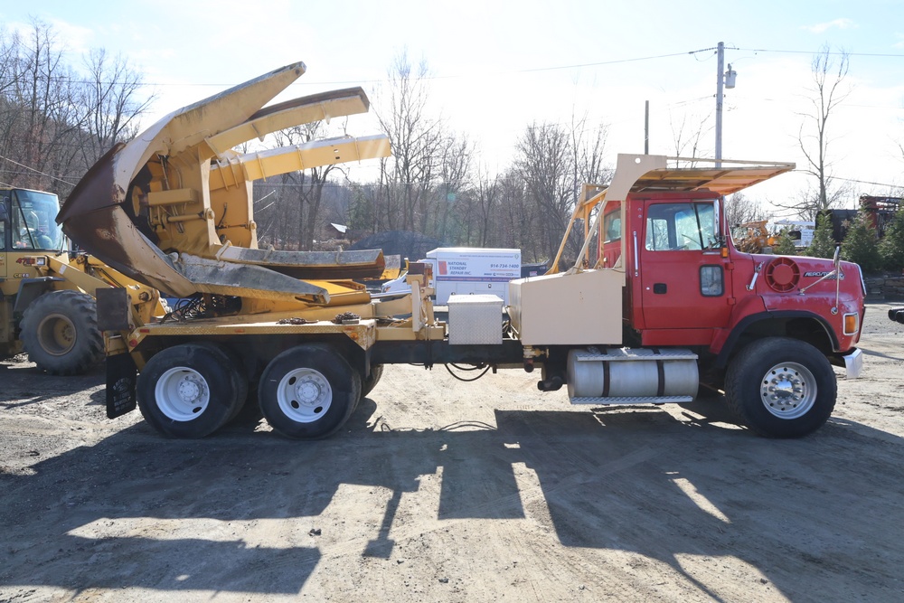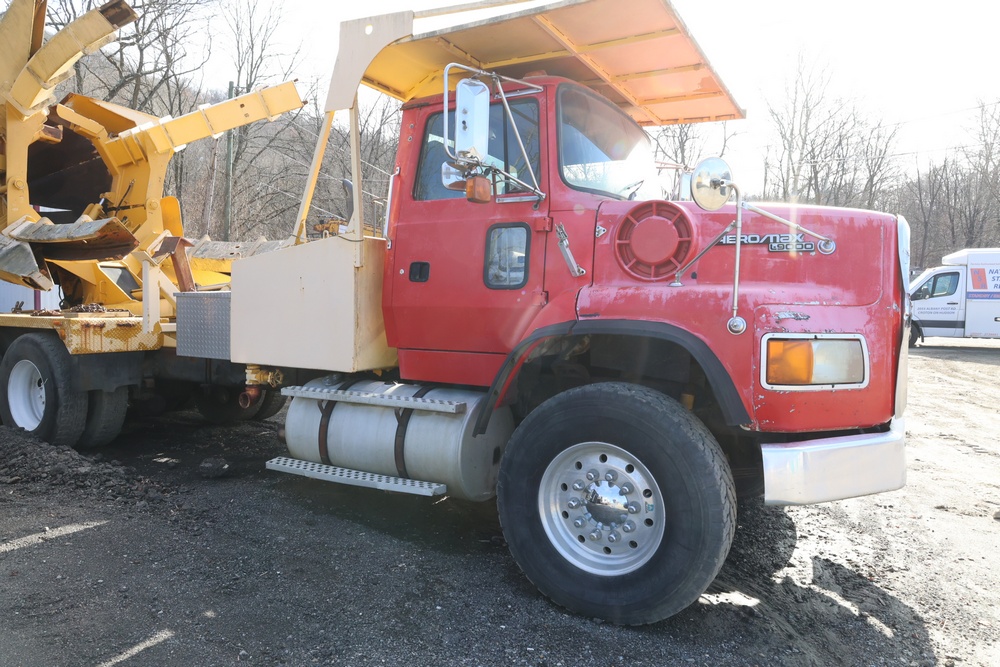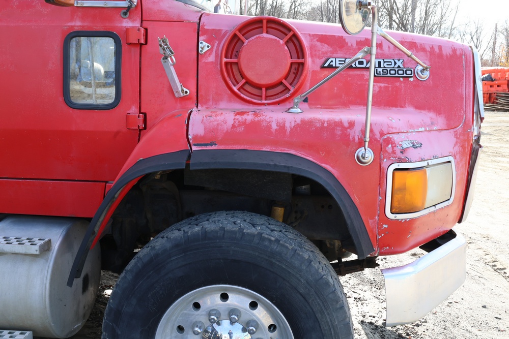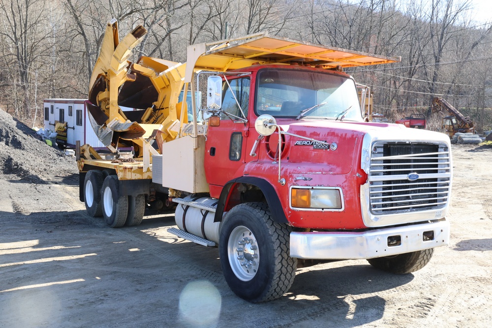 1992 Ford AeroMax L9000 truck-tractor with rear-mounted Big John model 95 tree spade apparatus. VIN: 1FTYY95R8NVA25262. Engine: Cummins N14. Body: Tandem-axle cab-and-chassis configured with a large hydraulically operated tree spade attachment, air ride suspension. Odometer reading: 127101. Features visible include two-door cab, Clarion overhead radio, PTO controls, tandem rear axles, hydraulic lines and controls for the spade unit. Runs, drives, and operates.
