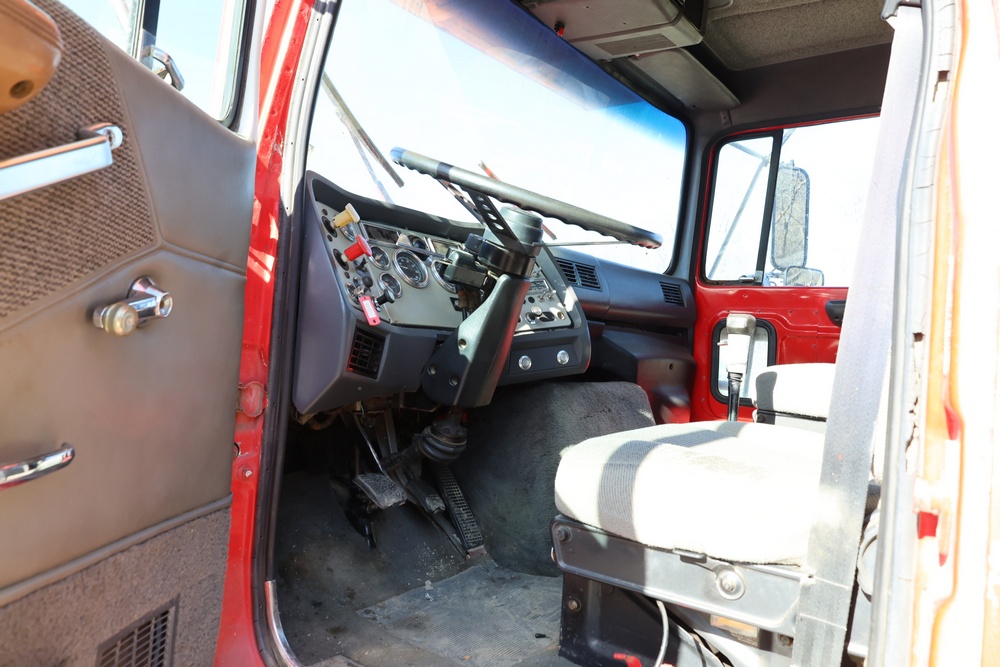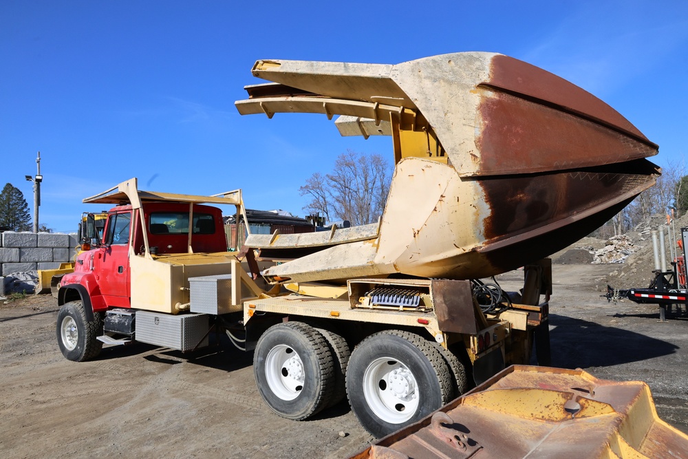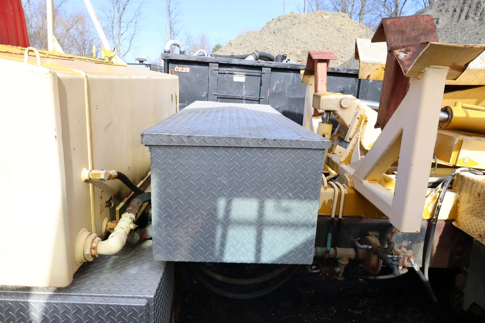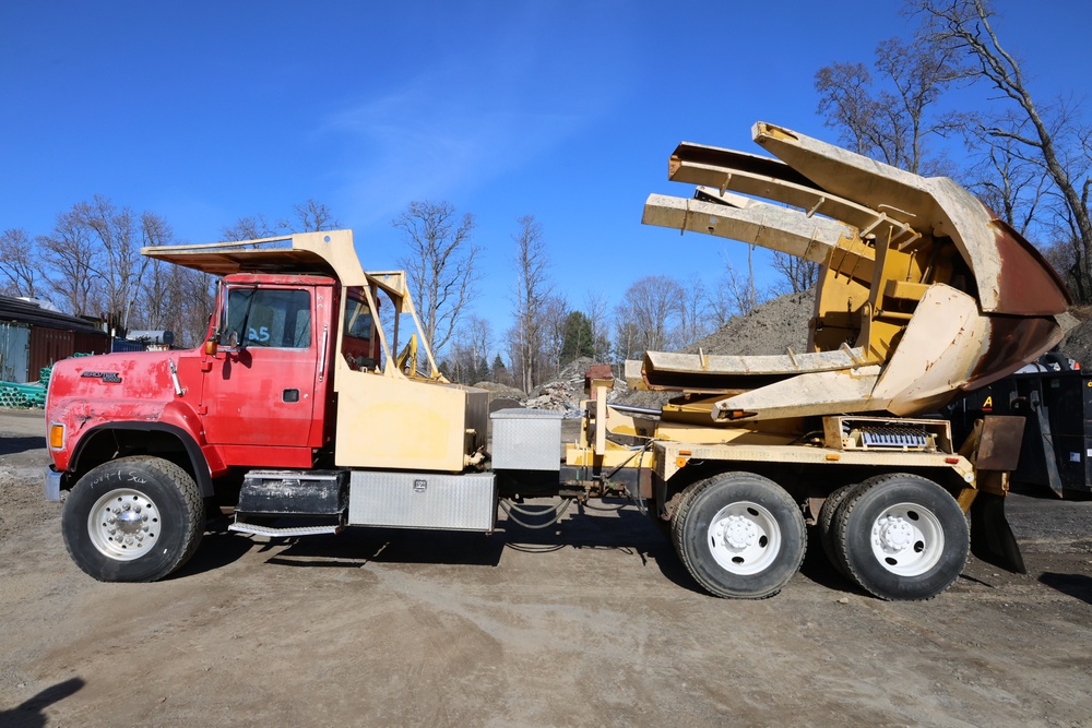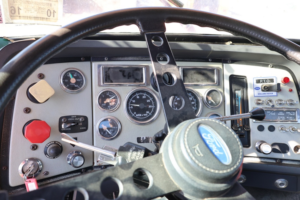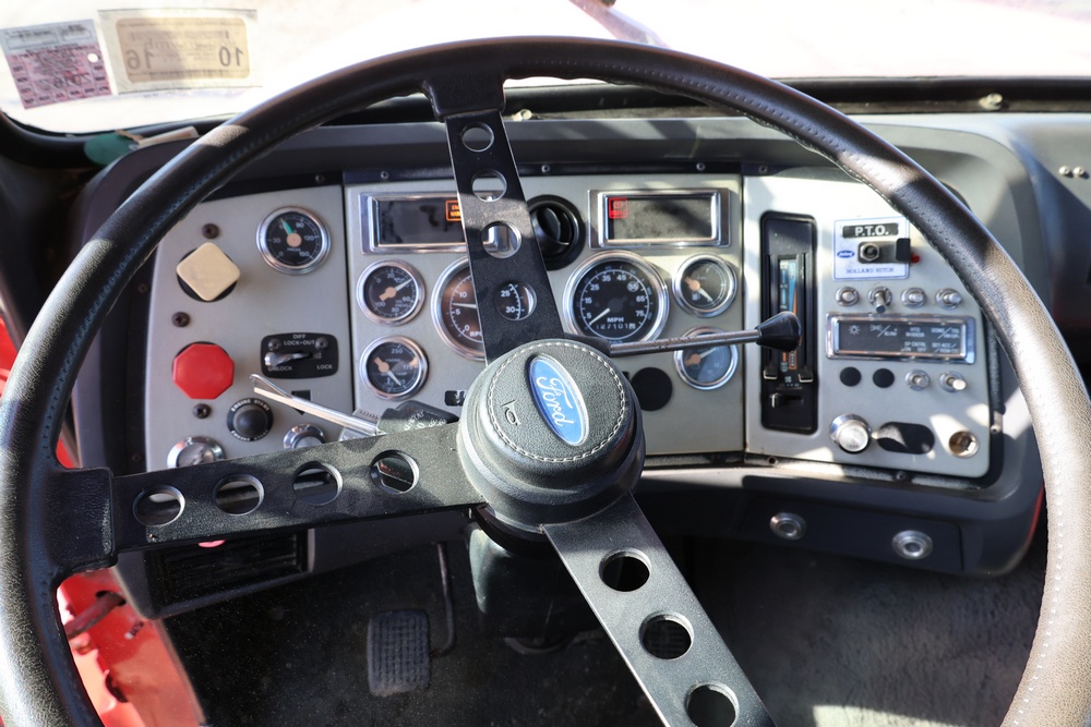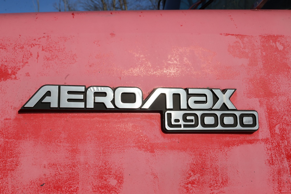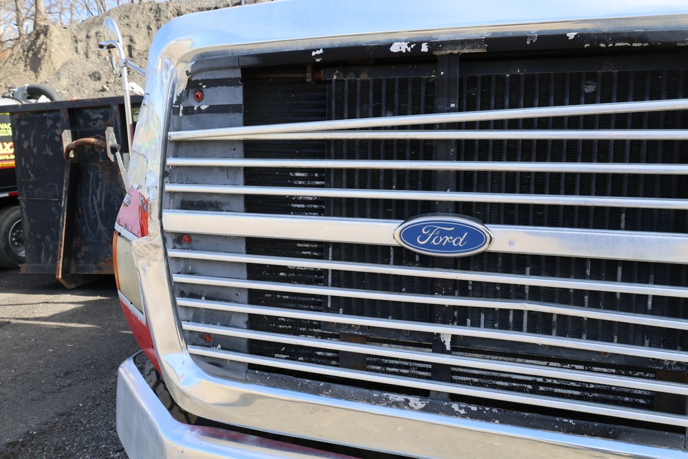 1992 Ford AeroMax L9000 truck-tractor with rear-mounted Big John model 95 tree spade apparatus. VIN: 1FTYY95R8NVA25262. Engine: Cummins N14. Body: Tandem-axle cab-and-chassis configured with a large hydraulically operated tree spade attachment, air ride suspension. Odometer reading: 127101. Features visible include two-door cab, Clarion overhead radio, PTO controls, tandem rear axles, hydraulic lines and controls for the spade unit. Runs, drives, and operates.
