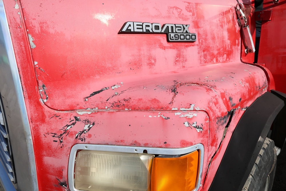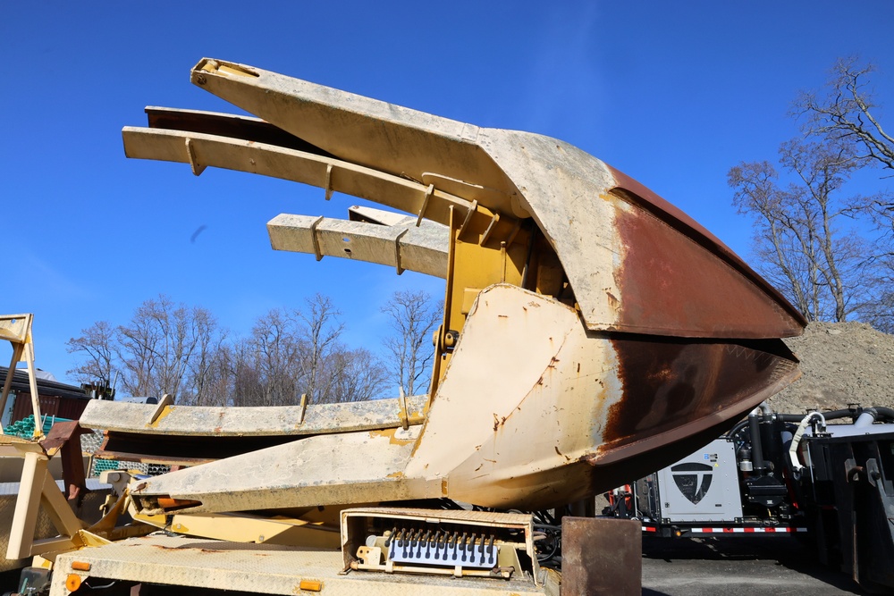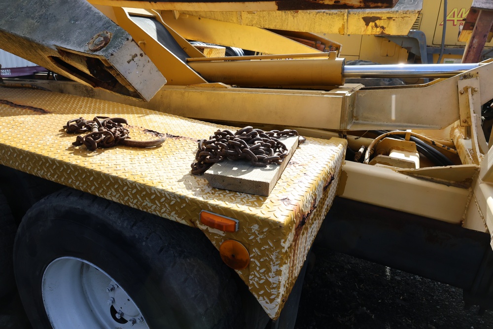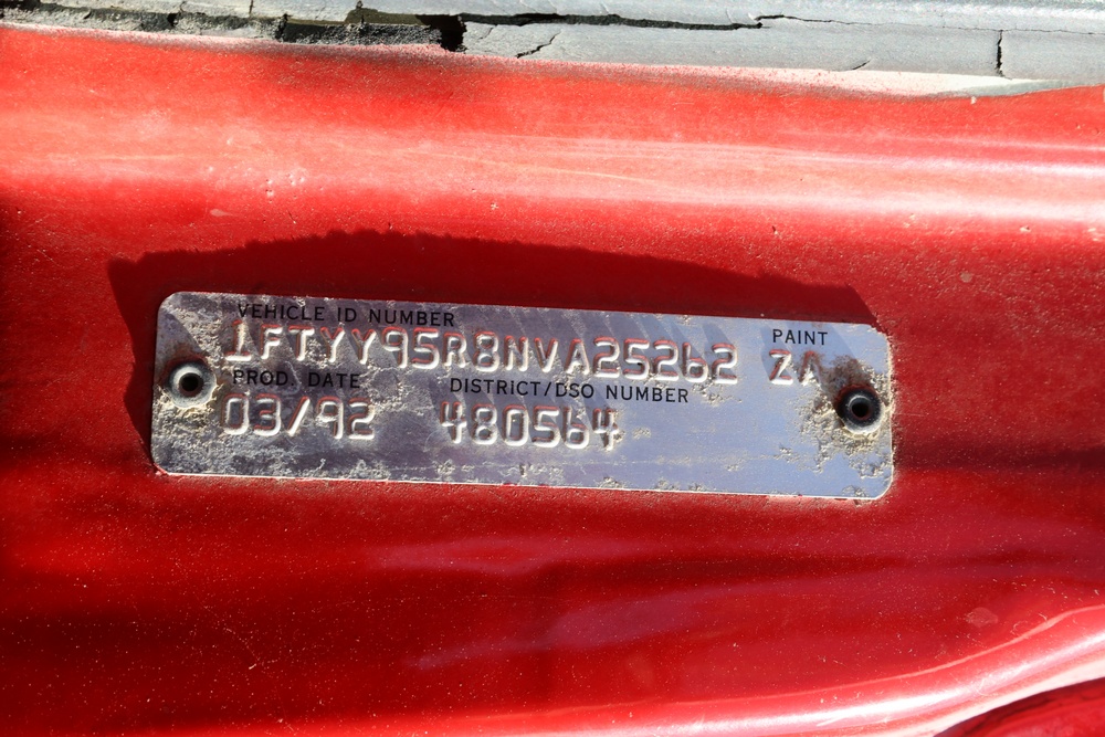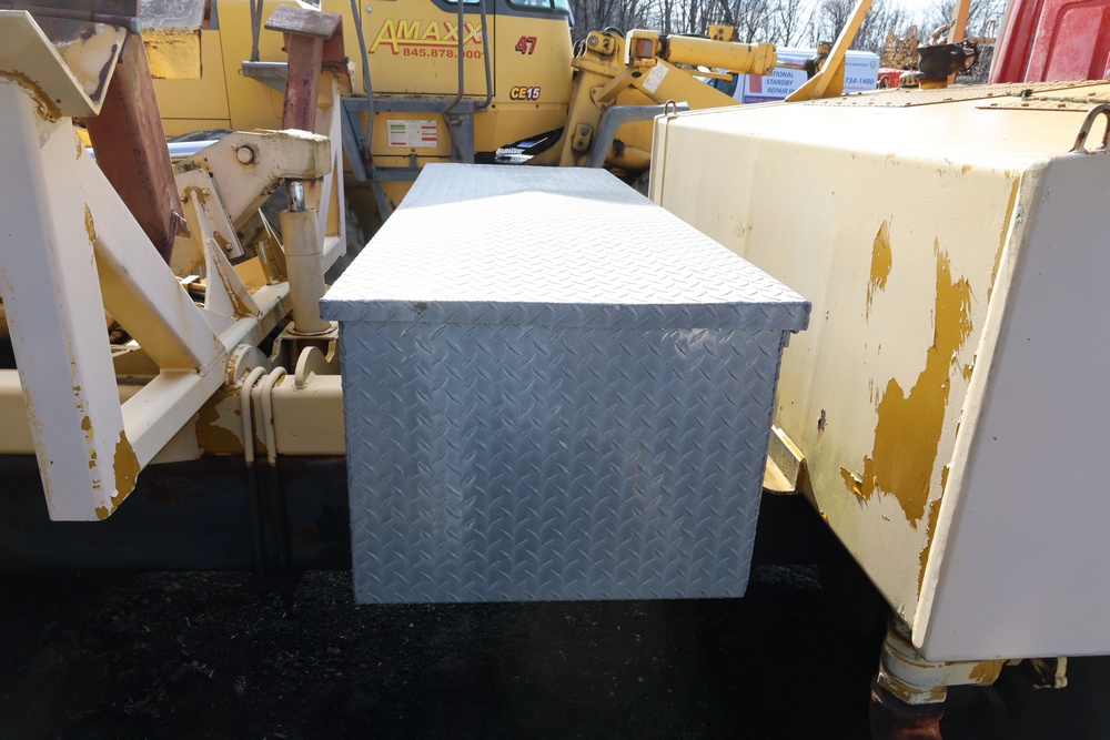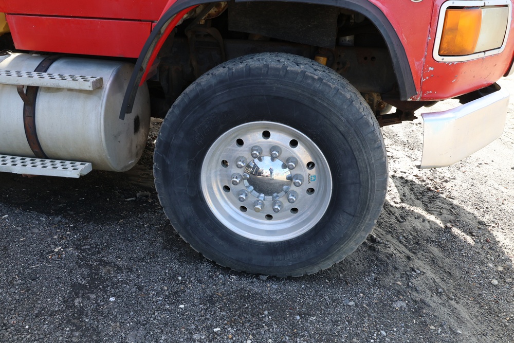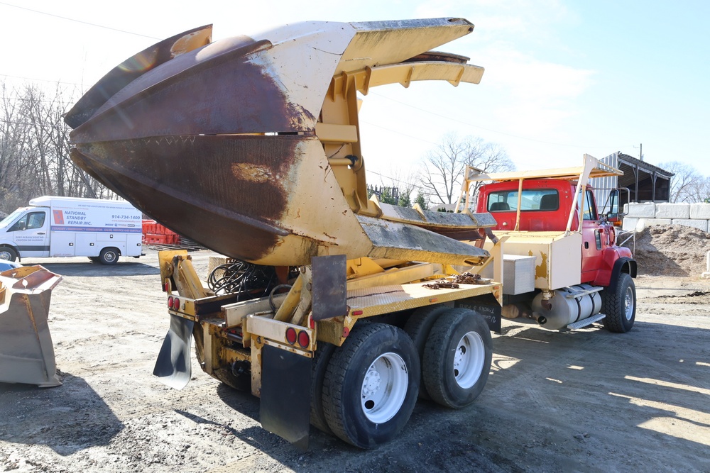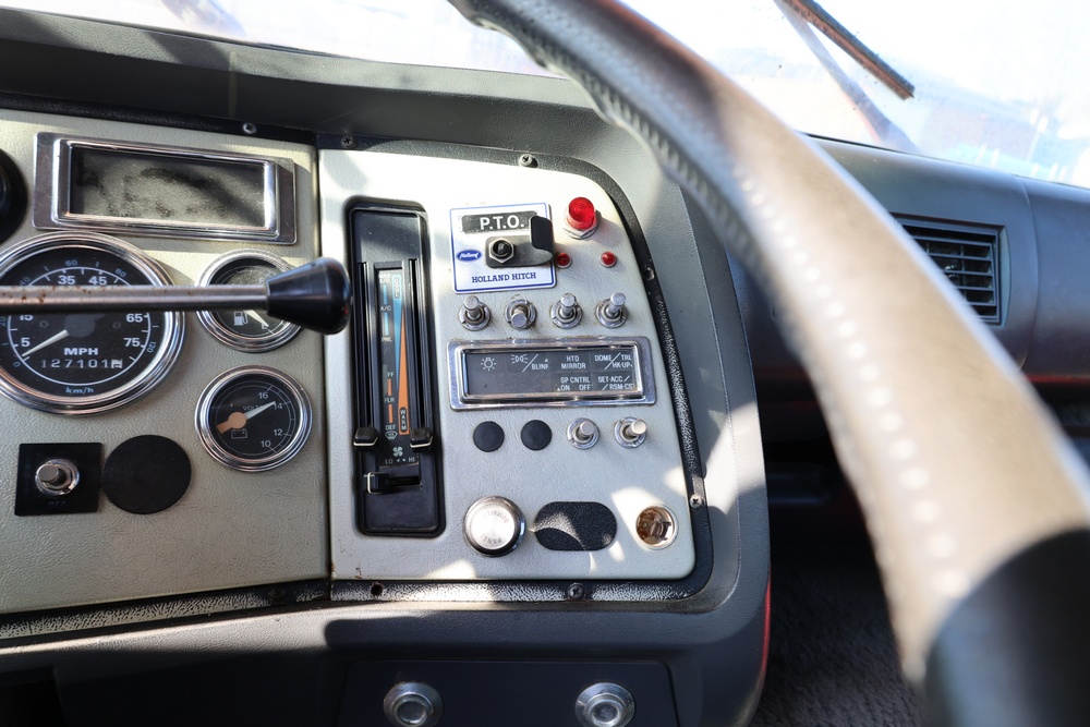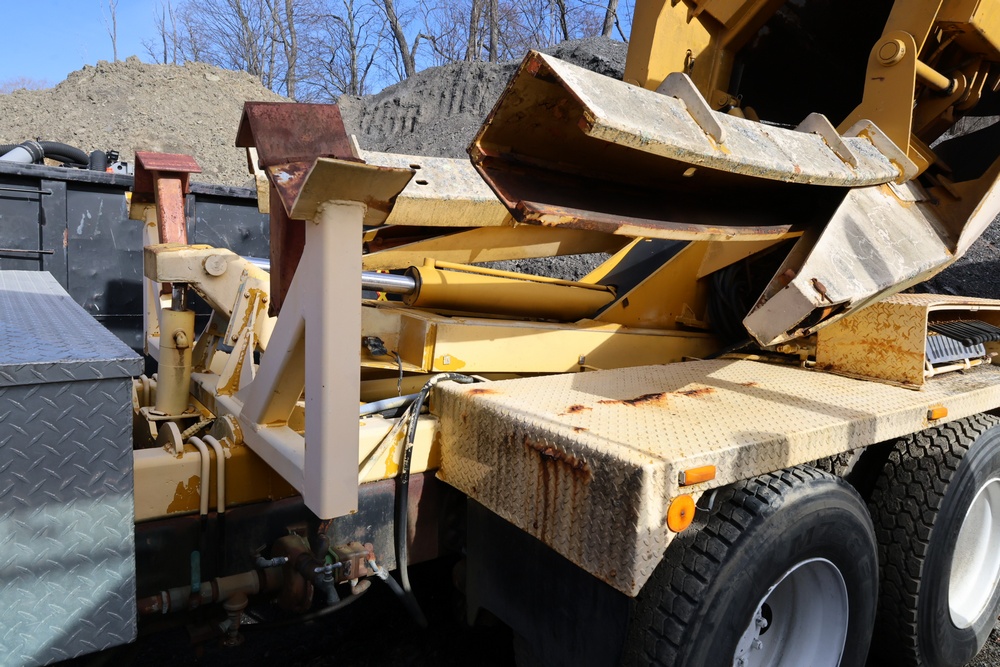 1992 Ford AeroMax L9000 truck-tractor with rear-mounted Big John model 95 tree spade apparatus. VIN: 1FTYY95R8NVA25262. Engine: Cummins N14. Body: Tandem-axle cab-and-chassis configured with a large hydraulically operated tree spade attachment, air ride suspension. Odometer reading: 127101. Features visible include two-door cab, Clarion overhead radio, PTO controls, tandem rear axles, hydraulic lines and controls for the spade unit. Runs, drives, and operates.
