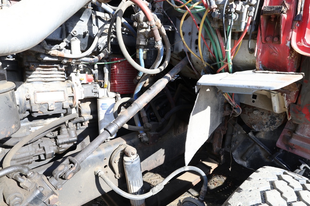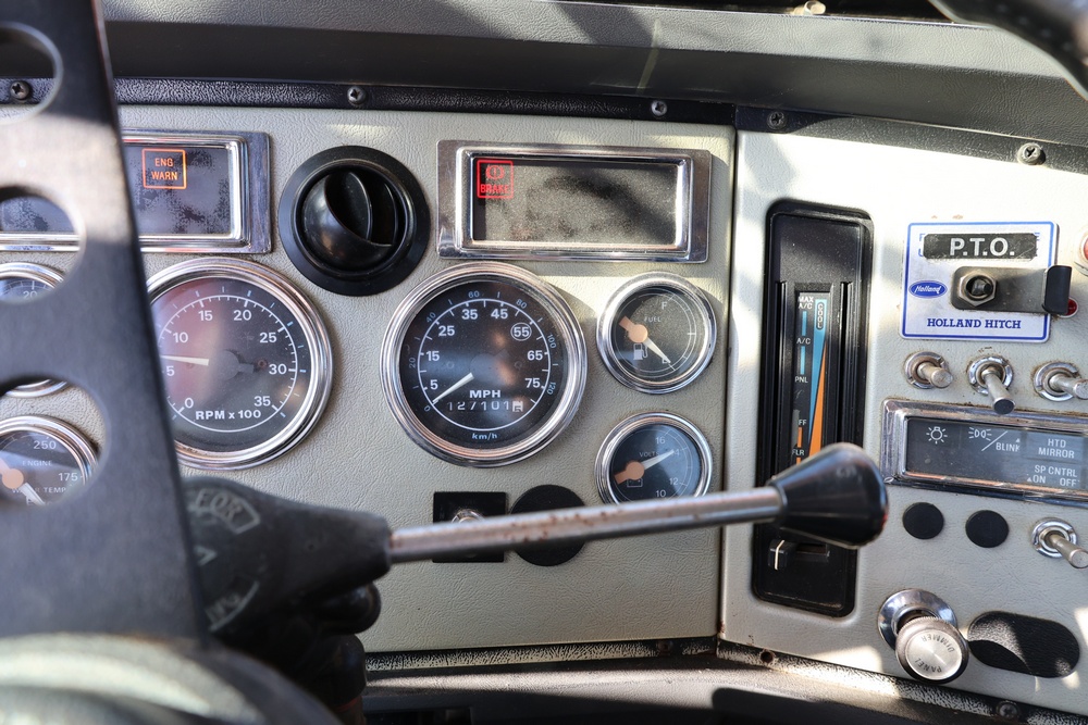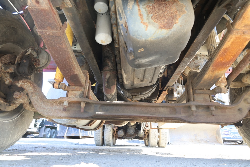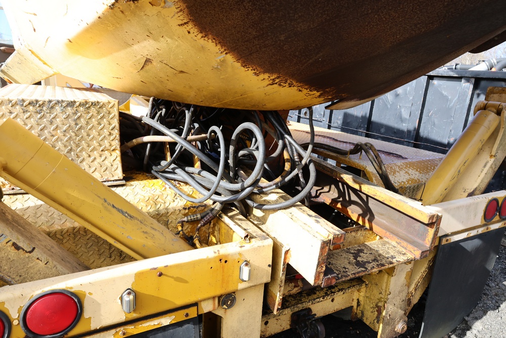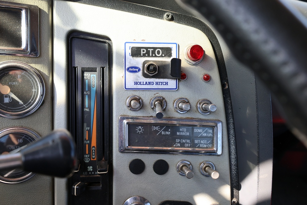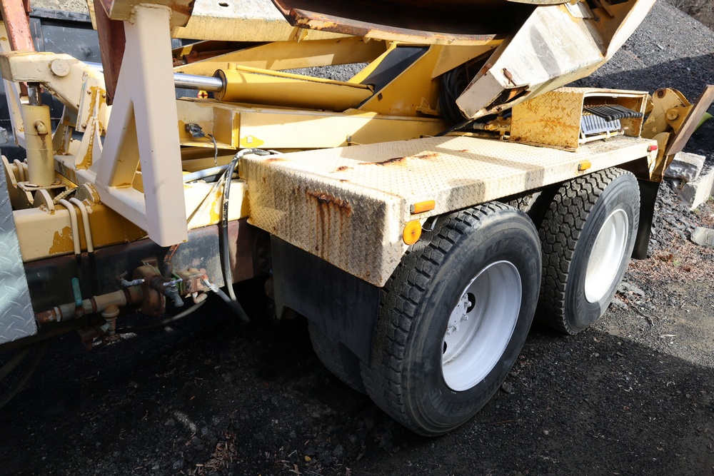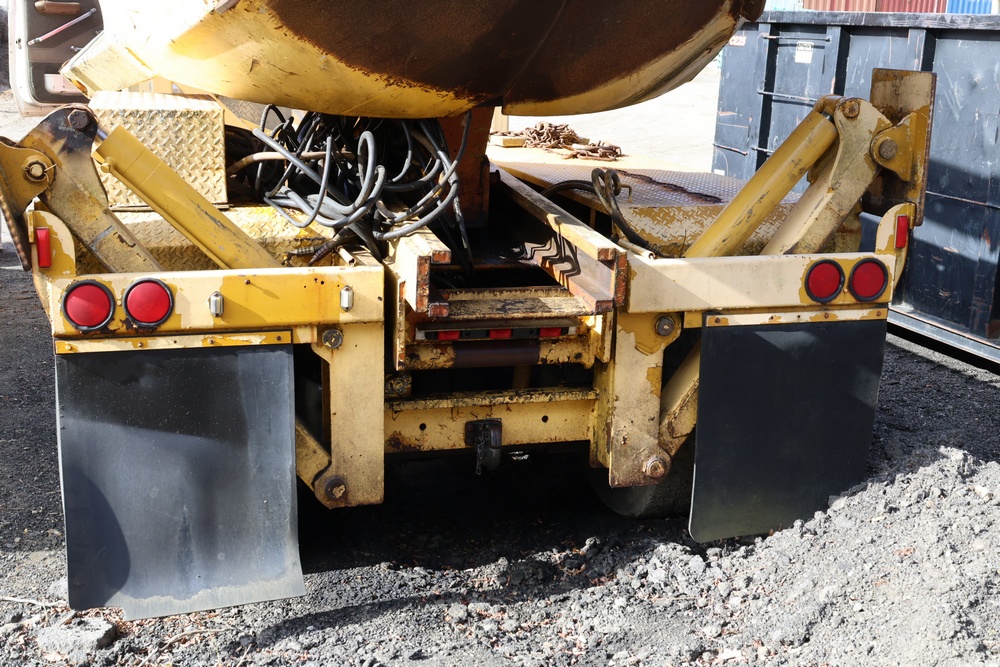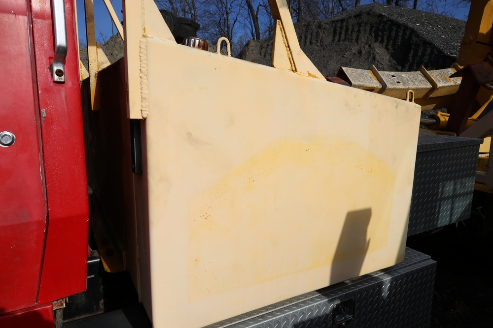 1992 Ford AeroMax L9000 truck-tractor with rear-mounted Big John model 95 tree spade apparatus. VIN: 1FTYY95R8NVA25262. Engine: Cummins N14. Body: Tandem-axle cab-and-chassis configured with a large hydraulically operated tree spade attachment, air ride suspension. Odometer reading: 127101. Features visible include two-door cab, Clarion overhead radio, PTO controls, tandem rear axles, hydraulic lines and controls for the spade unit. Runs, drives, and operates.