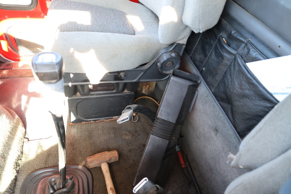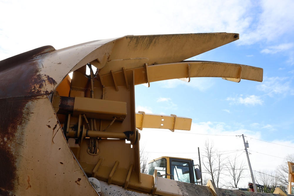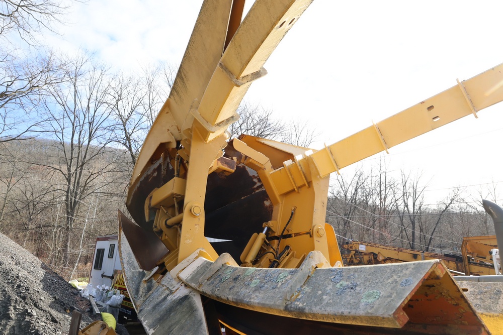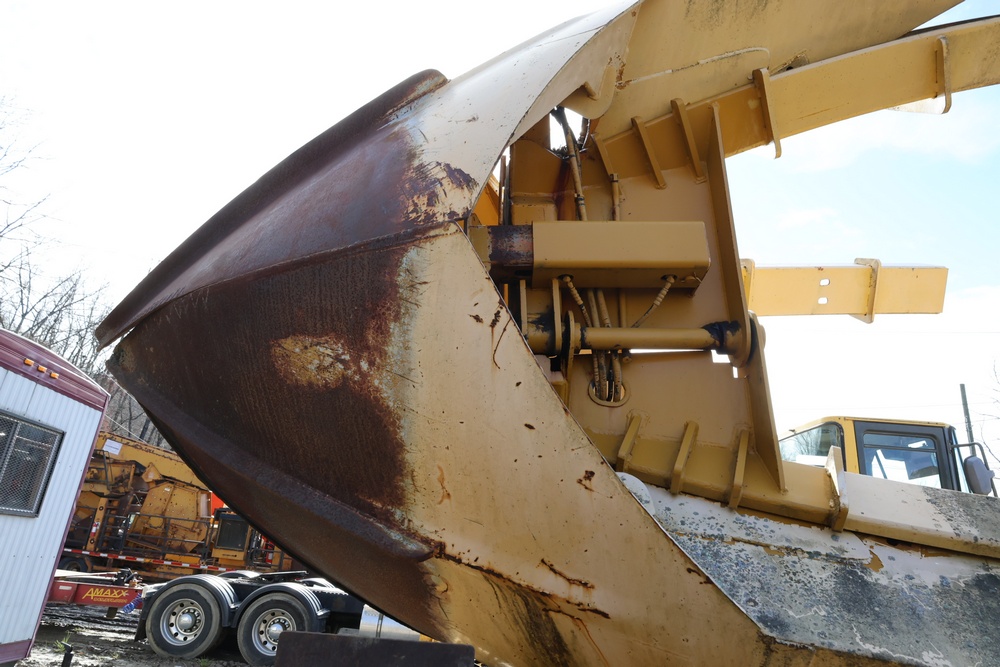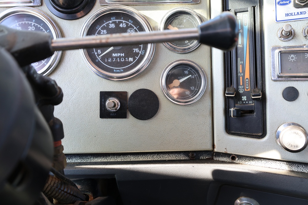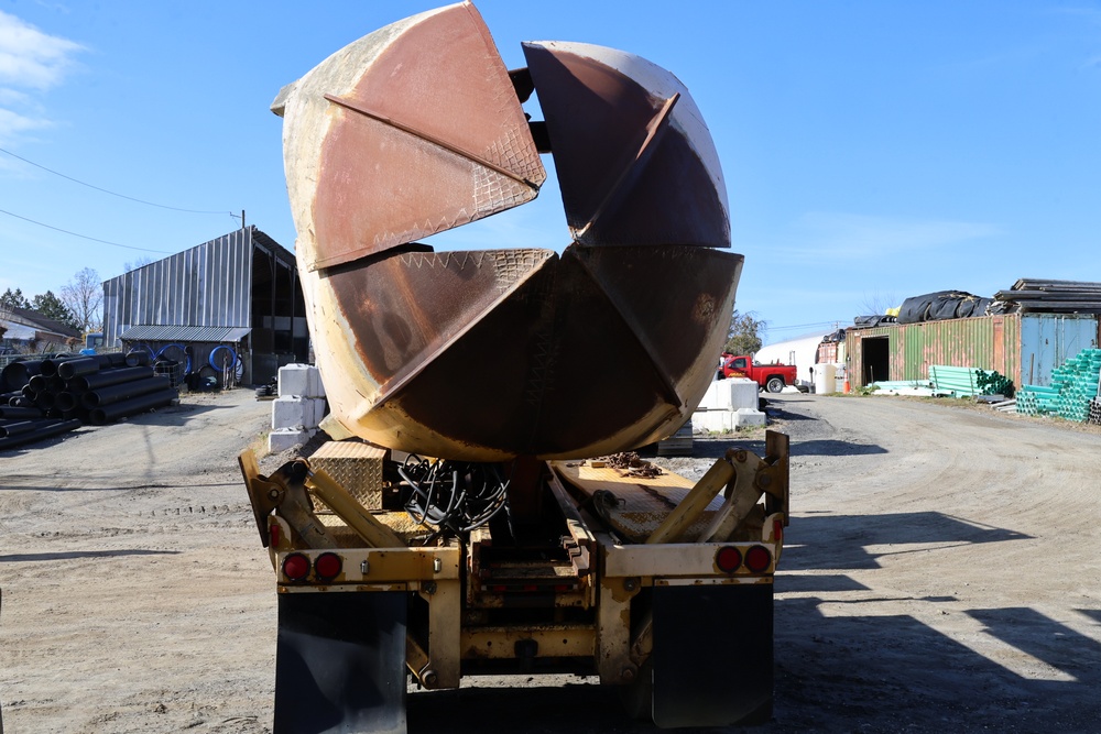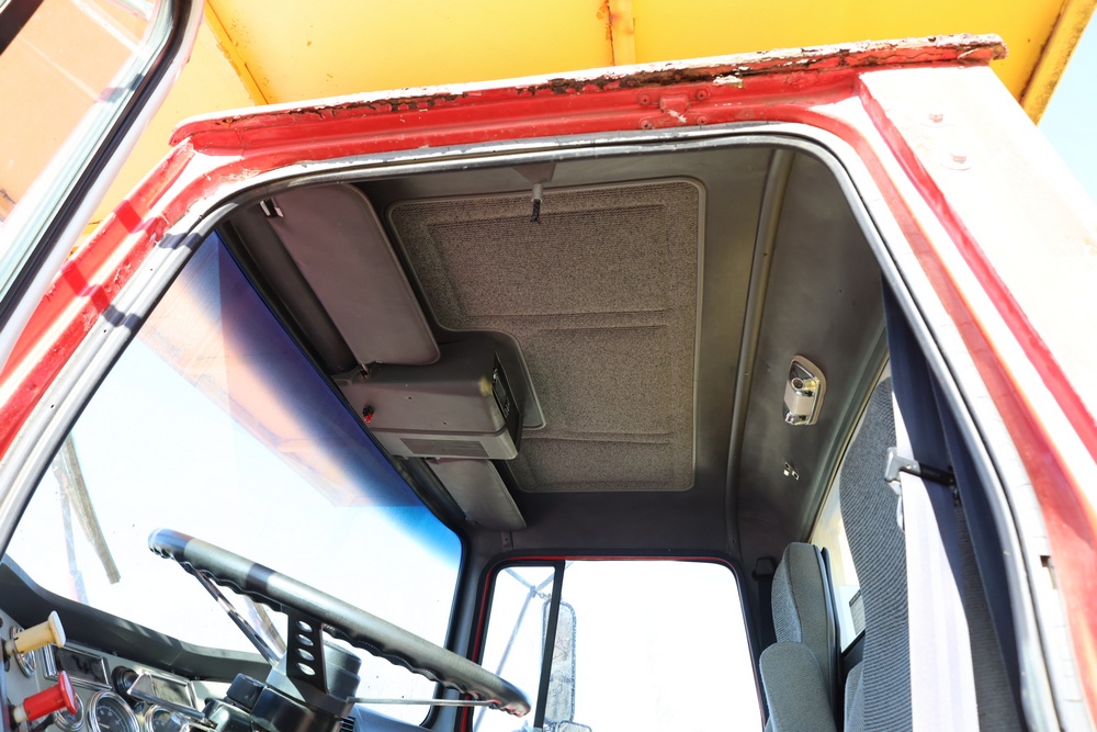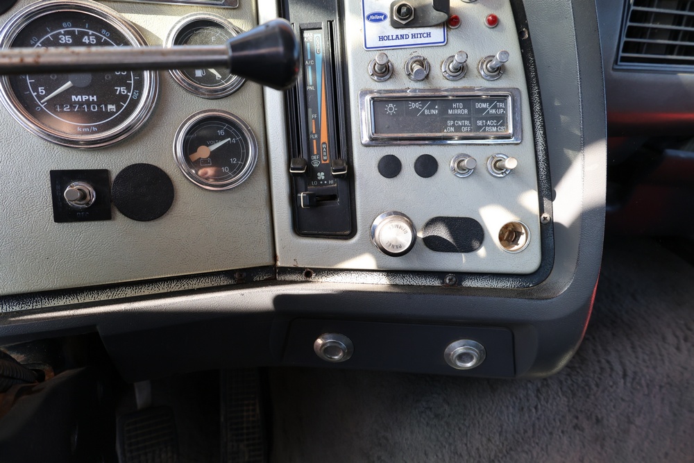 1992 Ford AeroMax L9000 truck-tractor with rear-mounted Big John model 95 tree spade apparatus. VIN: 1FTYY95R8NVA25262. Engine: Cummins N14. Body: Tandem-axle cab-and-chassis configured with a large hydraulically operated tree spade attachment, air ride suspension. Odometer reading: 127101. Features visible include two-door cab, Clarion overhead radio, PTO controls, tandem rear axles, hydraulic lines and controls for the spade unit. Runs, drives, and operates.