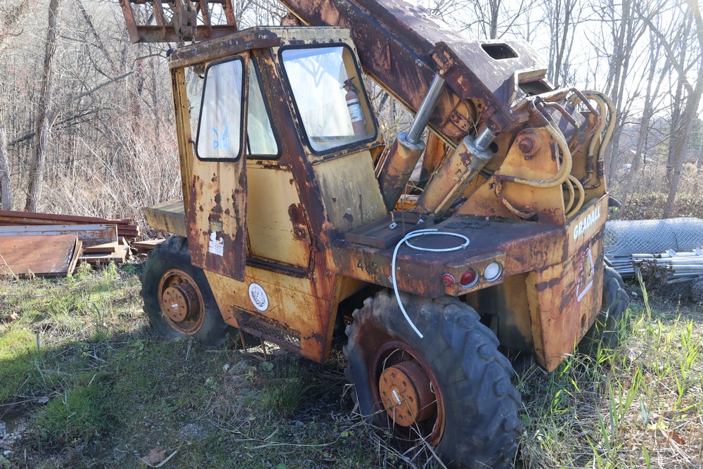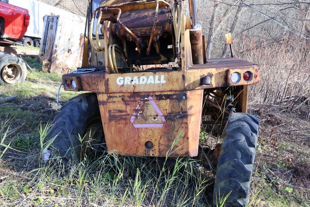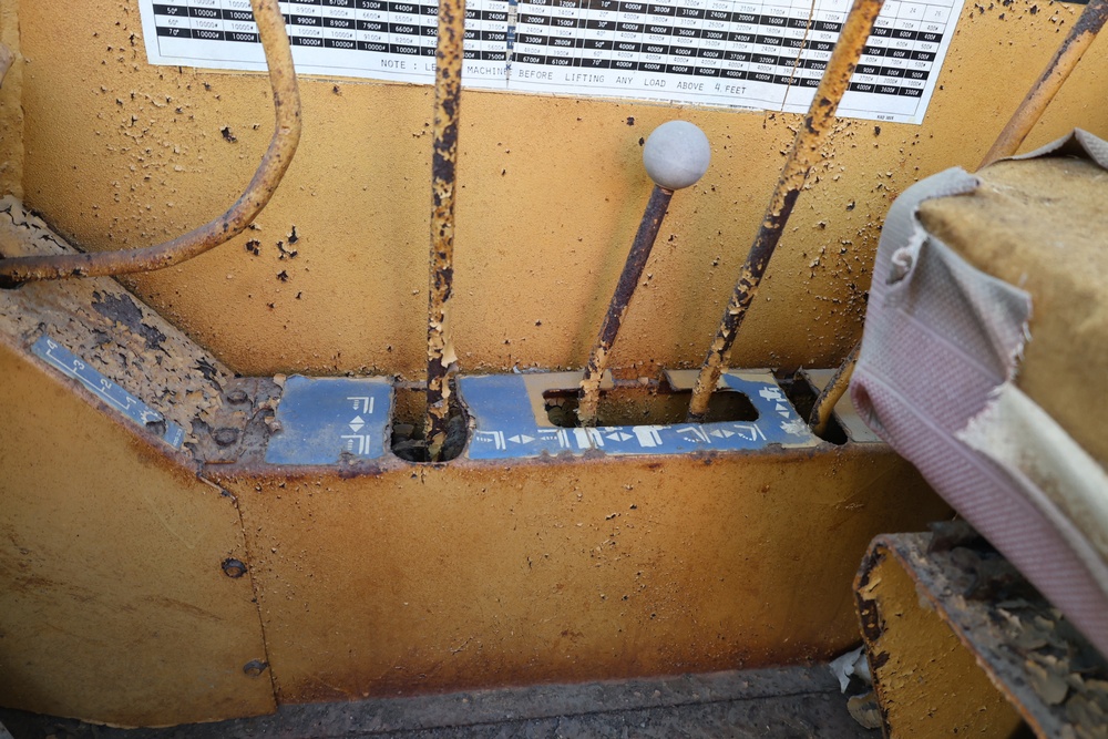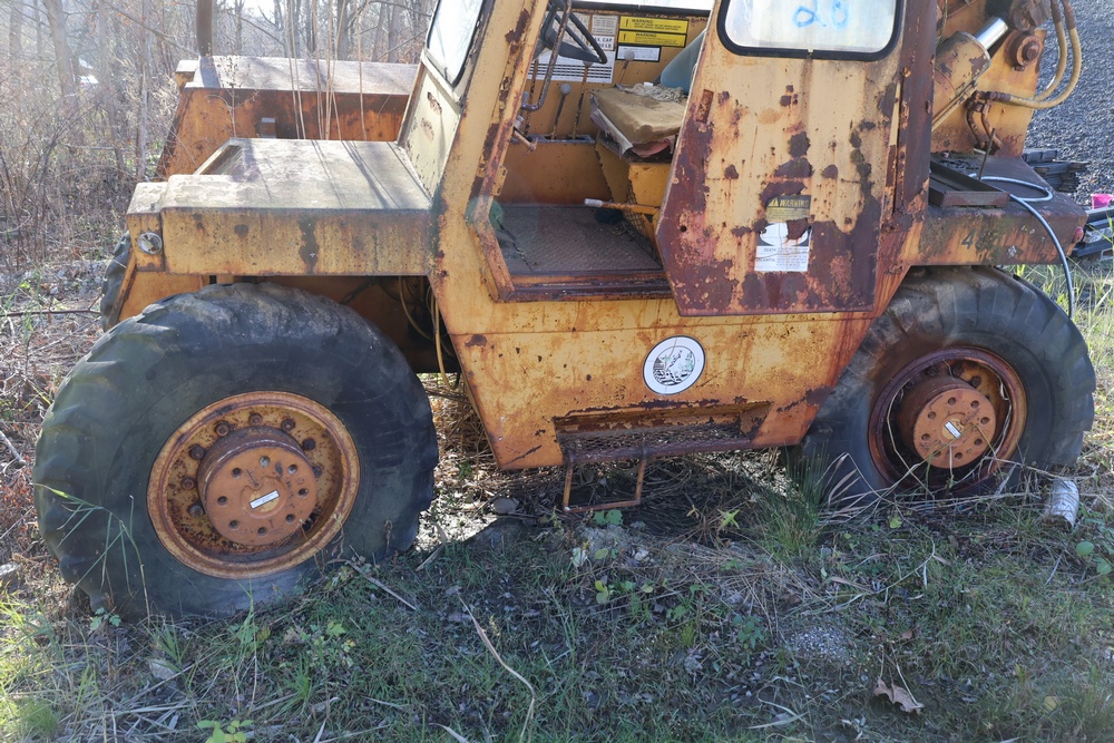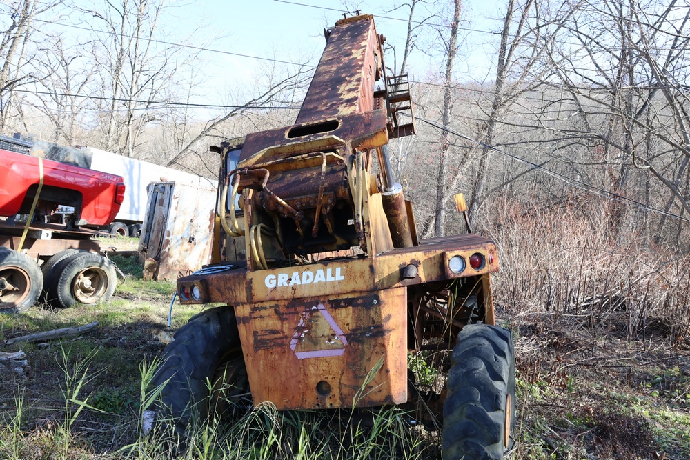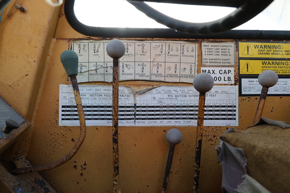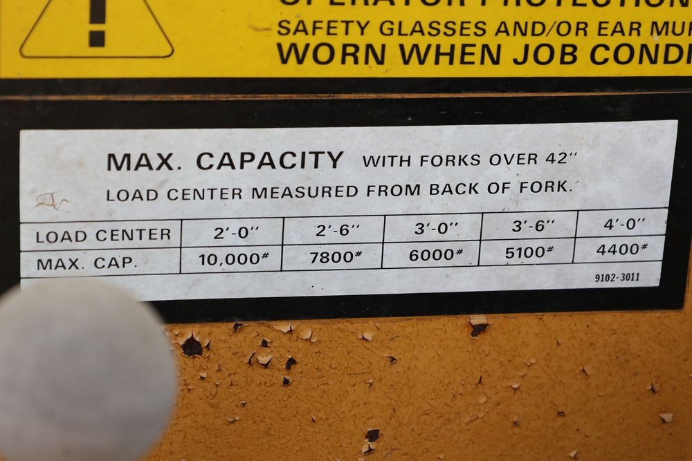 Gradall rough-terrain telescopic material handler with enclosed cab and fork attachment. Hour meter shows 4511 hours. Features include 453 Detroit engine, articulating telescopic boom, hydraulic fork carriage, four large off-road tires, rear counterweight, cab-mounted fire extinguisher, multi-lever hydraulic control bank, and posted lift-capacity charts indicating a maximum capacity of 10,000 lb. (with forks over 42", load center 2 ft). Capacity charts for various boom angles and extensions are present inside the cab. No serial number or model number visible. Likely for parts or repair, unknown if operational ran when parked 6 years ago. Machine assistance will be available at the time of pickup.