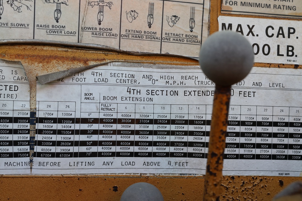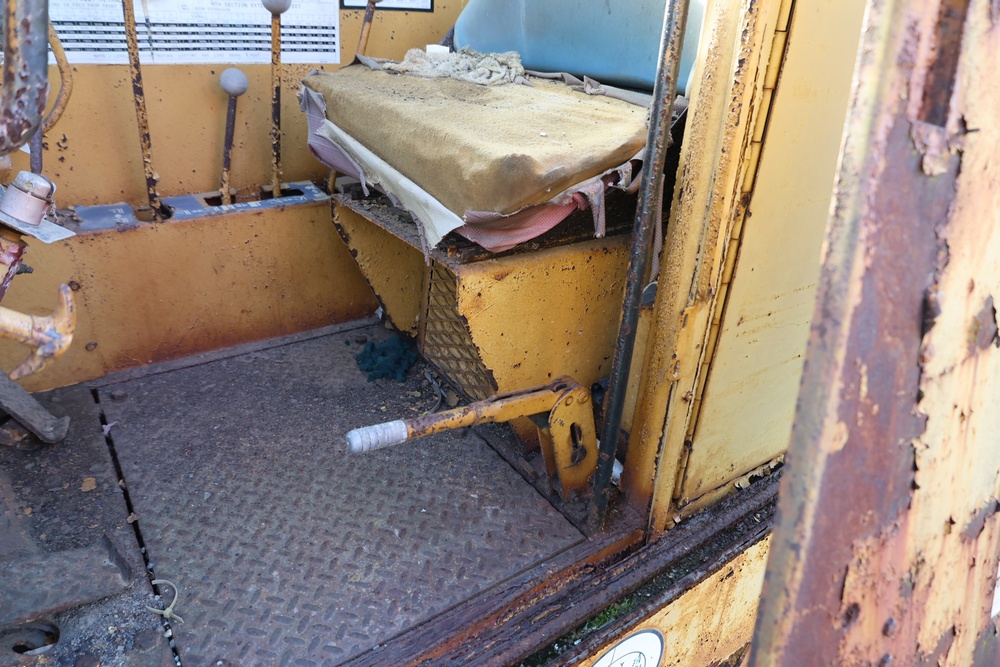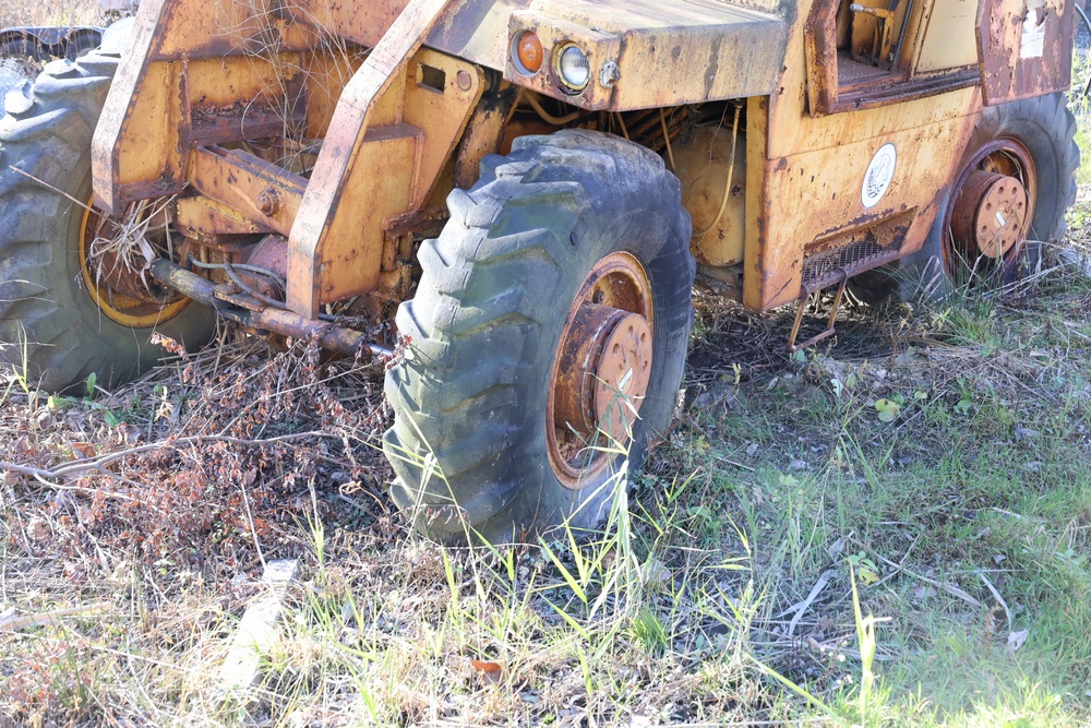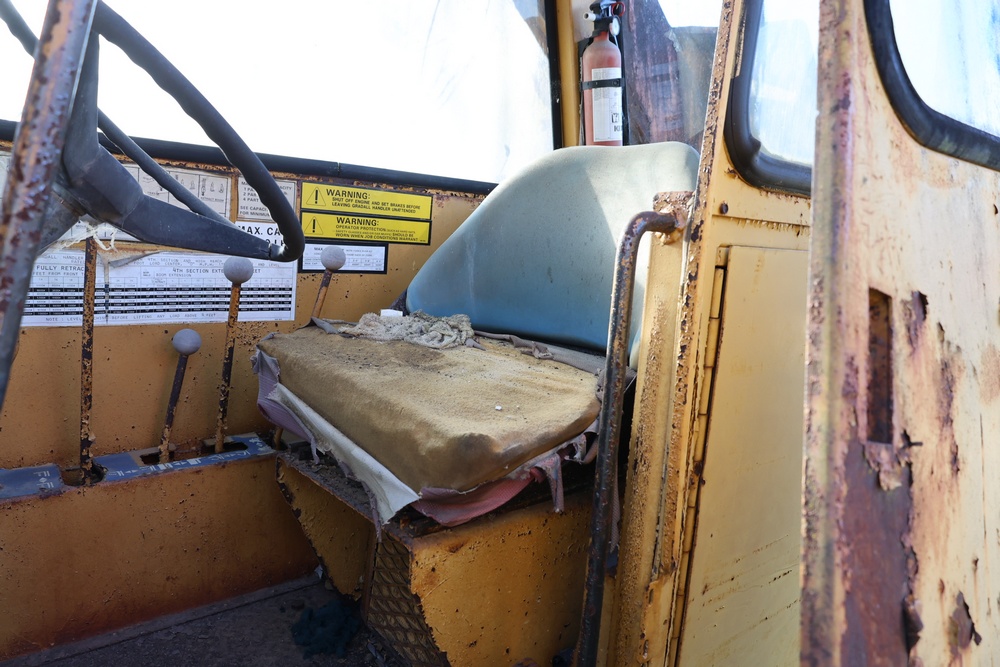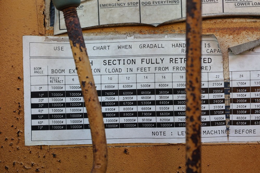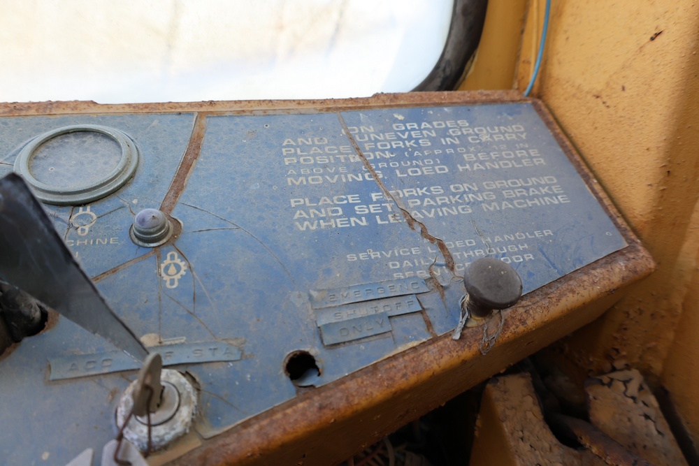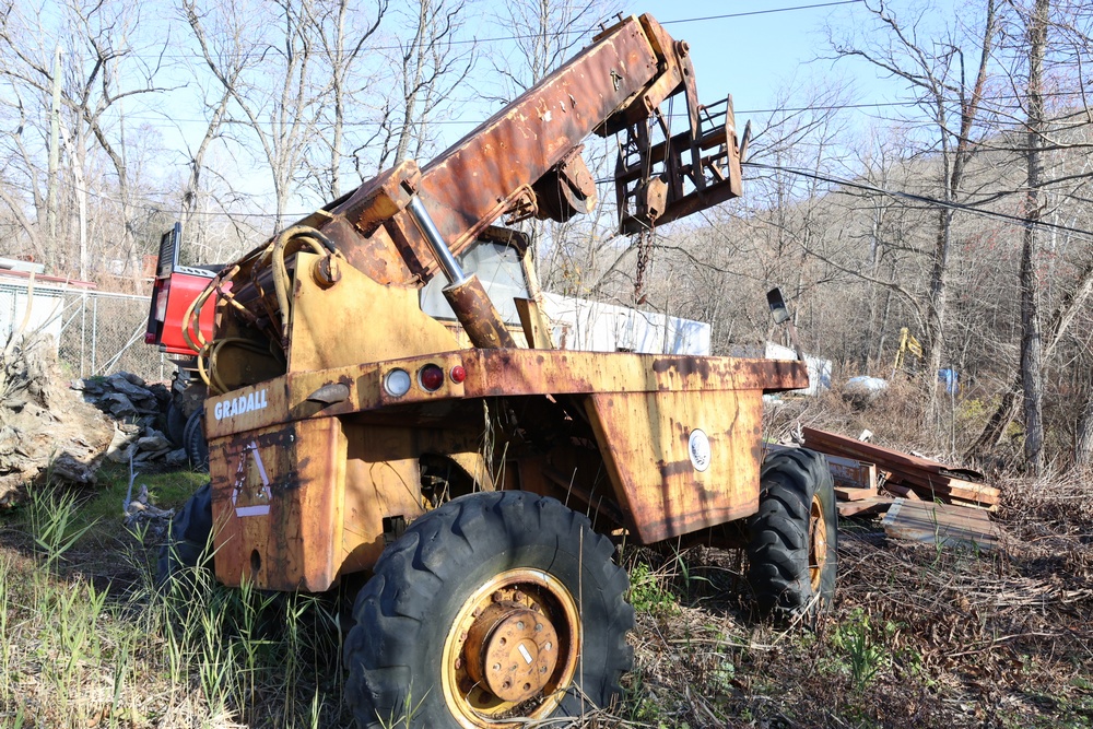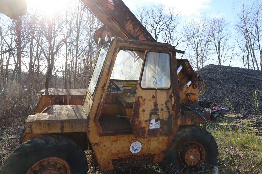 Gradall rough-terrain telescopic material handler with enclosed cab and fork attachment. Hour meter shows 4511 hours. Features include 453 Detroit engine, articulating telescopic boom, hydraulic fork carriage, four large off-road tires, rear counterweight, cab-mounted fire extinguisher, multi-lever hydraulic control bank, and posted lift-capacity charts indicating a maximum capacity of 10,000 lb. (with forks over 42", load center 2 ft). Capacity charts for various boom angles and extensions are present inside the cab. No serial number or model number visible. Likely for parts or repair, unknown if operational ran when parked 6 years ago. Machine assistance will be available at the time of pickup.