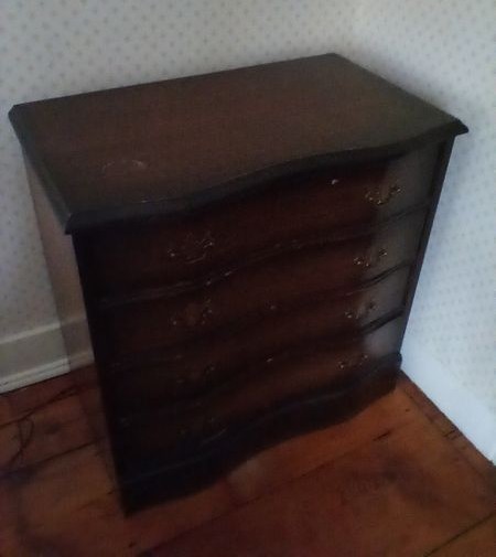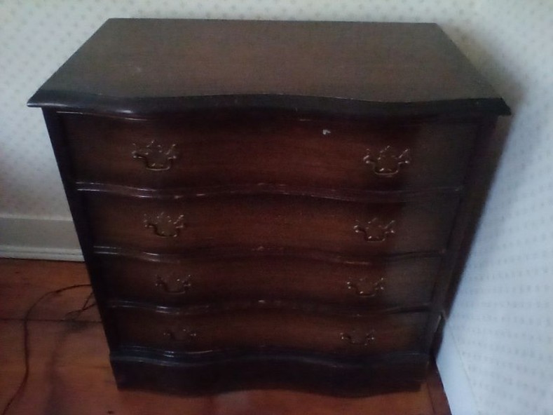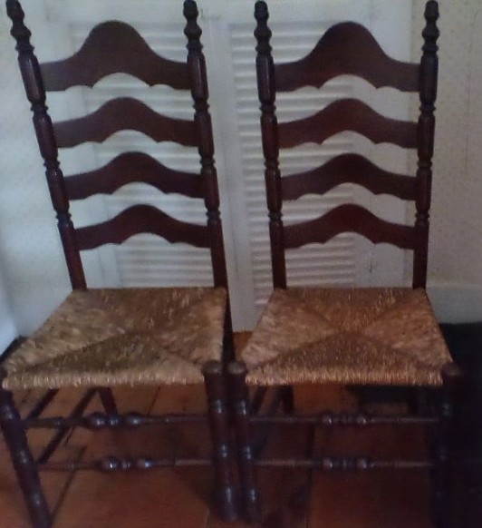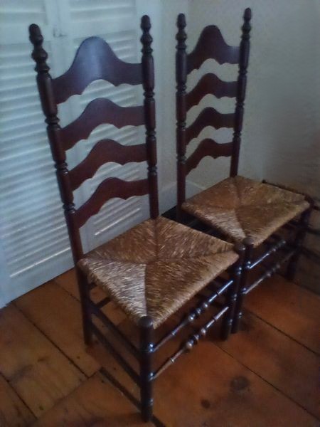 Small Chest, Ladderback Chairs. Four dovetailed-drawer chest with original HW, 29"Wx17"Dx30"H; pr ladderback wood chairs with rush seats, ea. 20"Wx16"Dx46"H; matches chairs in lot #6. Loc on 2nd fl.