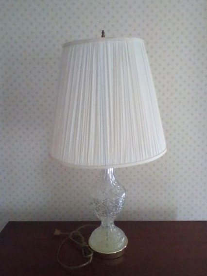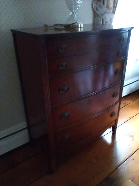 Bow Front Dresser, Lamp. Bow front four dovetailed-drawer chest with original HW, 3'Wx20.5"Dx46"H; crystal lamp, 29"H with pleated shade. Loc on 2nd fl.