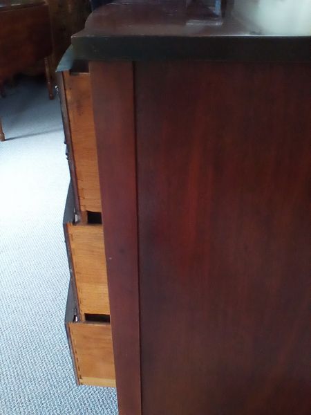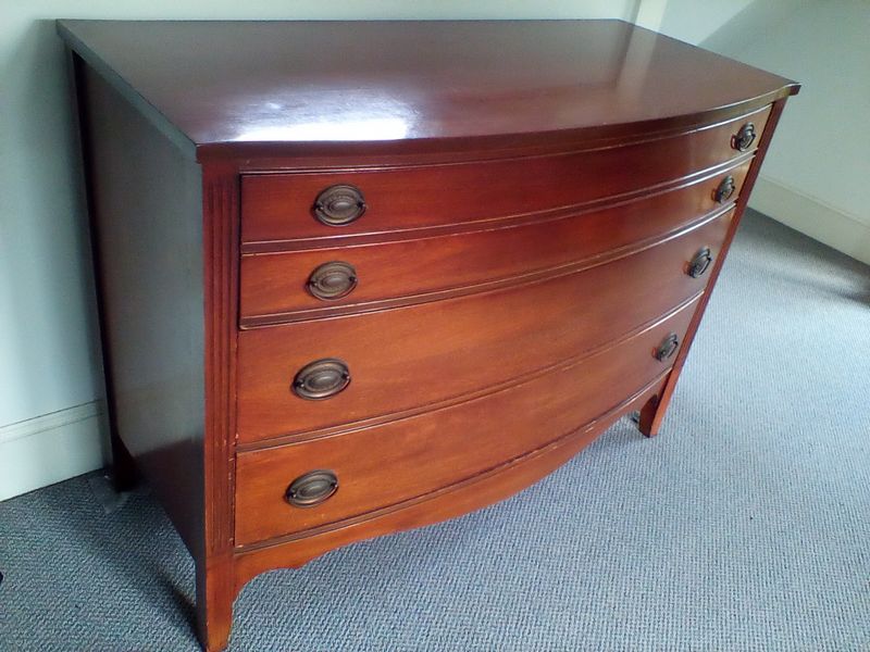 Vintage Bow Front Dresser. Vintage three dovetailed-drawer dresser with original HW, 46"'Wx21"Dx34"H. Loc on 3rd fl.