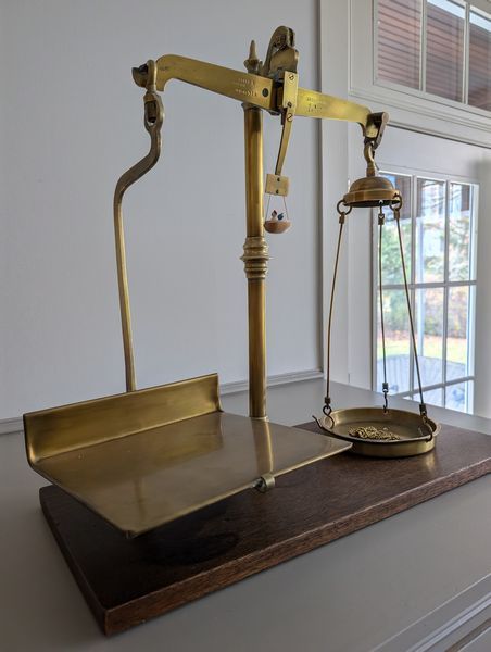 items include Beatrix Potter collectibles; Paymaster antique adding machine, series x550 with cover; antique iron bed; ladder back chairs; Avakian Bros. antique area rug; set of Hitchcock-style side chairs; Degrave & Co. 1917 antique brass scale; antique wicker bench; dog washing station; Graco Pack n' Playu; exercise machines: Soloflex & BowFlex TreadClimber; vintage bow front dresser; fireplace tools; Theodore Haviland "Rosalinde" dish set; Weber charcoal grill; Lenox Holiday plate & more. Items are located in Madison, CT.