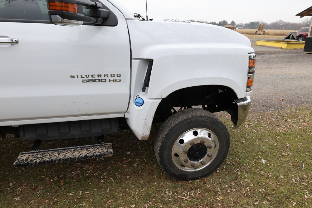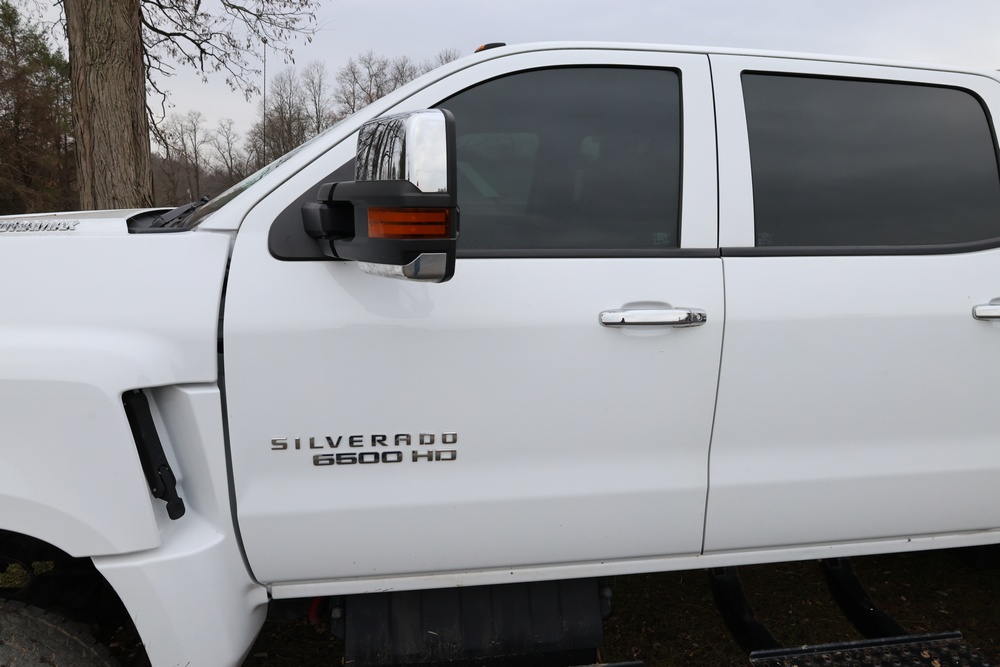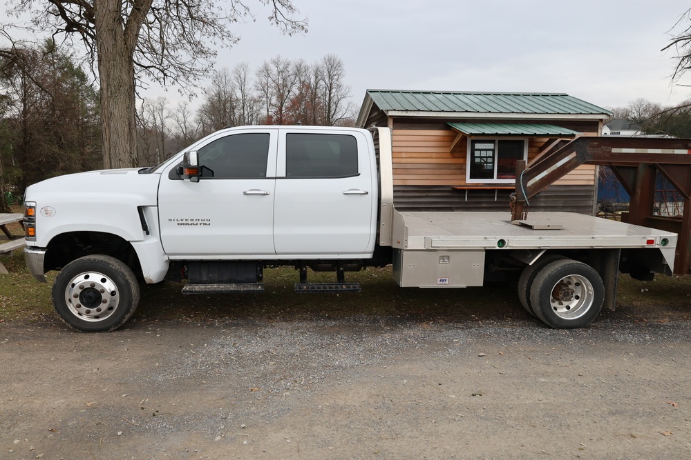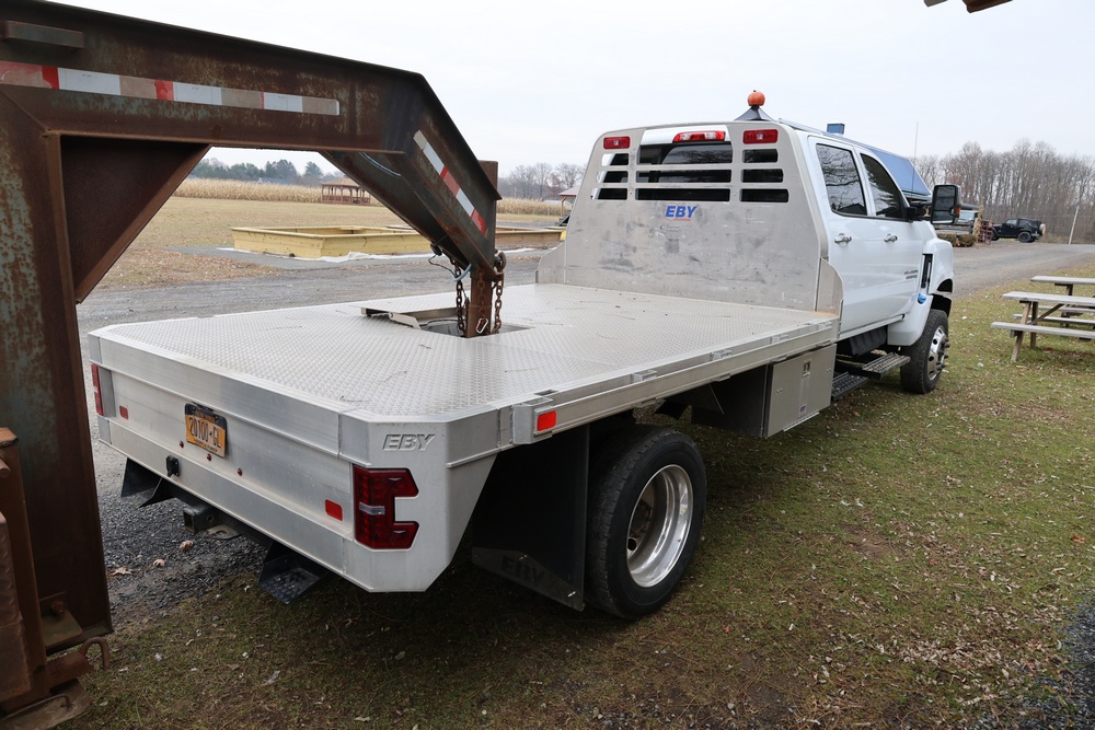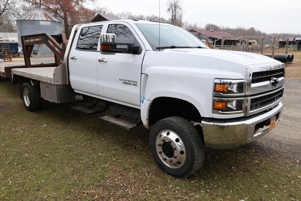 2022 Chevrolet Silverado 6500HD crew-cab flatbed truck. VIN: 1HTKJPVM6NH510164. Engine: 6.6L diesel, automatic transmission, 4WD. Odometer reading: 33617 miles. Features include dual rear wheels, aluminum Eby flatbed, running boards, touchscreen audio display. Runs and drives. Title and key available. NOTE: This item has a lien which will be satisfied upon payment for purchase in the auction. The vehicle(s) listed in this event will have the lien and title released upon payment directly to the secured creditor once paid for by the purchaser.