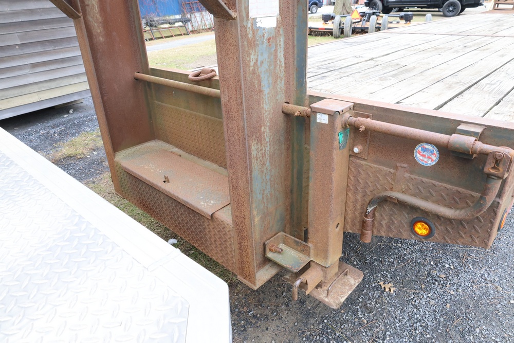 2003 Rolls Rite 35' gooseneck equipment trailer. VIN: 1R9GD35263M356296. GVWR listed as 25,000 lb on trailer markings. Tandem dual-wheel axle configuration with electric brakes visible. Features a wood deck, steel beavertail, flip-up loading ramps, stake pockets along the deck, gooseneck hitch, and 7-pin electrical connector. Manufacturer’s ID plate shows GAWR values of 10,000 lb front and 10,000 lb rear.