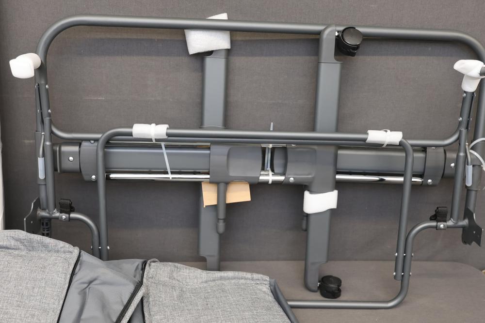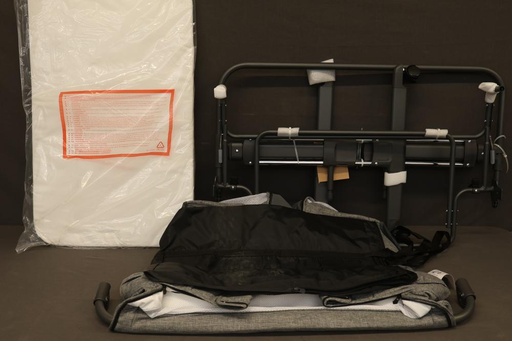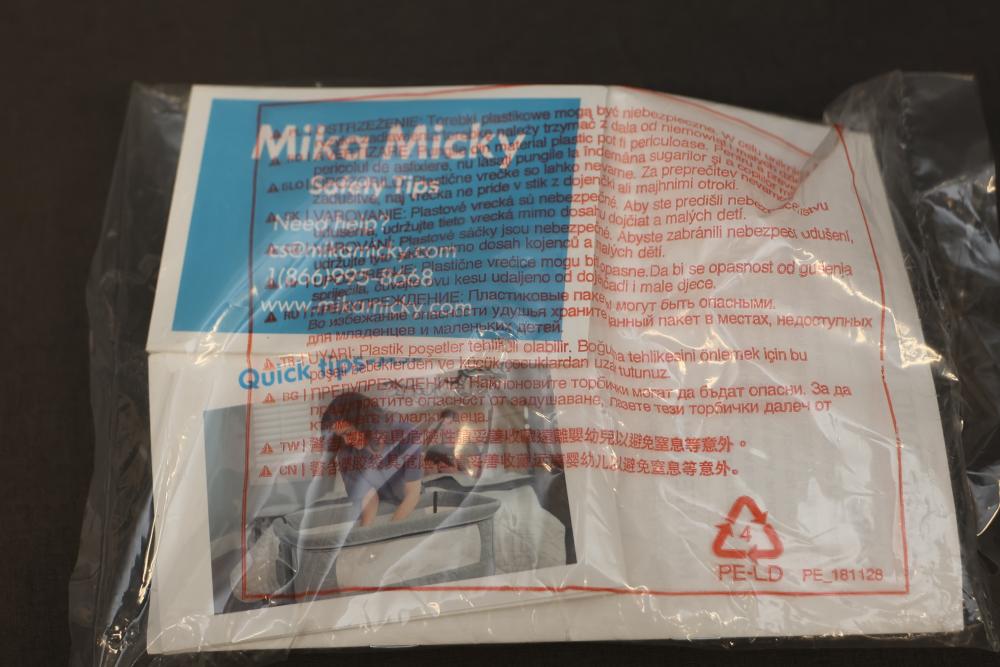 Mika Micky Bedside Sleeper with Accessories. Includes bedside sleeper frame, mattress, and packaging contents. Designed for convenient attachment to a bed, featuring adjustable height and castor wheels. Appears to include original components and instruction manual. Pickup only.