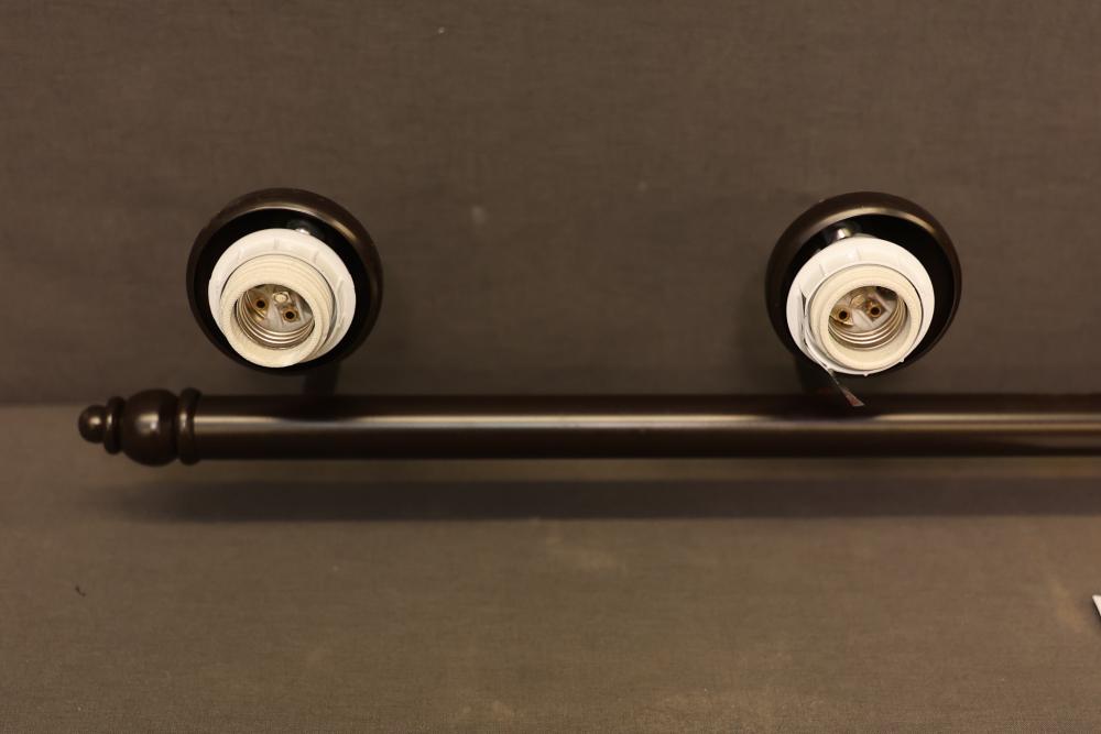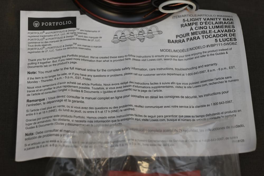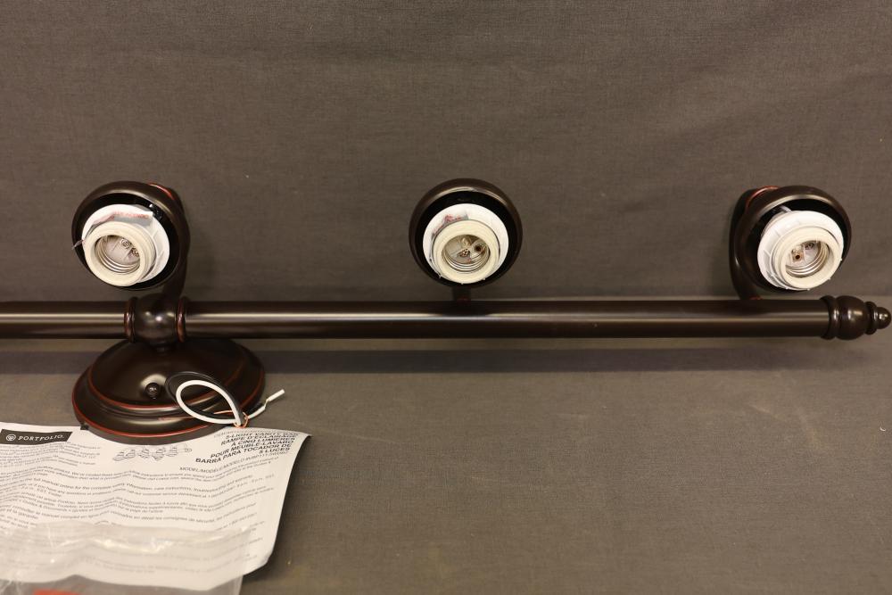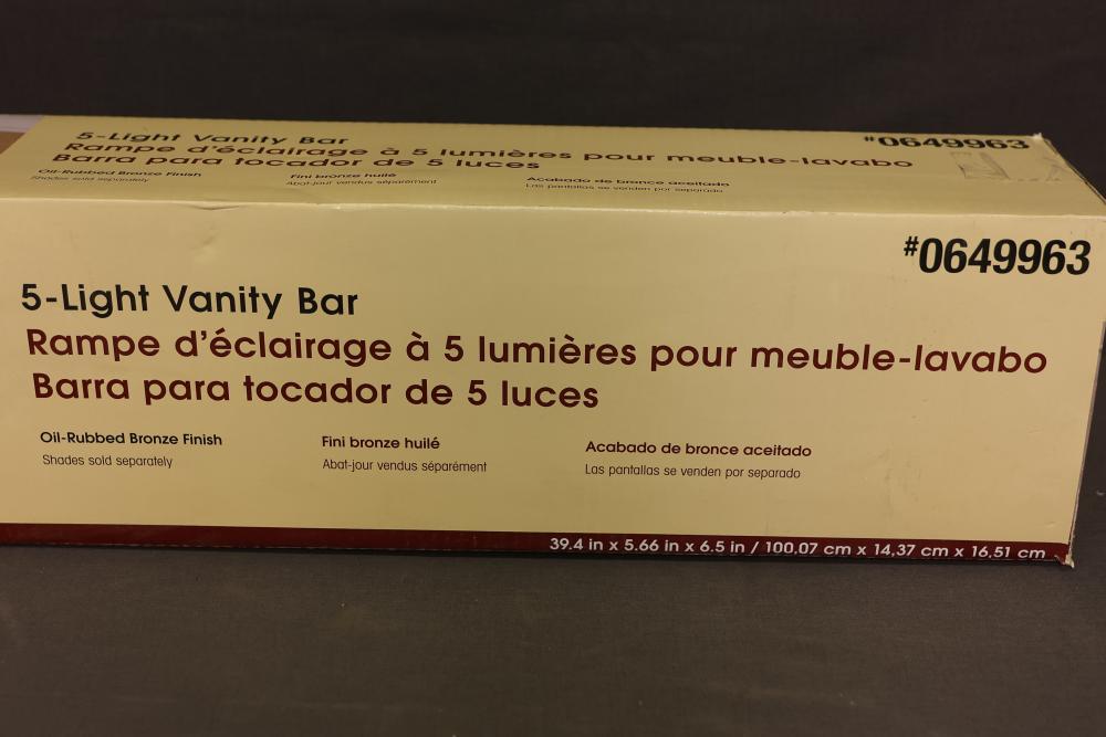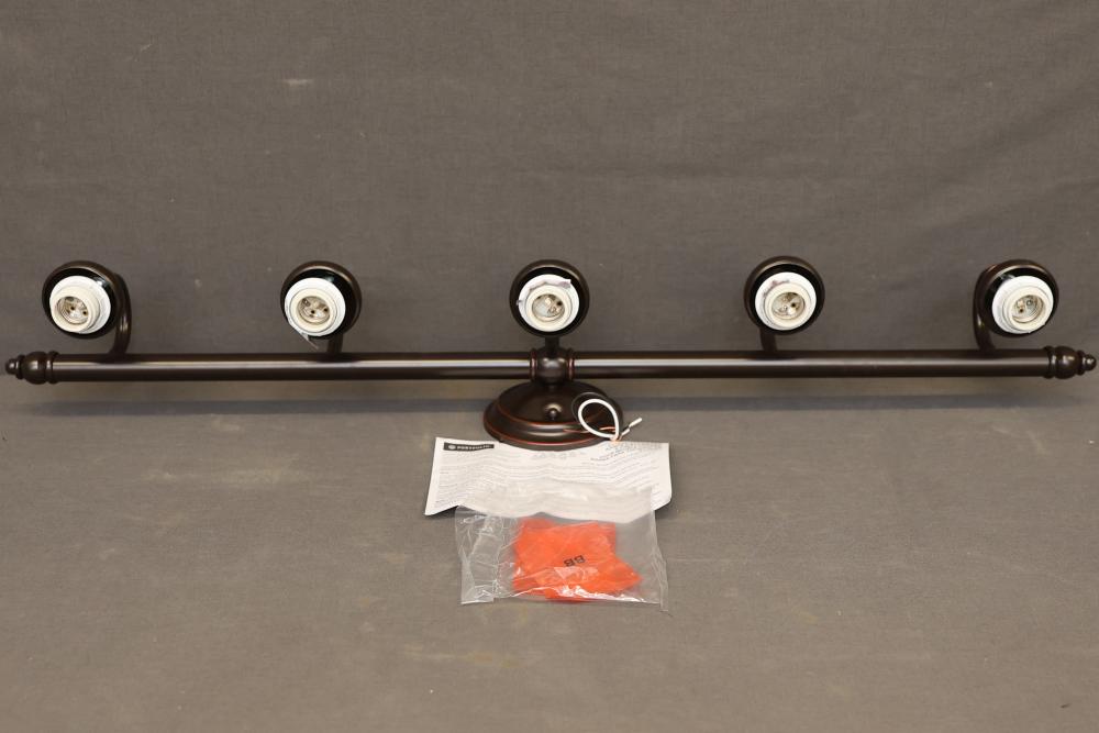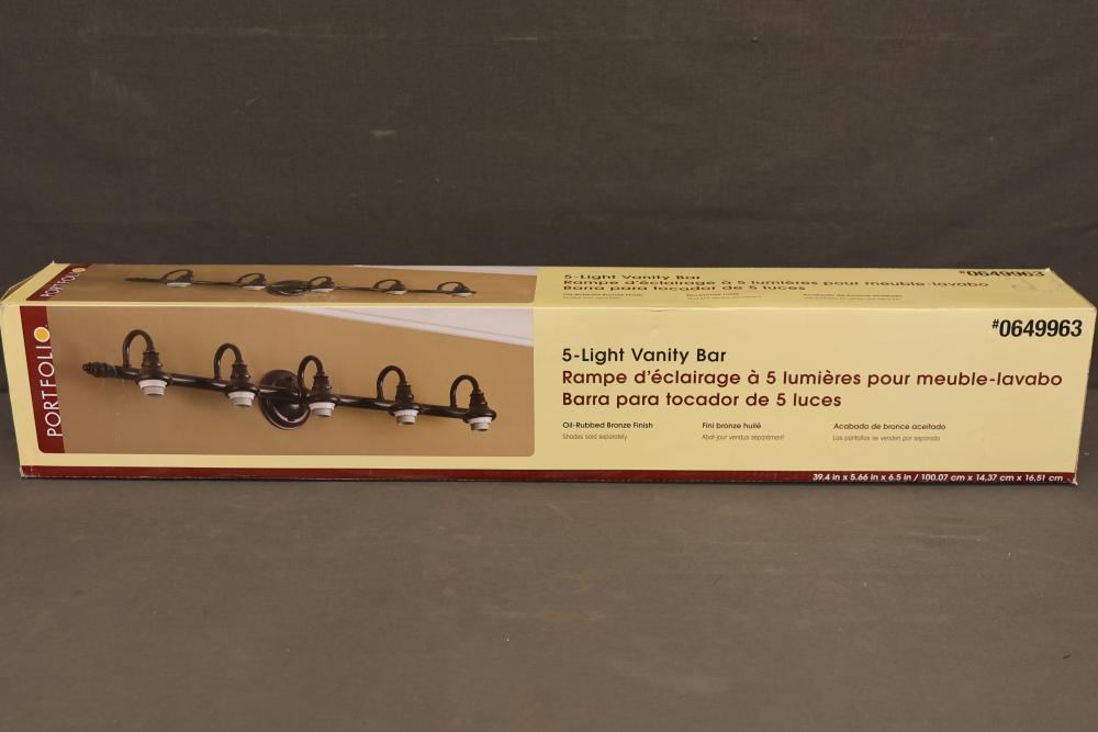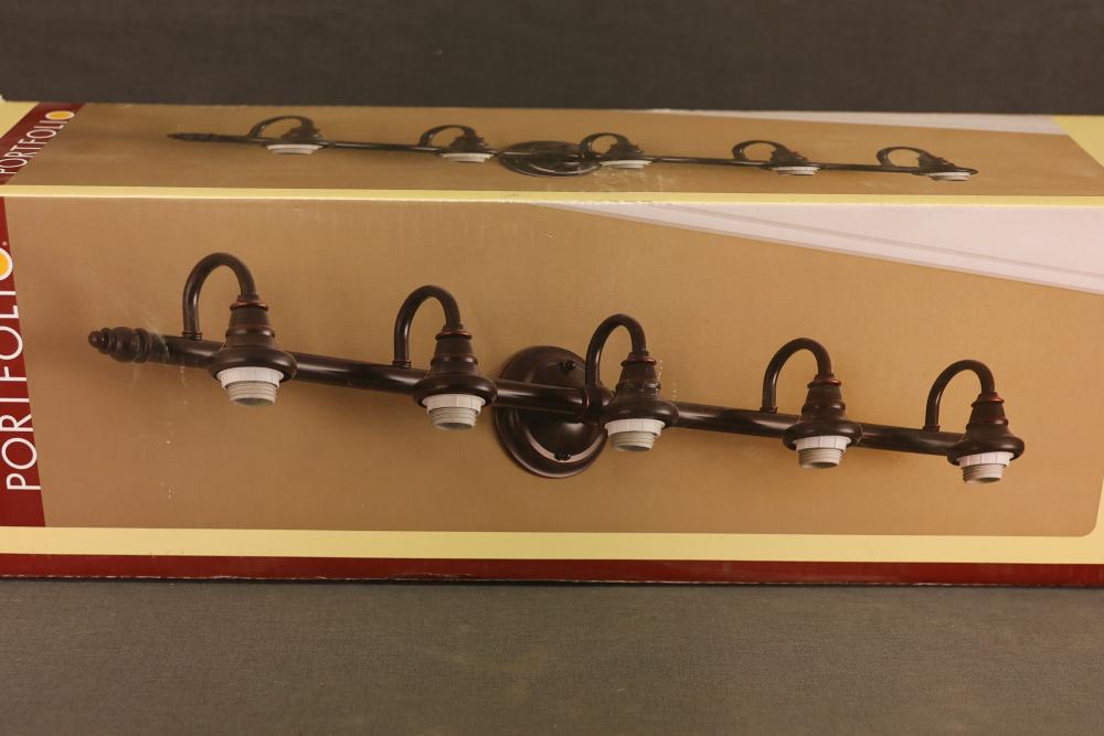 Portfolio 5-Light Vanity Bar-Shades Sold Separately. Features an oil-rubbed bronze finish and includes wiring components for installation. Measures 39.4 in x 5.66 in x 6.5 in. Shades are not included and are sold separately. Pickup only.
