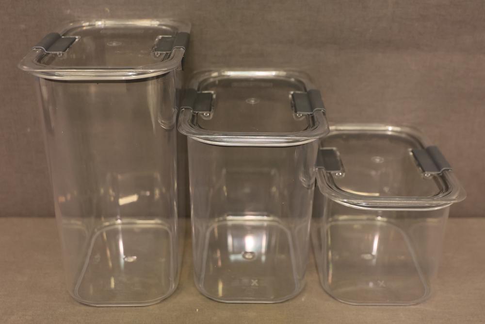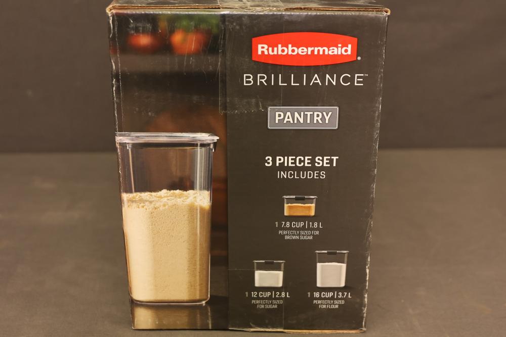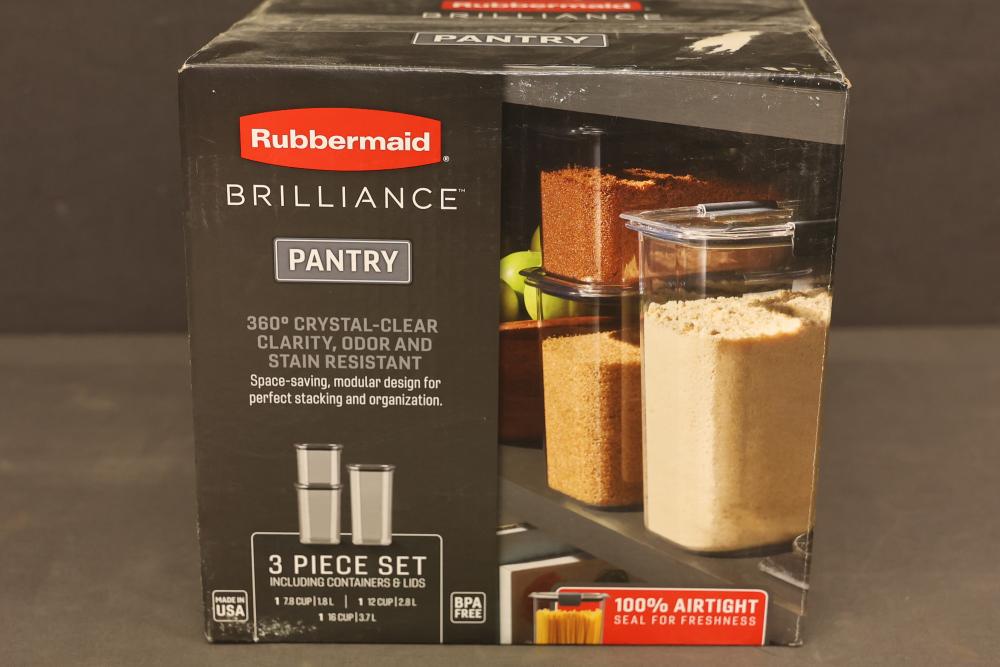 Rubbermaid Brilliance 3 Piece Pantry Set. Includes three crystal-clear pantry containers with lids: 7.8 cup (1.8 L), 12 cup (2.8 L), and 1.8 cup (0.5 L) capacities. Features an airtight seal, stain resistance, and space-saving modular design for optimal stacking and storage. BPA-free material ensures safe use. Pickup only.