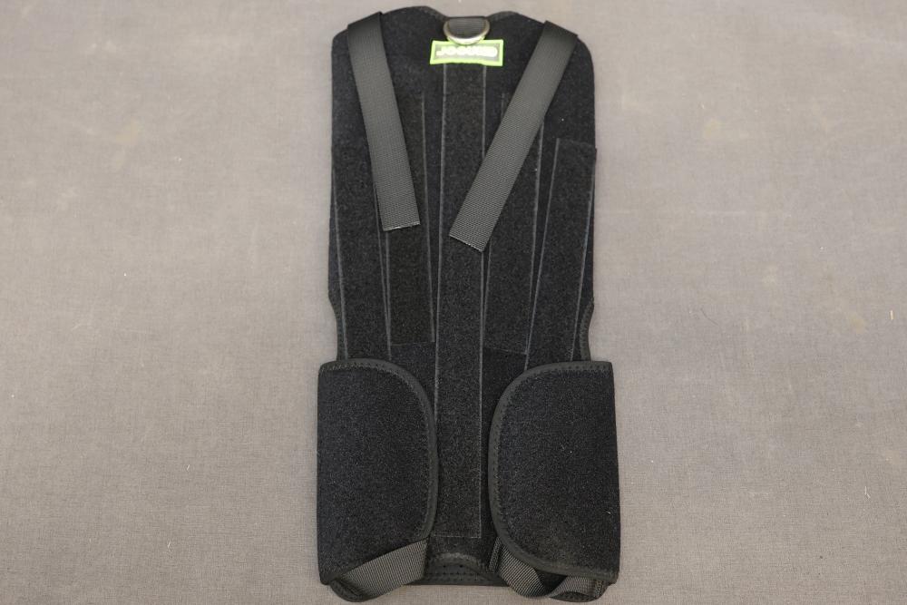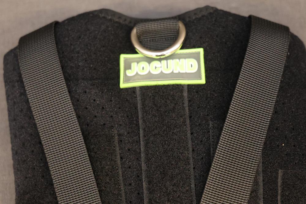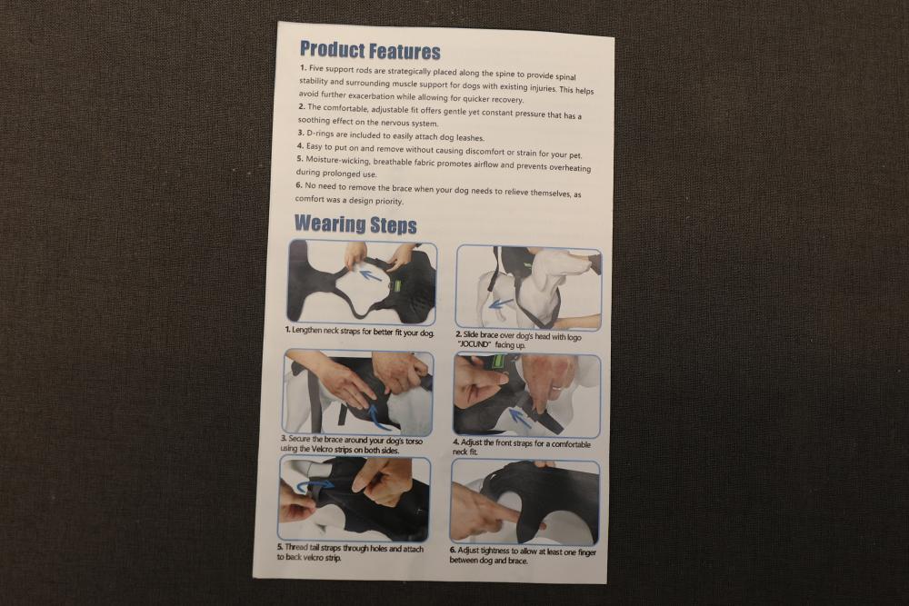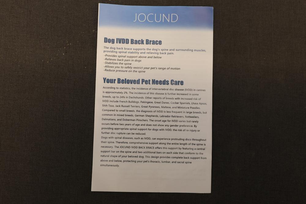 Jocund Dog IVDD Back Brace designed to aid dogs with intervertebral disc disease and back issues. Constructed from durable and adjustable materials with straps for firm support and proper fit. Includes product manual with instructions and wearing steps for optimal functionality. Pickup only.