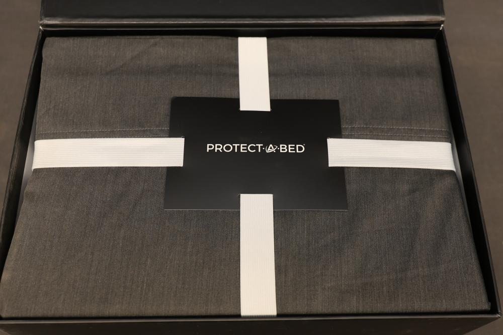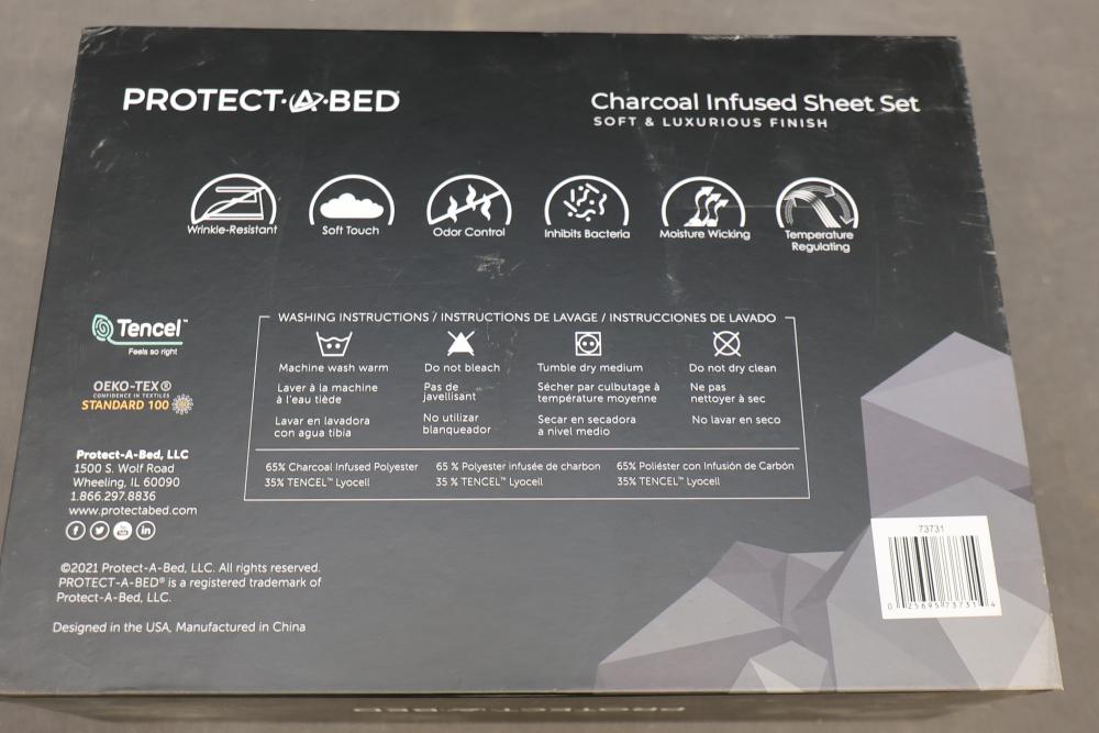 Protect-A-Bed King Size Charcoal Infused Sheet Set. Includes 1 fitted sheet (76 x 80 x 22 in), 1 flat sheet (118 x 110 in), and 2 pillowcases (21 x 37 in). Features soft-touch fabric, charcoal infusion for odor control, temperature regulation, and is OEKO-TEX Standard 100 certified. Water-resistant and machine washable. Pickup only.