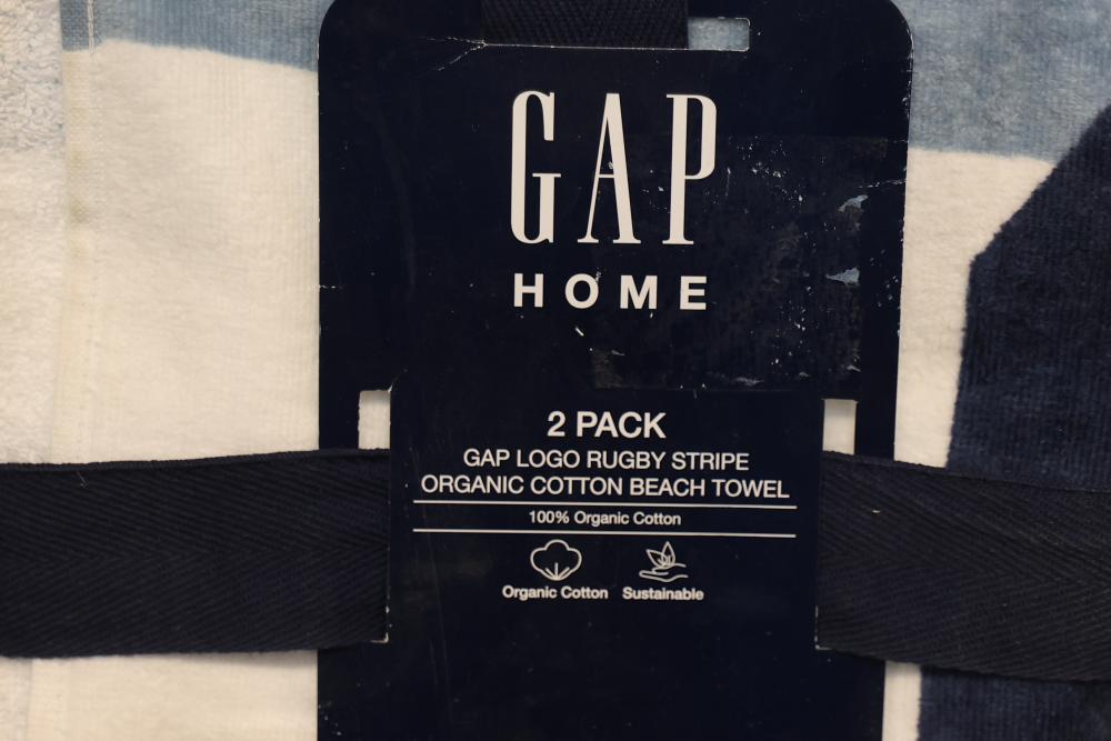 Gap Home Gap Logo Rugby Stripe Organic Cotton Beach Towel 2 Pack. Includes two beach towels made from 100 percent organic cotton with a rugby stripe design and the Gap logo. Features sustainable materials. Pickup only.