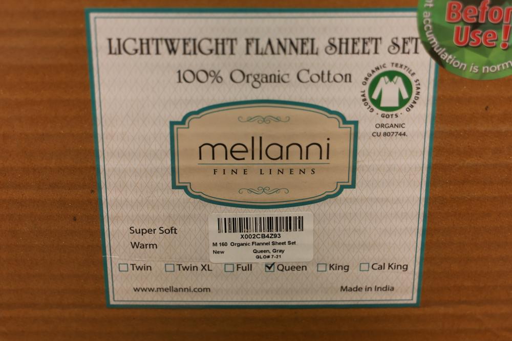 Mellani Organic Lightweight Flannel Sheet Set in Gray, Queen Size. Made from 100 percent organic cotton for a soft, warm, and comfortable feel. This set is designed for Queen Size beds. The sheet set is still in its original packaging, ensuring quality and cleanliness. Pickup only.