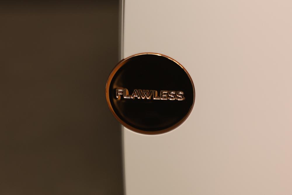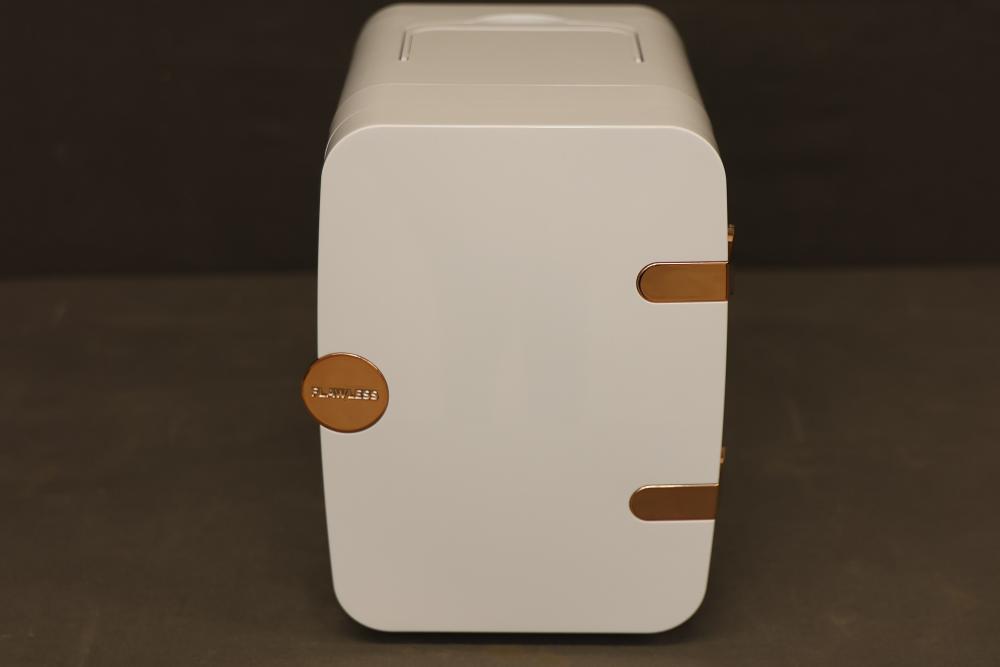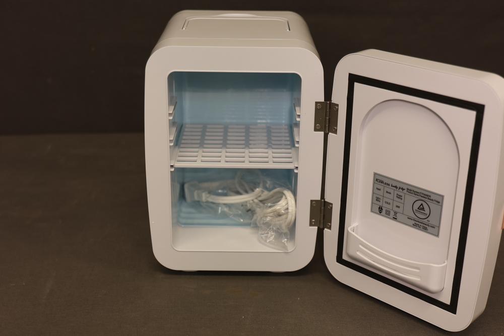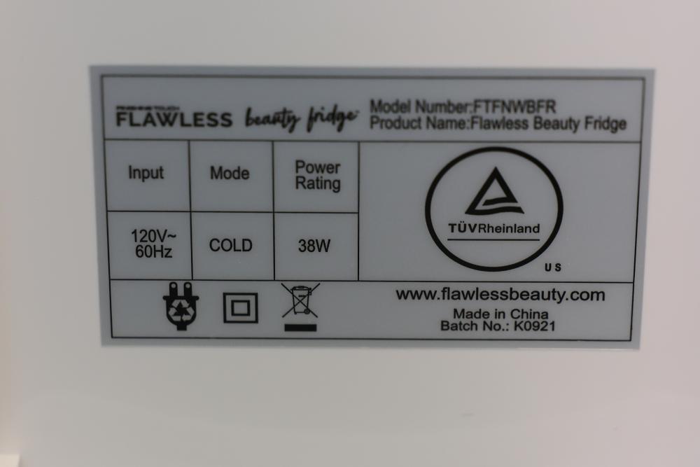 Finishing Touch Flawless Beauty Fridge Model FTFNWBFR. Compact mini design with dimensions suitable for cooling skincare essentials and beauty tools. Features a 120V input and 38W power rating. Includes a removable shelf and storage compartment inside. Ideal for cold storage of creams, serums, and masks. Pickup only.