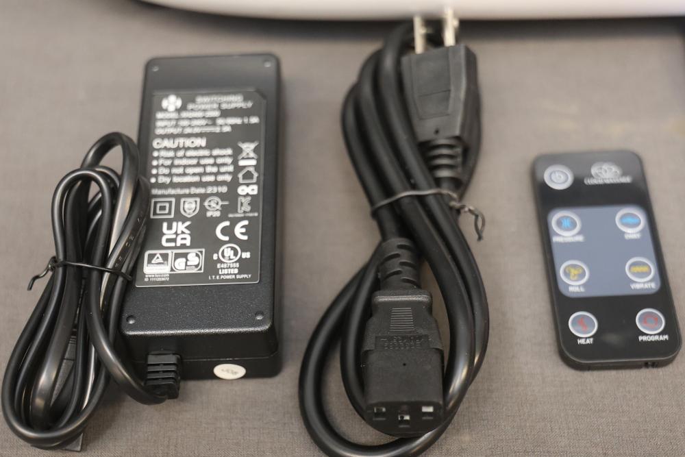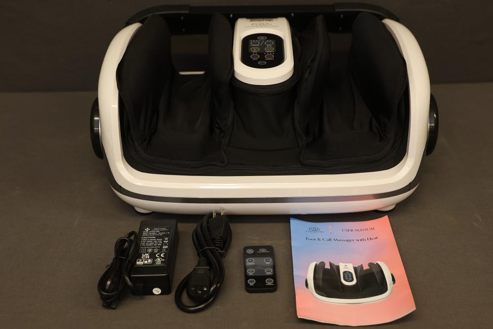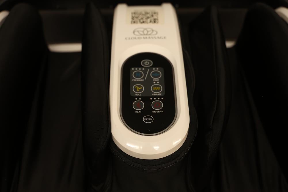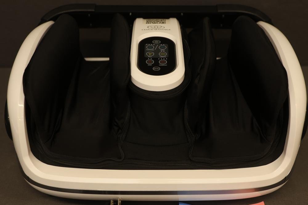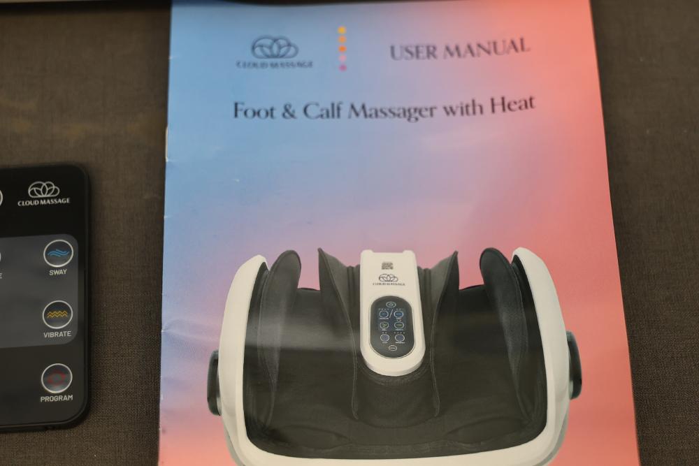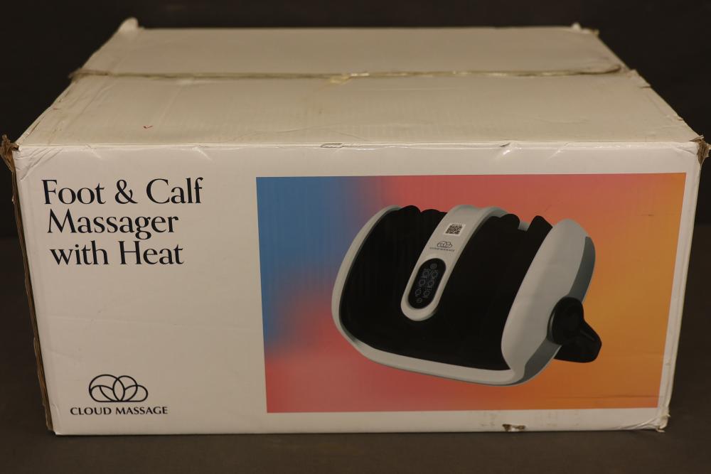 Cloud Massage Foot and Calf Massager with Heat. Includes massager unit, user manual, power adapter, and remote control. Features adjustable heat and pressure settings operated from an easy-to-use control panel. Item comes in its original packaging. Pickup only.