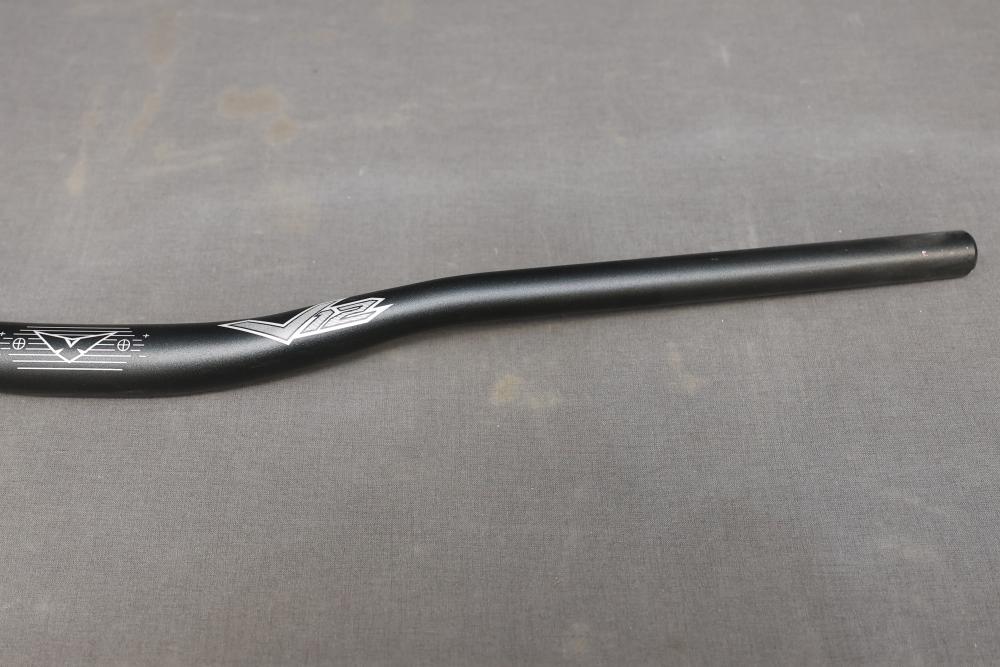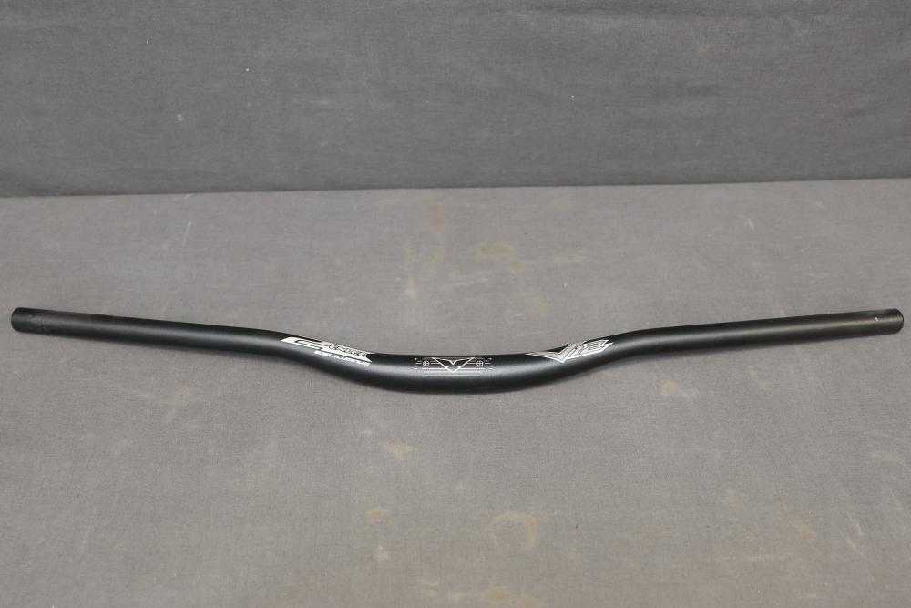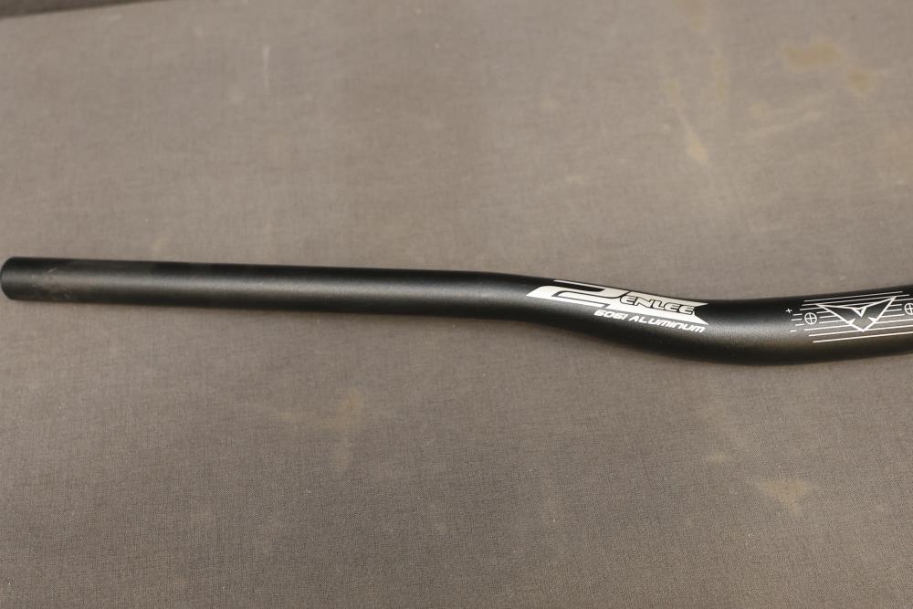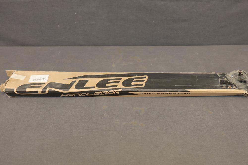 Enlee Aluminum Handlebar Model 6061. Made from durable aluminum with sleek black detailing and decorative etched graphics. Lightweight design, suitable for various cycling applications. The handlebar remains in its original packaging with minimal signs of wear. Pickup only.
