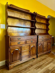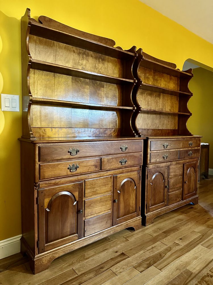 Early American style matching pair of solid cherry wood hutches. Detachable upper 3-shelf unit over 3 drawers and 2 enclosed storage shelves. Pegged joinery. Believed to be craftsman-made special order many years ago. These are solid, weighty pieces of furniture. Bring help to move. (L 42.5 x W 13.5 x H 70.5 each.)