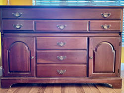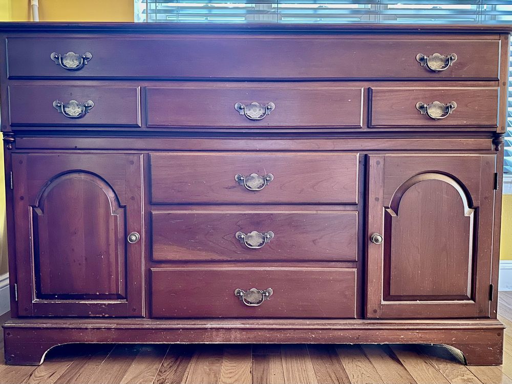Early American style sideboard / buffet solid cherry wood with 7 drawers and 2 storage shelves. Incl. built-in silverware drawer. Dovetail joinery. This is a weighty piece of furniture that will give your home many years of useful service. (L 53.5 x W 20 x H 36)