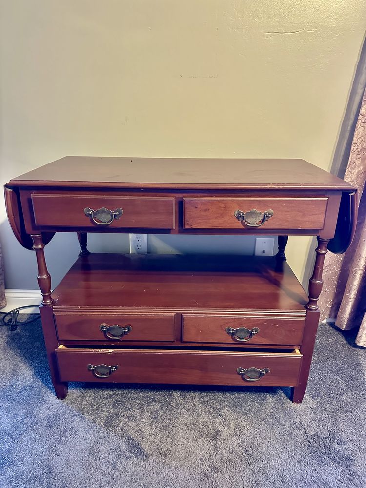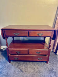 American Colonial-Revival style drop-leaf server/console (sometimes sold as a “sideboard server” or “sofa table with drawers”). Turned legs, batwing/Chippendale bail pulls, cherry/mahogany stain, drop leaves on both sides, machine-cut drawers, and a mix of drawers + open shelf. Solid wood that feels the heft of quality. (L 55.5 x W 18.5 x H 30)