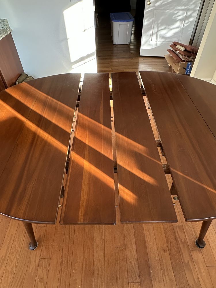 Vintage cherry drop-leaf dining table w/leaves, Queen Anne feet. 2 captain/4 side rush-seat chairs L 6’1” x W 54 1/4”