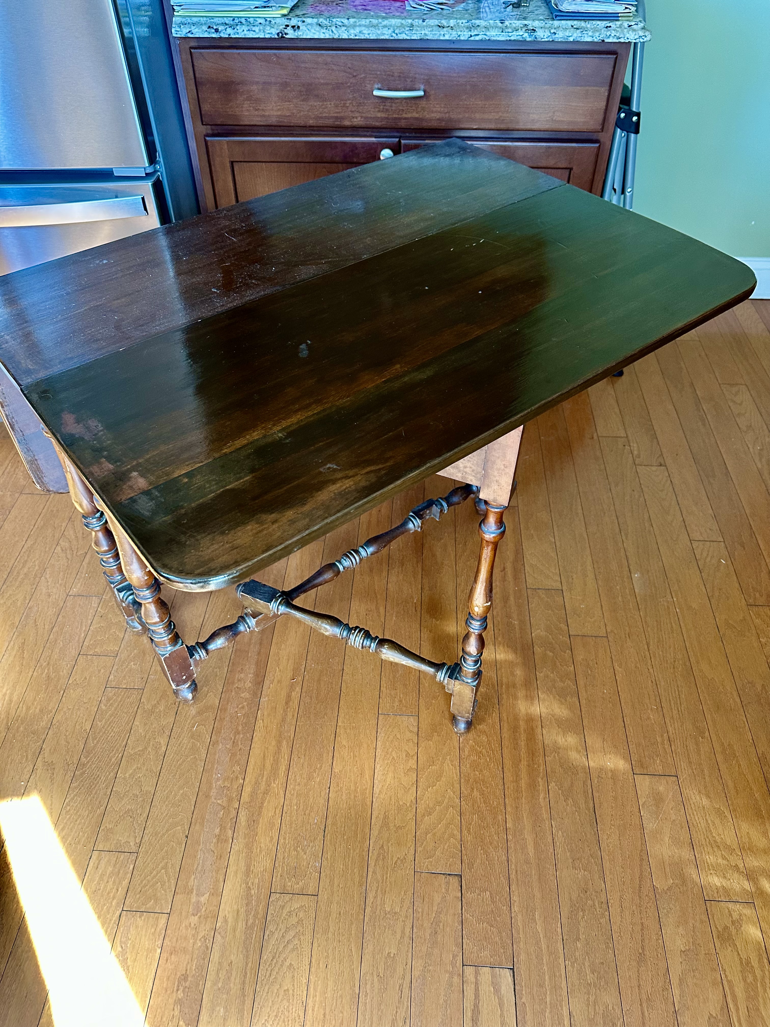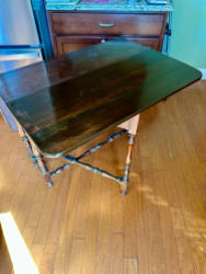 Early Revival / Queen Ann style Gate Leg Drop Leaf Table. Mahogany or mahogany finish. Turned legs and older vintage hardware. L 40.5 x H 30 x W 36