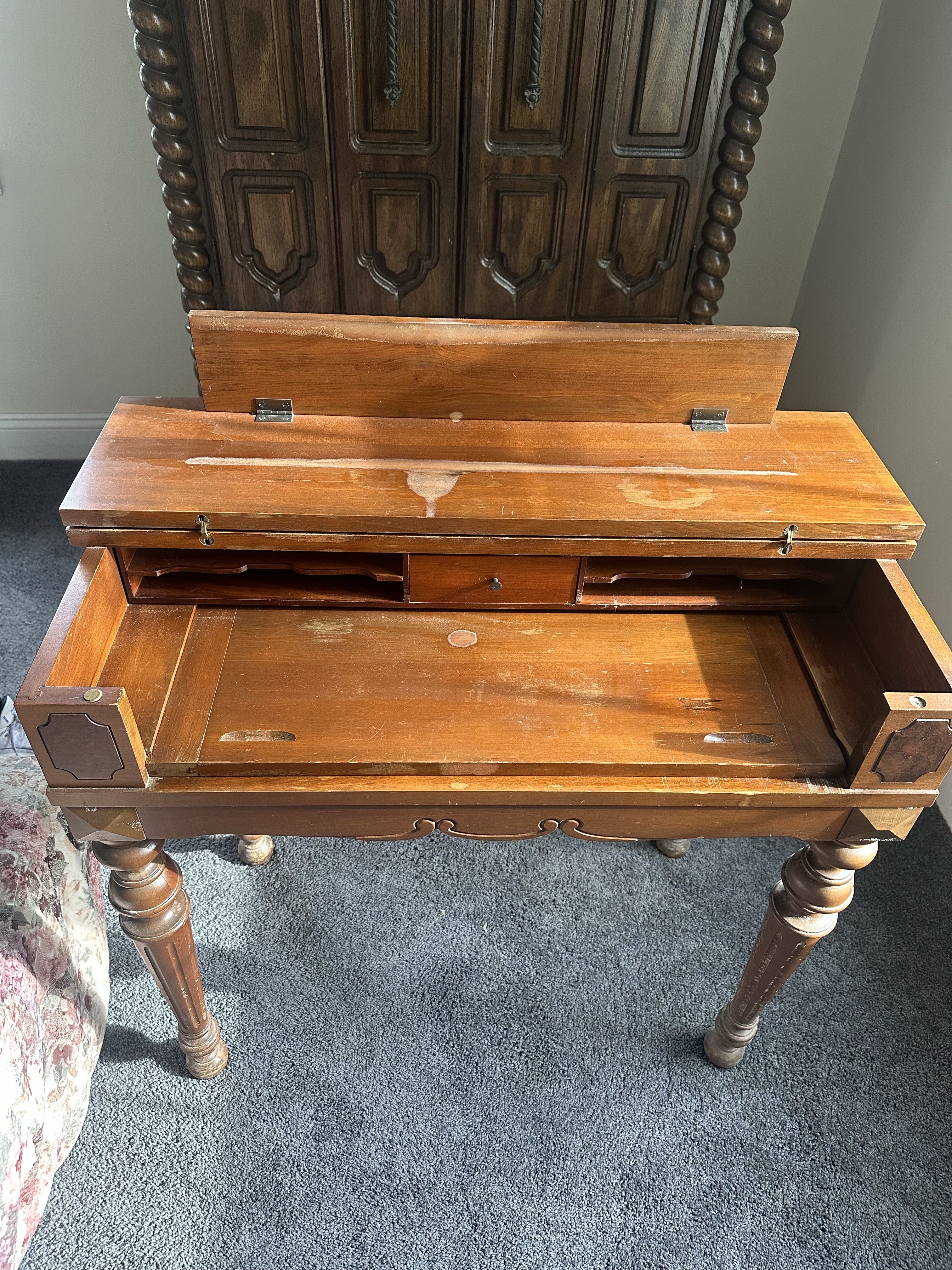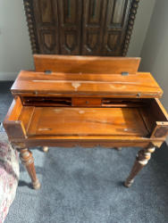 Flip-top writing desk with a w/pull-out writing surface and a single drawer. L 33 x W18 x H 31 Plus 2-drawer inlaid sewing stand. L 15.5 x W 13 x H 28