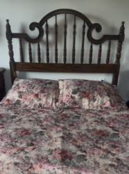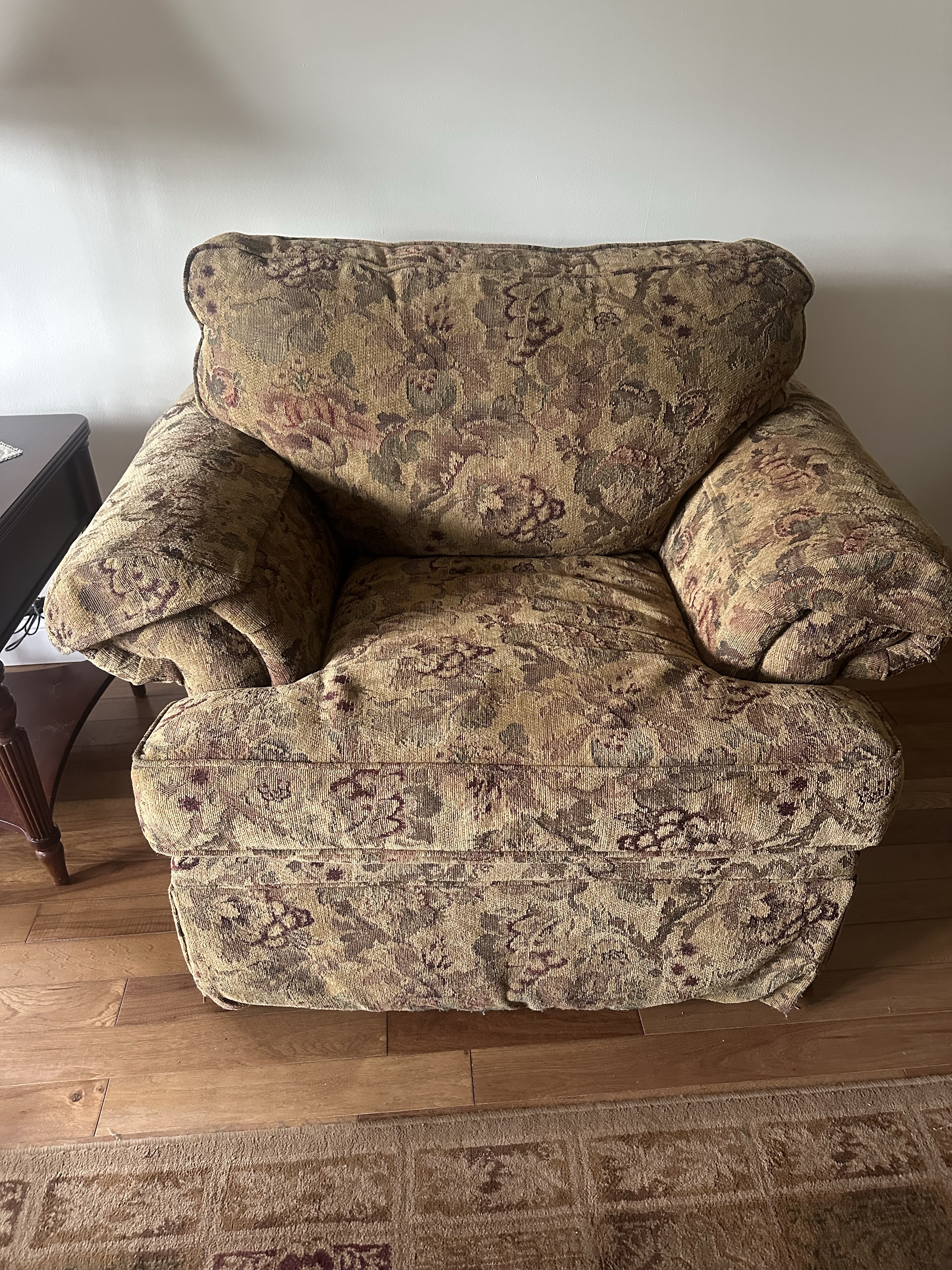 Tapestry sofa bed & loveseat. The sofa converts into a queen-size bed. Super comfortable. Sofa dimensions are approximately L 93 x D 37 x H 38. Loveseat dimensions areW 48 xD 37 x H 38. Basset Living Room End Table. Distressed finish. Appears to be cherry. D 25.5 x W 23 x H 25
